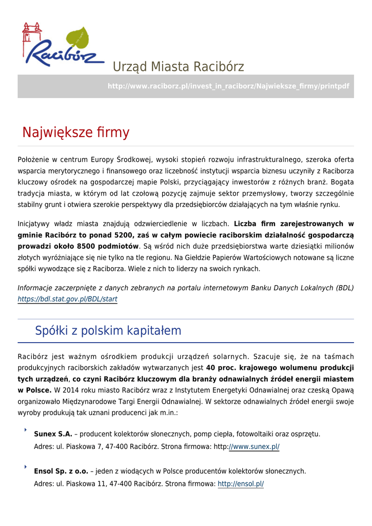 Urząd Miasta Racibórz http://www.raciborz.pl/invest_in_raciborz/Najwieksze_firmy/printpdf Największe firmy Położenie w centrum Europy Środkowej, wysoki stopień rozwoju infrastrukturalnego, szeroka oferta wsparcia merytorycznego i finansowego oraz liczebność instytucji wsparcia biznesu uczyniły z Raciborza kluczowy ośrodek na gospodarczej mapie Polski, przyciągający inwestorów z różnych branż. Bogata tradycja miasta, w którym od lat czołową pozycję zajmuje sektor przemysłowy, tworzy szczególnie stabilny grunt i otwiera szerokie perspektywy dla przedsiębiorców działających na tym właśnie rynku. Inicjatywy władz miasta znajdują odzwierciedlenie w liczbach. Liczba firm zarejestrowanych w gminie Racibórz to ponad 5200, zaś w całym powiecie raciborskim działalność gospodarczą prowadzi około 8500 podmiotów. Są wśród nich duże przedsiębiorstwa warte dziesiątki milionów złotych wyróżniające się nie tylko na tle regionu. Na Giełdzie Papierów Wartościowych notowane są liczne spółki wywodzące się z Raciborza. Wiele z nich to liderzy na swoich rynkach. Informacje zaczerpnięte z danych zebranych na portalu internetowym Banku Danych Lokalnych (BDL) https://bdl.stat.gov.pl/BDL/start Spółki z polskim kapitałem Racibórz jest ważnym ośrodkiem produkcji urządzeń solarnych. Szacuje się, że na taśmach produkcyjnych raciborskich zakładów wytwarzanych jest 40 proc. krajowego wolumenu produkcji tych urządzeń, co czyni Racibórz kluczowym dla branży odnawialnych źródeł energii miastem w Polsce. W 2014 roku miasto Racibórz wraz z Instytutem Energetyki Odnawialnej oraz czeską Opawą organizowało Międzynarodowe Targi Energii Odnawialnej. W sektorze odnawialnych źródeł energii swoje wyroby produkują tak uznani producenci jak m.in.: Sunex S.A. – producent kolektorów słonecznych, pomp ciepła, fotowoltaiki oraz osprzętu. Adres: ul. Piaskowa 7, 47-400 Racibórz. Strona firmowa: http://www.sunex.pl/ Ensol Sp. z o.o. – jeden z wiodących w Polsce producentów kolektorów słonecznych. Adres: ul. Piaskowa 11, 47-400 Racibórz. Strona firmowa: http://ensol.pl/ Z innych firm prowadzących z sukcesami działalność gospodarczą w Raciborzu należy wymienić: Koltech Sp. z o.o. – projektowanie i produkcja maszyn, nowoczesne systemy PLM. Adres: ul. K. Malczewskiego 1, 47-400 Racibórz. Strona firmowa: http://www.koltech.com.pl/ Rameta Spółdzielnia Meblarska ZPChr. – spółdzielnia meblarska, producent mebli tapicerowanych. Adres: ul. Królewska 50, 47-400 Racibórz. Strona firmowa: http://www.rameta.com.pl/ PPH Ramex Sp. z o.o. – przedsiębiorstwo produkcyjno-handlowe; firma wchodzi w skład Rameta Spółdzielnia Meblarska ZPCh. Adres: ul. Królewska 50, 47-400 Racibórz. Strona firmowa: http://ramex.rameta.com.pl/ Hermon Czech & Muzia Sp. J. – jedna z najszybciej rozwijających się w kraju firm produkujących części zamienne do ciągników, maszyn rolniczych, samochodów ciężarowych, naczep i autobusów oraz akcesoriów, narzędzi i pasów transportowych. Adres: ul. Grzonki 5, 47-400 Racibórz. Strona firmowa: http://hermon.com.pl/ Chempest S.A. – przedsiębiorstwo zaopatrzenia rolnictwa; w ofercie znajdują się produkty do ochrony roślin, maszyny, nawozy i nasiona rolnicze, produkty paszowe i wiele innych. Adres: ul. Łąkowa 24, 47-400 Racibórz. Strona firmowa: http://www.chempest.com.pl/ Agromax Sp. z o.o. – przedsiębiorstwo rolno-przemysłowe, uhonorowane w 2014 roku przez Raciborską Izbę Gospodarczą Złotą Odznaką za Zasługi dla Województwa Śląskiego. Adres: ul. Gdańska 75, 47-400 Racibórz. STALTECH Janusz Lewandowski – producent konstrukcji i elementów metalowych, m.in.: schodów, balustrad oraz ogrodzeń. Adres: ul. Studzienna 1, 47-400 Racibórz. Strona firmowa: http://www.staltech.pl/ Elektro Ster Sp. z o.o. – produkcja zespołów sterowniczych i serwis maszyn do obróbki skrawaniem. Adres: ul. Bosacka 58, 47-400 Racibórz. Strona firmowa: http://www.elektro-ster.pl/ Design Technologies International „D.T.I.” Sp. z o.o. – projektowanie i produkcja nowoczesnych obrabiarek sterowanych numerycznie, znajdujących zastosowanie w przemyśle energetycznym, lotniczym, zbrojeniowym oraz kolejnictwie. Adres: ul. Ogrodowa 56a, 47-400 Racibórz. Strona firmowa: http://www.dti.com.pl/ Spółki z kapitałem zagranicznym Wiele raciborskich firm produkuje na eksport, a ich wyroby są znane i cenione na całym świecie. Swoje kluczowe wyroby w Raciborzu wytwarza polski producent słodyczy Mieszko. Sumarycznie (doliczając warszawskie centra produkcyjne), firma zatrudnia niemal 850 pracowników. Około 40 procent sprzedaży Mieszka stanowi handel zagraniczny, co czyni go największym eksporterem w branży cukierniczej w Polsce. Adres: ul. Starowiejska 75, 47-400 Racibórz. Strona firmowa: http://www.mieszko.pl/ Powstała w 1949 roku, zatrudniająca obecnie ok. 2000 osób firma RAFAKO S.A. może pochwalić się dostarczeniem ¾ kotłów energetycznych wykorzystywanych na terenie Polski. Jest jednocześnie czołowym producentem instalacji odsiarczania spalin metodami mokrą i półsuchą. Od 2011 roku RAFAKO S.A. należy do Grupy PBG – posiadacza większościowego pakietu akcji. W Raciborzu mieści się macierzysty zakład firmy. Adres: ul. Łąkowa 33, 47-400 Racibórz. Strona firmowa: http://www.rafako.com.pl/ W Raciborzu zakład produkcyjny posiada jeden z najbardziej znanych na świecie producentów środków piorących i czystości oraz kosmetyków firma Henkel Polska Sp. z o.o. Polska grupa zarządza 6 centrami produkcyjnymi o różnych specjalizacjach. W raciborskim zakładzie wytwarzane są proszki do prania i półprodukty do produkcji detergentów m.in. marki Persil. Adres: ul. Stalowa 9, 47-400 Racibórz. Strona firmowa: http://www.henkel.pl/ Swoją fabrykę w Raciborzu ma jeden z największych producentów elektrod oraz bloków grafitowych i węglowych w Polsce - SGL Carbon Group Polsk