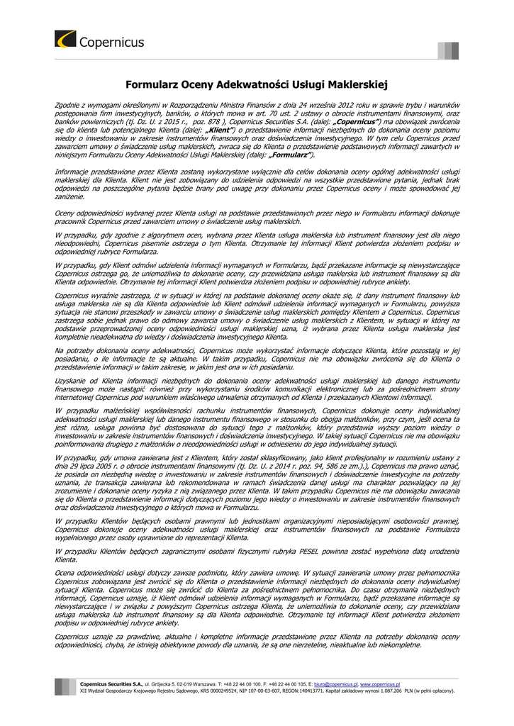 Formularz Oceny Adekwatności Usługi Maklerskiej Zgodnie z wymogami określonymi w Rozporządzeniu Ministra Finansów z dnia 24 września 2012 roku w sprawie trybu i warunków postępowania firm inwestycyjnych, banków, o których mowa w art. 70 ust. 2 ustawy o obrocie instrumentami finansowymi, oraz banków powierniczych (tj. Dz. U. z 2015 r., poz. 878 ), Copernicus Securities S.A. (dalej: „Copernicus”) ma obowiązek zwrócenia się do klienta lub potencjalnego Klienta (dalej: „Klient”) o przedstawienie informacji niezbędnych do dokonania oceny poziomu wiedzy o inwestowaniu w zakresie instrumentów finansowych oraz doświadczenia inwestycyjnego. W tym celu Copernicus przed zawarciem umowy o świadczenie usług maklerskich, zwraca się do Klienta o przedstawienie podstawowych informacji zawartych w niniejszym Formularzu Oceny Adekwatności Usługi Maklerskiej (dalej: „Formularz”). Informacje przedstawione przez Klienta zostaną wykorzystane wyłącznie dla celów dokonania oceny ogólnej adekwatności usługi maklerskiej dla Klienta. Klient nie jest zobowiązany do udzielenia odpowiedzi na wszystkie przedstawione pytania, jednak brak odpowiedzi na poszczególne pytania będzie brany pod uwagę przy dokonaniu przez Copernicus oceny i może spowodować jej zaniżenie. Oceny odpowiedniości wybranej przez Klienta usługi na podstawie przedstawionych przez niego w Formularzu informacji dokonuje pracownik Copernicus przed zawarciem umowy o świadczenie usług maklerskich. W przypadku, gdy zgodnie z algorytmem ocen, wybrana przez Klienta usługa maklerska lub instrument finansowy jest dla niego nieodpowiedni, Copernicus pisemnie ostrzega o tym Klienta. Otrzymanie tej informacji Klient potwierdza złożeniem podpisu w odpowiedniej rubryce Formularza. W przypadku, gdy Klient odmówi udzielenia informacji wymaganych w Formularzu, bądź przekazane informacje są niewystarczające Copernicus ostrzega go, że uniemożliwia to dokonanie oceny, czy przewidziana usługa maklerska lub instrument finansowy są dla Klienta odpowiednie. Otrzymanie tej informacji Klient potwierdza złożeniem podpisu w odpowiedniej rubryce ankiety. Copernicus wyraźnie zastrzega, iż w sytuacji w której na podstawie dokonanej oceny okaże się, iż dany instrument finansowy lub usługa maklerska nie są dla Klienta odpowiednie lub Klient odmówił udzielenia informacji wymaganych w Formularzu, powyższa sytuacja nie stanowi przeszkody w zawarciu umowy o świadczenie usług maklerskich pomiędzy Klientem a Copernicus. Copernicus zastrzega sobie jednak prawo do odmowy zawarcia umowy o świadczenie usług maklerskich z Klientem, w sytuacji w której na podstawie przeprowadzonej oceny odpowiedniości usługi maklerskiej uzna, iż wybrana przez Klienta usługa maklerska jest kompletnie nieadekwatna do wiedzy i doświadczenia inwestycyjnego Klienta. Na potrzeby dokonania oceny adekwatności, Copernicus może wykorzystać informacje dotyczące Klienta, które pozostają w jej posiadaniu, o ile informacje te są aktualne. W takim przypadku, Copernicus nie ma obowiązku zwrócenia się do Klienta o przedstawienie informacji w takim zakresie, w jakim jest ona w ich posiadaniu. Uzyskanie od Klienta informacji niezbędnych do dokonania oceny adekwatności usługi maklerskiej lub danego instrumentu finansowego może nastąpić również przy wykorzystaniu środków komunikacji elektronicznej lub za pośrednictwem strony internetowej Copernicus pod warunkiem właściwego utrwalenia otrzymanych od Klienta i przekazanych Klientowi informacji. W przypadku małżeńskiej współwłasności rachunku instrumentów finansowych, Copernicus dokonuje oceny indywidualnej adekwatności usługi maklerskiej lub danego instrumentu finansowego w stosunku do obojga małżonków, przy czym, jeśli ocena ta jest różna, usługa powinna być dostosowana do sytuacji tego z małżonków, który przedstawia wyższy poziom wiedzy o inwestowaniu w zakresie instrumentów finansowych i doświadczenia inwestycyjnego. W takiej sytuacji Copernicus nie ma obowiązku poinformowania drugiego z małżonków o nieodpowiedniości usługi w odniesieniu do jego indywidualnej sytuacji. W przypadku, gdy umowa zawierana jest z Klientem, który został sklasyfikowany, jako klient profesjonalny w rozumieniu ustawy z dnia 29 lipca 2005 r. o obrocie instrumentami finansowymi (tj. Dz. U. z 2014 r. poz. 94, 586 ze zm.).), Copernicus ma prawo uznać, że posiada on niezbędną wiedzę o inwestowaniu w zakresie instrumentów finansowych i doświadczenie inwestycyjne na potrzeby uznania, że transakcja zawierana lub rekomendowana w ramach świadczenia danej usługi ma charakter pozwalający na jej zrozumienie i dokonanie oceny ryzyka z nią związanego przez Klienta. W takim przypadku Copernicus nie ma obowiązku zwracania się do Klienta o przedstawienie informacji dotyczących poziomu jego wiedzy o inwestowaniu w zakresie instrumentów finansowych oraz doświadczenia inwestycyjnego o których mowa w Formularzu. W przypadku Klientów będących osobami prawnymi lub jednostkami organizacyjnymi nieposiadającymi osobowości prawnej, Copernicus dokonuje oceny adekwatności usługi maklerskiej oraz instrumentów finansowych na podstawie Formularza wypełnionego przez osoby uprawnione do reprezentacji Klienta. W przypadku Klientów będących zagranicznymi osobami fizycznymi rubryka PESEL powinna zostać wypełniona datą urodzenia Klienta. Ocena odpowiedniości usługi dotyczy zawsze podmiotu, który zawiera umowę. W sytuacji zawierania umowy przez pełnomocnika Copernicus zobowiązana jest zwrócić się do Klienta o przedstawienie informacji niezbędnych do dokonania oceny indywidualnej sytuacji Klienta. Copernicus może się zwrócić do Klienta za pośrednictwem pełnomocnika. Do czasu otrzymania niezbędnych informacji, Copernicus uznaje, iż Klient odmówił udzielenia informacji wymaganych w Formularzu, bądź przekazane informacje są niewystarczające i w związk