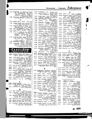 Kwiaciarnia — Pensjonaty 1415 15 88 1714 1334 17 53 10 64 15 84 13 86 1810 10 78 19 55 Kwiaciarnia, K. Wastak, Krupówki 36. Rok założenia 1894, Czło nek Europejskiego Zrzeszenia „Fleurop". Wysyła kwiaty I przyjmuje zlecenia do wszystkich miejscowości Europy Kwiaciarnia „Szarotka", Anna śnia do wska-Kubicowa, Krupówki 66 Landau Józef, Bystre, willa „ T a nia" Lankosz Bracia, sklep sportowy, ta bryczny skl, sukna I koców, Kru' pówki, naprzeciw M. Oka Latkowski Józef, dr, prof. Uniw. Jag., dyr. Kliniki chorób wewn.. Nowotarska 24, willa „Osoblta" Lechowicz Aleksander, adw. willa „Orawianka", Grunwaldzka 69 Lelbler Maks, adwokat, Nowotar ska 36 Leistett 'S., Magazyn tow. modnych I sportowych, Krupówki 32 — Leistenowa Maria, dr, choroby kobieca i położnictwo, gab., Krupówki 32, m. Orkana 1 , (tel. 18 10) Leistenowa Raabe Marla, dr, choroby kobiece I położnictwo, m. Orkana. 1 , gab. Krupówki 32 tel. 13 86 — Lelsten Zygmunt, m. Orkana 1 LejmanÓwna Helena, mgr, pens. „Śnieżka". Witkiewicza „Leszczków", zakłady rolniczo-przemysłowe Romana Żurowskiego, Sp. z o. o., wyrób sukna, koców i samodziałów wełnianych, skład w Zakopanem, Krupówki 66 fitsztzków w y f w t r n t s a m o d z i a ł u x cłtj'Stcj t o e ł n y owczej 19 43 „Leśne Ustronie". Piłsudskiego 14 67 Leśnictwo Państwowe Kościelisko (Patrz Zarząd Państw. Lasów Podh.) 1106 „Leśny Gród", pens. I . kat. 45 p , R. Newelskiego, Chramcówkl 1907 Lewicki Franciszek, dr. dyr. Sananatorlum P. C. K . Chramcówkl 12 96 Liberakowa Maria, koło pomnika Chałubińskiego 15 44 Lichnowski Antoni, Zakład Inst. wo dociągów i kanalizacji, Krupów ki 8, m.. Grunwaldzka 1146 Liga Popierania Turystyki, b. tury styczne, Kościuszki 1111 „Llnkoi", Kasprowy Wierch U 12 12 41 „Lipowy Dwór", pens. I . kat., dr Langrod Rudoll, do Białego 11 44 Łitawlński Tadeusz, architekt, rzadowo uprawniony budowniczy, Jagiellońska, „Boży Dar" 1100 Litwinek Emilia, sekretarka b. po średnictwa pracy, Krupówki 806 19 87 L. O. P. P., Linda M. „Lotos", willa, dzierż. Nledzlalkówna Krystyna, droga do Białego 15 45 „Lwowianka", pens. kat. I . , Za kopane 3 15 12 -i.Lubicz", willa, dr. Hrehorowicz, adw. 17 06 1278 17 27 14 27 17 02 1123 1985 . 1595 1224 1265 10 30 16 47 18 25 12 31 1109 1180 1122 12 58 16 84 10 80 1127 1667 13 64 1223 17 71 1175 14 06 13 71 12 77 12 76 14 54 M 17 73 13 22 1325 1186 15 41 15 81 16 21 major w st. sp., Bulw. Słowackiego „Magnolia", pensjonat pod zarzą dem Bronisławy Spanlang I We ry Hamerschlag, Zamojskiego Makietowa Helena, skl. węgla, koksu I mat. bud.. Dworzec kolejowy — Makieta St., biuro sped posred. handl.. Dworzec Malczewski Rafał. art. malarz, willa „Pełka", Ogrodowa Malicki Tadeusz, dyr. Sanat. Z.N.P. Małopolski Klub Jazdy, Zarząd Mia sta Małopolski Związek Mleczarski, Sp. z ogr. odp. w Krakowie, oddz, ' w Zakopanem, Krupówki 19 pens. „Granit", Ko ściuszki 1276 lekarz chorób chorób płuc, Krupówki 39 Mangel Maks, skład tow. bławat., obuwia I konfekcji, Krupówki 39 „Maraton", Sienkiewicza Marek Wojciech, rzeźnik, masarz, Chałubińskiego „Marllor", pens. Szczenlowsklch, Kościuszki Markiewicz Bronisław, dr, willa „Nasza , Zamojskiego „Mascotte", winiarnia, dancing. Za mojskiego 876 Mastalerz Kazimierz, dr, lekarz kli matyczny i miejski, Krupówki Matuszyk Józef, wyrąb mięsa 1 sprze daż wędlin, Kasprowlczs 1725 „Melior*, pens., Dylągowa Maria, Piłsudskiego „Meliiton", willa Malejewowej Ma rli, Grunwaldzka 2390 Mendrys Tadeusz, dr, „Stylowa" Obok „Madzi", Grunwaldzka Mentrek Julian, Skład tow. spożyw czo kolonialnych, Chałubińskiego „Mewa", Biate, Fabianowa Janina, łona kapitana Meyer Stefan, int.-archltekt, „za Hożą", Chałubińskiego Mirek Henryk, sprzedaż mięsa i wędlin, Krupówki — Rynek Mirek Henryk, sprzedaż mięsa I wę dlin, lilia i m., Kasprowicza Mleczarnia „pod 7 - ma kotami", Toporowa Cyhrla 2496 Mleczarnia Zdrowie, Filipiak Józef, Sienkiewicza 1957 Mleczarnia „Ziemianka", St. Sza błowski. Hurtowny I detaliczny handel nabiałem i jajami, droga do Rynku „Modrzejów", Dom Zdrowia, Ja giellońska 3 Molischowa Zofia, Chramcówki Monlczewskl Marian, architekt, Cha łubińskiego, willa „Hoża" „Montana", pens., Zadrożna Ludwi ka, droga do Strążysk „Montaż", konces. przedsięb. instal. wodociąg, kanalia, i centr. ogrz., Fr. Kozik, Krupówki Morawski Karol, dr, lekarz chorób kobiecych, Grunwaldzka Mrozowa Helena, pens. „Ariana" „Murań", pens.. Husenöder Konrad, Kasprusie 8 Muzeum Tatrzańskie im dra T . Cha łubińskiego, Stacja Meteorologi czna N 1318 1130 10 71 16 91 14 91 1181 1313 Łazienki miejskie 12 40 Łotockl Edward, dr lekarz nacz. i dyr. Sanatorium Zw. Prac. Poczt. Telegr. I Telei. („Sanato") Łukasiewlczowa Bronisława, pens. 15 37 „ H a l a " , Sienkiewicza Mandelbaum, Mangel Herman, dr wewn. specjalista 14 43 15 43 1612 1372 Mach Kazimierz, 16 06 17 66 1452 14 00 1118 16 74 12 44 Nadleśnictwo Państwowe Zakopane Nadleśnictwo Państwowe Bukowina (Patrz Zarząd Państw. Lasów Podh.) Nadzór Dróg 1 Mostów, Kamie niec 1485 Nalepowa Anna, pens. „Tatrogród", w Bialerh „Nałęcz", willa, Chelmicka Helena, do Białego Narty I przybory zimowe, wytwór nia I sklep sportowy, Bujak Franciszek, Krupówki Nebenzahl Samuel, inż., „Kampanuia". Małe żywczańskle Nejberg Aleksander, „Sport zimo wy I letni", Krupówki 24 Neuman, sklep towarów miesza nych, Grunwaldzka 1761 Neuwelt Alfred, willa „Milutka", żywczańskle Newelskl Romuald, pens. „Leśny Gród". Chramcówkl, — hotel „Morskie Oko", Krupówki (patrz Ajenc. Tatrzań.) — Niemczyk Stanisław, malarz pok. lakier. I szyld.. Nowotarska 14 Niewldowskl J., Repr. Lwowskich Browarów Notariusz, dr Włodzimierz Jasiń ski, róg Krupówek I Kościuszki, nad Bankiem Podhalańskim Notariusz, Gołkowskl Ludwik, Ko ściuszki 1 Nowakowski Adam, dr, pens. „Bel Ami" Nowotny Gustaw, dr, dyr. sz