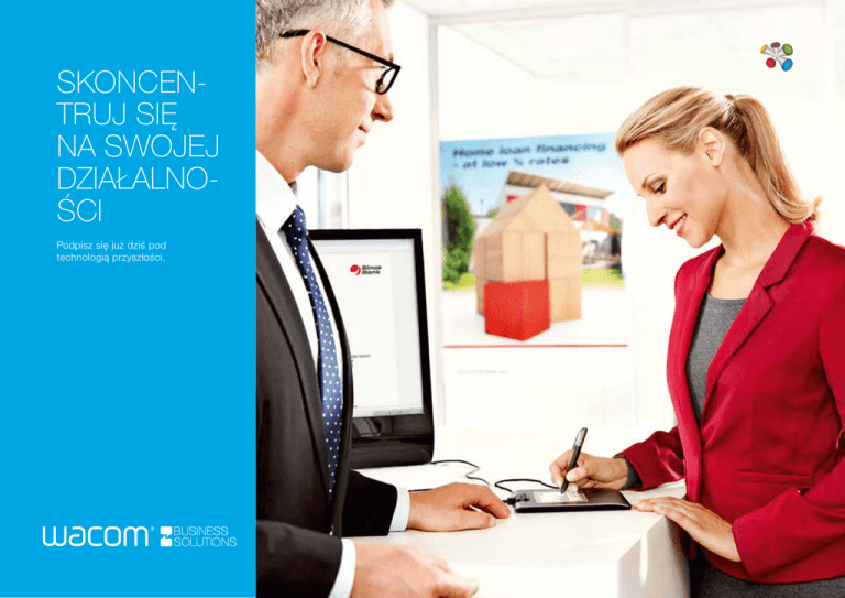 Skoncentruj się na swojej działalności Podpisz się już dziś pod technologią przyszłości. Witamy w Wacom eSignature www.signature.wacom.eu Elektroniczne podpisy odręczne stają się co raz bardziej powszechne w świecie biznesu. Ułatwiają one w znacznym stopniu podpisywanie umów, uwierzytelnianie płatności i inne działania biznesowe. Zapewniając wydajność i bezpieczeństwo, rozwiązania eSignature firmy Wacom już teraz stosowane są w szerokim zakresie aplikacji. Nowoczesna technologia, wysokiej jakości produkty i partnerzy, którzy są ekspertami w swoich dziedzinach, powodują że firma Wacom jest jednym z liderów na tym rynku. Przedsiębiorstwa zajmujące się dziedzinami tak różnymi, jak telekomunikacja, sprzedaż detaliczna, bankowość i finanse lub administracja państwowa już zdecydowały się na większą skuteczność w przyszłości dzięki podpisom elektronicznym. Od 30 lat firma Wacom jest liderem na światowym rynku tabletów piórkowych i pionierem w rozwoju pióra jako komputerowego urządzenia wejściowego. Sukces ten wyewoluował z bardziej fundamentalnej i pierwotnej wizji firmy Wacom, aby uczynić otoczenie komputerowe bardziej naturalnym, dzięki czemu potęga technologii komputerowej może być używana bardziej elastycznie i do większej różnorodności aplikacji. Zapoczątkowana na polu kreatywności, wizja ta – po wielu latach – przebiła się obecnie również do segmentu biznesu. Dzięki urządzeniom do podpisów firma Wacom opracowała produkty, które spełniają potrzeby przedsiębiorstw chcących uczynić swą pracę bardziej wydajną i bez dokumentów papierowych. Począwszy od pierwszych tabletów do podpisów, zakres produktów był stale poszerzany i przystosowywany do różnych scenariuszy użycia w otoczeniu biznesowym. Opatentowana technologia EMR firmy Wacom charakteryzuje się bezprecedensowymi zaletami umożliwiającymi rejestrację podpisów elektronicznych. Pozwoliła ona na opracowanie wytrzymałego i łatwego w użytkowaniu urządzenia, które charakteryzuje się niskimi łącznymi kosztami eksploatacji. Przypominając tradycyjne pióro i papier tak bardzo, jak to tylko możliwe, ułatwia ona akceptację elektronicznego podpisu odręcznego przez użytkowników końcowych. Klientom biznesowym rozwiązanie to zapewnia produkt, który jest wytrzymały Bardzo precyzyjny profil biometryczny: rejestracja podpisu w 3D i może być elastycznie stosowany w różnych sytuacjach. Urządzenia te rejestrują podpis, który spełnia wszystkie wymagania prawne i nadaje się do analizy sądowej. Ogromne przedsiębiorstwo telekomunikacyjne, przedstawiające swoim klientom umowy do podpisania na interaktywnym ekranie piórkowym lub sprzedawca detaliczny proszący swoich klientów o podpisanie potwierdzenia zapłaty na tablecie do podpisów – obie instytucje używają rozwiązań eSignature firmy Wacom. A zatem, firma Wacom nie dostarcza tylko jednego rozwiązania do rejestracji podpisów, ale dopasowane rozwiązanie, które spełnia indywidualne potrzeby każdego przedsiębiorstwa. Umożliwia to różnego rodzaju sprzęt oraz sieć partnerów klienta wspierana przez Europejskie Centrum Rozwoju i Wsparcia będące własnością firmy Wacom. Tworzenie oprogramowania oparte o Signature SDK (Software Development Kit) spełnia wymagania specjalne klientów, ich infrastruktury i procesów. Skutkuje to szerokim zakresem klientów, do których zalicza się telekomunikacja, bankowość i finanse, turystyka, sprzedaż detaliczna i inne. Klienci ci ufają dopasowanym rozwiązaniom opracowanym przez firmę Wacom i jej partnerów. Skuteczność i bezpieczeństwo to więcej niż płynność pracy jako takiej: Oznacza to, że wybór rozwiązania eSignature firmy Wacom to bezpieczna inwestycja. Elektroniczne podpisy odręczne nie tylko ograniczają zużycie papieru, zmniejszają obsługę i koszty archiwizacji ale sprawiają, że cały proces jest o wiele bardziej przyjazny dla środowiska. Rozwiązanie eSignature firmy Wacom zapewnia szybki zwrot inwestycji po zaledwie kilku miesiącach. Niskie łączne koszty eksploatacji ze względu na zaprojektowanie i trwałość sprzętu składają się na rozwiązanie, które jest skuteczne i bezpieczne w każdym aspekcie, dając przedsiębiorstwom możliwość poświęcania czasu ich najważniejszej działalności: tj. klientom. Wyznaczanie nowych standardów w zakresie podpisów elektronicznych Szeroka gama naszych produktów została opracowana w taki sposób, aby była dopasowana do różnych wymagań, aplikacji i środowisk. Tak więc, ich konstrukcja i funkcje są różne, ale wszystkie one mają jedną wspólną cechę: Opatentowana przez firmę Wacom technologia pióra, dzięki czemu nadają się do bezpiecznego i prawnie wiążącego składania podpisów elektronicznych. Urządzenie DTU-1031 jest to pierwszy wyświetlacz do podpisów o rozmiarze 26 cm (10,1”) do użytku stacjonarnego, który łączący w sobie duży ekran z nowoczesnym szyfrowaniem danych. Wyświetlacz do podpisów umożliwia użytkownikom dodawanie odręcznych wpisów bezpośrednio na monitorze przy użyciu pióra cyfrowego. Dla zapewnienia bezpieczeństwa nasze urządzenia do składania podpisów wyposażone są w nowoczesne szyfrowanie danych. Urządzenie DTU-1031 to idealne rozwiązanie dla klientów korporacyjnych i instytucjonalnych, którzy wymagają wyświetlacza o minimalnej powierzchni, umożliwiającego użytkownikom przeglądanie lub wypełnianie dokumentów w pełnym wymiarze i elektroniczne podpisywanie tych dokumentów. Kompaktowe rozmiary i Wprowadza kolor w punktach Mały i wytrzymały obsługi i kontroli Wyposażone w 5’’ kolorowy wyświetlacz LCD o wysokiej rozdzielczości (800 x 480), urządzenie STU-530 to idealny tablet do podpisów, który przeznaczony jest do używania w punktach sprzedaży lub w punktach obsługi klientów. Urządzenie to zapewnia bardzo wygodne podpisywanie dzięki ulepszonej, cienk