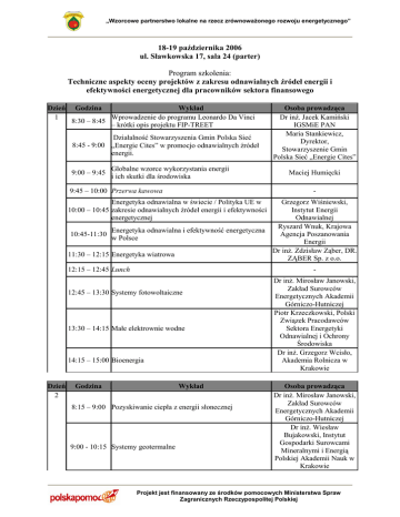 „Wzorcowe partnerstwo lokalne na rzecz zrównowaŜonego rozwoju energetycznego” 18-19 października 2006 ul. Sławkowska 17, sala 24 (parter) Program szkolenia: Techniczne aspekty oceny projektów z zakresu odnawialnych źródeł energii i efektywności energetycznej dla pracowników sektora finansowego Dzień 1 Godzina Wykład Wprowadzenie do programu Leonardo Da Vinci 8:30 – 8:45 – krótki opis projektu FIP-TREET Działalność Stowarzyszenia Gmin Polska Sieć 8:45 - 9:00 „Energie Cites” w promocjo odnawialnych źródeł energii. 9:00 – 9:45 Globalne wzorce wykorzystania energii i ich skutki dla środowiska 9:45 – 10:00 Przerwa kawowa Energetyka odnawialna i efektywność energetyczna w Polsce 11:30 – 12:15 Energetyka wiatrowa 12:15 – 12:45 Lunch Grzegorz Wiśniewski, Instytut Energii Odnawialnej Ryszard Wnuk, Krajowa Agencja Poszanowania Energii Dr inŜ. Zdzisław Ząber, DR. ZĄBER Sp. z o.o. - 12:45 – 13:30 Systemy fotowoltaiczne 13:30 – 14:15 Małe elektrownie wodne 14:15 – 15:00 Bioenergia Dzień 2 Maciej Humięcki - Energetyka odnawialna w świecie / Polityka UE w 10:00 – 10:45 zakresie odnawialnych źródeł energii i efektywności energetycznej 10:45-11:30 Osoba prowadząca Dr inŜ. Jacek Kamiński IGSMiE PAN Maria Stankiewicz, Dyrektor, Stowarzyszenie Gmin Polska Sieć „Energie Cites” Godzina Wykład 8:15 – 9:00 Pozyskiwanie ciepła z energii słonecznej 9:00 - 10:15 Systemy geotermalne Dr inŜ. Mirosław Janowski, Zakład Surowców Energetycznych Akademii Górniczo-Hutniczej Piotr Krzeczkowski, Polski Związek Pracodawców Sektora Energetyki Odnawialnej i Ochrony Środowiska Dr inŜ. Grzegorz Wcisło, Akademia Rolnicza w Krakowie Osoba prowadząca Dr inŜ. Mirosław Janowski, Zakład Surowców Energetycznych Akademii Górniczo-Hutniczej Dr inŜ. Wiesław Bujakowski, Instytut Gospodarki Surowcami Mineralnymi i Energią Polskiej Akademii Nauk w Krakowie Projekt jest finansowany ze środków pomocowych Ministerstwa Spraw Zagranicznych Rzeczypospolitej Polskiej „Wzorcowe partnerstwo lokalne na rzecz zrównowaŜonego rozwoju energetycznego” 10:15 – 10:30 Przerwa kawowa 10:30 – 11:15 Pompy ciepła Mgr inŜ. Jarosław Kotyza IGSMiE PAN 11:15 – 12:00 Produkcja energii elektrycznej i ciepła w skojarzeniu Elektrociepłownia Kraków 12:00 – 12:45 Modernizacja budynków w kierunku poprawy efektywności energetycznej 12:45 – 13:15 Lunch 13:15 – 13:45 Dariusz Curyło, "Egoterm" Sp.j. - Środki poprawy efektywności energetycznej procesów przemysłowych Dariusz Curyło, "Egoterm" Sp.j. Dr inŜ. Tomasz Śliwa, 13:45 – 15:00 Analiza ekonomiczna przedsięwzięć energetycznych Zakład Wiertnictwa Nafty i Gazu AGH Systemy wsparcia inwestycji w odnawialne źródła energii i efektywność energetyczną w Polsce Aneta Sapińska, Kierownik Zakres: (Historic Support for Renewables in Poland, Projektów, Stowarzyszenie 15:00 – 15:45 Successes and Failures of programs, Policy on New Gmin Polska Sieć „Energie & Renewable Energies, Aims of Polish Government Cites” Policy, Regional Planning & Targets) Projekt jest finansowany ze środków pomocowych Ministerstwa Spraw Zagranicznych Rzeczypospolitej Polskiej