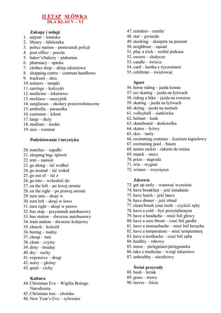 II ETAP SŁÓWKA DLA KLAS V – VI Zakupy i usługi 1. airport – lotnisko 2. library – biblioteka 3. police station – posterunek policji 4. post office – poczta 5. baker’s/bakery – piekarnia 6. pharmacy – apteka 7. clothes shop – sklep odzieżowy 8. shopping centre – centrum handlowe 9. tracksuit – dres 10. trainers – tampki 11. earrings – kolczyki 12. medicine – lekarstwo 13. necklace – naszyjnik 14. sunglasses – okulary przeciwsłoneczne 15. umbrella – parasolka 16. customer – kilent 17. large – duży 18. medium – średni 19. size – rozmiar Podróżowanie i turystyka 20. matches – zapałki 21. sleeping bag- śpiwór 22. tent – namiot 23. go along – iść wzdłuż 24. go around – iść wokół 25. go out of – iść z 26. go into – wchodzić do 27. on the left – po lewej stronie 28. on the right – po prawej stronie 29. turn into – skręć w 30. turn left – skręć w lewo 31. turn right – skręć w prawo 32. bus stop – przystanek autobusowy 33. bus station – dworzec autobusowy 34. train station – dworzec kolejowy 35. church – kościół 36. boring – nudny 37. cheap – tani 38. clean – czysty 39. dirty – brudny 40. dry – suchy 41. expensive – drogi 42. noisy – głośny 43. quiet – cichy Kultura 44. Christmas Eve – Wigilia Bożego Narodzenia 45. Christmas tree – choinka 46. New Year’s Eve – sylwester 47. reindeer – renifer 48. star – gwiazda 49. stocking – skarpeta na present 50. neighbour – sąsiad 51. play a trick – zrobić psikusa 52. sweets – słodycze 53. candle – świeca 54. card – kartka z życzeniami 55. celebrate – świetować Sport 56. horse riding – jazda konna 57. ice skating – jazda na łyżwach 58. riding a bike – jazda na rowerze 59. skating – jazda na łyżwach 60. skiing – jazda na nartach 61. volleyball – siatkówka 62. helmet – kask 63. skateboard – deskorolka 64. skates – łyżwy 65. skis – narty 66. swimming costume – kostium kąpielowy 67. swimming pool – basen 68. tennis racket – rakieta do tenisa 69. match – mecz 70. prize – nagroda 71. win – wygrać 72. winner – zwycięzca Zdrowie 73. get up early – wstawać wcześnie 74. have breakfast – jeść śniadanie 75. have lunch – jeść lancz 76. have dinner – jeść obiad 77. clean/brush your teeth – czyścić zęby 78. have a cold – być przeziębionym 79. have a headache – mieć ból głowy 80. have a sore throat – czuć ból gardła 81. have a stomachache – mieć ból brzucha 82. have a temperature – mieć temperaturę 83. have a toothache – czuć ból zęba 84. healthy – zdrowy 85. nurse – pielęgniarz/pielęgniarka 86. take a medicine – wziąć lekarstwo 87. unhealthy – niezdrowy Świat przyrody 88. bush – krzak 89. grass – trawa 90. leaves – liście