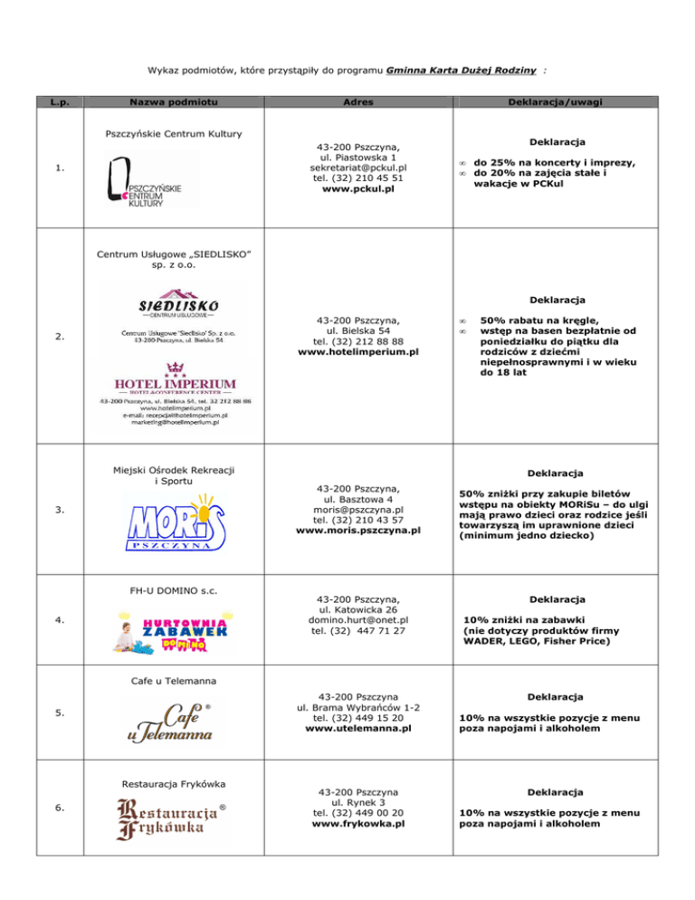 Wykaz podmiotów, które przystąpiły do programu Gminna Karta Dużej Rodziny : L.p. Nazwa podmiotu Adres Deklaracja/uwagi Pszczyńskie Centrum Kultury 43-200 Pszczyna, ul. Piastowska 1 [email protected] tel. (32) 210 45 51 www.pckul.pl 1. Deklaracja • • do 25% na koncerty i imprezy, do 20% na zajęcia stałe i wakacje w PCKul Centrum Usługowe „SIEDLISKO” sp. z o.o. Deklaracja 43-200 Pszczyna, ul. Bielska 54 tel. (32) 212 88 88 www.hotelimperium.pl 2. Miejski Ośrodek Rekreacji i Sportu 3. FH-U DOMINO s.c. 4. • • 50% rabatu na kręgle, wstęp na basen bezpłatnie od poniedziałku do piątku dla rodziców z dziećmi niepełnosprawnymi i w wieku do 18 lat Deklaracja 43-200 Pszczyna, ul. Basztowa 4 [email protected] tel. (32) 210 43 57 www.moris.pszczyna.pl 43-200 Pszczyna, ul. Katowicka 26 [email protected] tel. (32) 447 71 27 50% zniżki przy zakupie biletów wstępu na obiekty MORiSu – do ulgi mają prawo dzieci oraz rodzice jeśli towarzyszą im uprawnione dzieci (minimum jedno dziecko) Deklaracja 10% zniżki na zabawki (nie dotyczy produktów firmy WADER, LEGO, Fisher Price) Cafe u Telemanna 43-200 Pszczyna ul. Brama Wybrańców 1-2 tel. (32) 449 15 20 www.utelemanna.pl 5. Restauracja Frykówka 6. 43-200 Pszczyna ul. Rynek 3 tel. (32) 449 00 20 www.frykowka.pl Deklaracja 10% na wszystkie pozycje z menu poza napojami i alkoholem Deklaracja 10% na wszystkie pozycje z menu poza napojami i alkoholem PHU BEST Centrum Języków Obcych 7. Spółdzielnia Socjalna Pedagogów Śląskich 8. Sklep Firmowy MESSA 9. Deklaracja 43-200 Pszczyna, ul. Plac Targowy 15 [email protected] tel. (32) 447 07 23 www.bestcentrum.pl/pszczyna 43-215 Jankowice, ul. Żubrów 86 tel. (32) 214 60 44 43-200 Pszczyna ul. Rynek 2 tel. (32) 210 42 89 www.messa.pl • • • • 1 2 3 4 Rabat od ceny kursu: osoba rabat 100 zł, osoby rabat 150zł od osoby, osoby rabat 200 zł od osoby, osoby rabat 250 zł od osoby. Deklaracja 10% na usługę opieki nad dziećmi w żłobku Deklaracja 10% na towary z wyłączeniem promocji i przecen Gabinet Psychologiczny i Terapii Integracji Sensorycznej Aleksandra Herok-Duc 43-200 Pszczyna ul. Łowiecka 19A tel. 507 164 472 www.gabinet-si.com 10. Deklaracja 10% zniżki na usługę Agencja Rozwoju i Promocji Ziemi Pszczyńskiej 43-200 Pszczyna ul. 3 Maja 9 [email protected] tel. (32) 210 35 65 (32) 212 81 31 www.zubry.pszczyna.pl 11. Optyk Rozmus s.c. 12. Deklaracja 43-200 Pszczyna ul. Rymarska 2, ul. Dobrawy 7, ul. Broniewskiego 1A (pasaż w Kauflandzie), tel. (32) 447 01 27 [email protected] www.optykrozmus.pl • Zagroda Żubrów : - bilet normalny 6,50 zł, - bilet ulgowy (dzieci i młodzież od 4 do 16 lat) 4,50 zł • Skansen Zagroda Wsi Pszczyńskiej 30% na bilety wstępu Deklaracja 20% zniżki na okulary korekcyjne – rabat nie obejmuje produktów przecenionych F.H.U. „NTS” Bartłomiej Sosna, Szymon Baca s.c. 13. 43-200 Pszczyna ul. Batorego 25/13 [email protected] tel. 531 051 929 www.nts-sc.pl Deklaracja 15% zniżki na cały asortyment Deklaracja Biuro Handlowe „KAJEX” Joanna Ziebura 14. 43-241 Łąka ul. Topolowa 1 tel. (32) 210 87 83 [email protected] www.kajex.pl • • • 10% zniżki na parapety MDF, 5% zniżki na parapety wewnętrzne PCV i parapety zewnętrzne, 7% zniżki na pozostałe towary za wyjątkiem artykułów promocyjnych, doładowań, prasy i papierosów Deklaracja 15. 16. Salon Psiej Urody ALL4DOG Remigiusz Szlauer Optyk Karolina s.c. 17. Optyk Karolina dla dzieci 18. UBEZPIECZENIA Firma Usługowa Krzysztof Kostka 19. 43-200 Pszczyna ul. Warowna 21 tel. 602 486 514 • • 43-200 Pszczyna ul. Warowna 21 tel. 602 486 514 Deklaracja 10% zniżki na kurs nurkowania 43-200 Pszczyna ul. Dobrawy 6 tel. 695 730 046 [email protected] www.optykkarolina.pl Deklaracja 10% zniżki na zakupy, rabat nie łączy się z innymi promocjami 43-200 Pszczyna ul. Dobrawy 2 tel. 695 010 548 [email protected] www.optykkarolina.pl 43-200 Pszczyna ul. Kopernika 26 tel. (32) 447 09 38, 605 300 180 [email protected] www.kostkaubezpieczenia.pl Deklaracja 20% rabatu na zakupy, rabat nie łączy się z innymi promocjami Deklaracja • • 10% zniżki w składce na ubezpieczenia majątkowe, 10% zniżki w składce na ubezpieczenia komunikacyjne Deklaracja Pszczyńskie Centrum Rekreacji 20. 20% zniżki na strzyżenie i kosmetykę psów, 10% zniżki na szkolenie psów 43-262 Radostowice ul. Dworcowa 28A tel. 601 541 066 www.pcr-pszczyna.pl • • do 20% zniżki : 1 dziecko - 5% zniżki, 2 dziecko - 10% zniżki, 3 dziecko - 20 % zniżki, 5% zniżki - wyjazdy wakacyjne Muzeum Prasy Śląskiej przy Towarzystwie Miłośników Ziemi Pszczyńskiej 21. RehaSon Aleksandra Sondej 22. 43-200 Pszczyna ul. Piastowska 26 tel. (32) 210 16 27 [email protected] www.muzeumprasy.pl 43-215 Jankowice ul. Żubrów 86, ul. Baziowa 17 tel. 517 561 907 [email protected] www.rehason.pl Deklaracja bilet rodzinny 20,- zł – niezależnie od ilości dzieci Deklaracja 10% zniżki na rehabilitację, fizykoterapię, masaż leczniczy, gimnastykę korekcyjną, kinesiology taping, aerobic lub steper-aerobic Firma Handlowa „KATI” Katarzyna Gieradka-Brzóska Sklep „ŚWIAT DZIECKA” 23. Grzegorz Białas Ośrodek Szkolenia Kierowców „3” 24. Niepubliczne Przedszkole TROSKLIWE MISIE Judyta Marcinkiewicz 25. FIZJOS Michalina Wyrobek 26. ALUSTAL Michał Piech 27. 43-200 Pszczyna ul. Bielska 34 A (pasaż w Intermarche) tel. (32) 212 01 12 [email protected] 43-200 Pszczyna ul. B. Chrobrego 19 (Plac Targowy) tel. 32 447 09 10 662 077 481 [email protected] www.osk3.pl 43-215 Jankowice ul. Żubrów 86 tel. 608 150 772 [email protected] www.troskliwe_misie.eu 43-200 Pszczyna ul. Zamenhofa 4/3A tel. 790 636 990, 880 796 626 [email protected] www.fizjos.pl 43-215 Jankowice ul. K. Szewczyka 1 tel. 881 539 026 [email protected] www.alustal.eu Deklaracja 10% rabatu na cały asortyment Deklaracja 5% rabatu na kurs prawa jazdy kat.: B, AM, A1, A2, A Deklaracja 10% zniżki na czesne Deklaracja 10% rabatu na obuwi