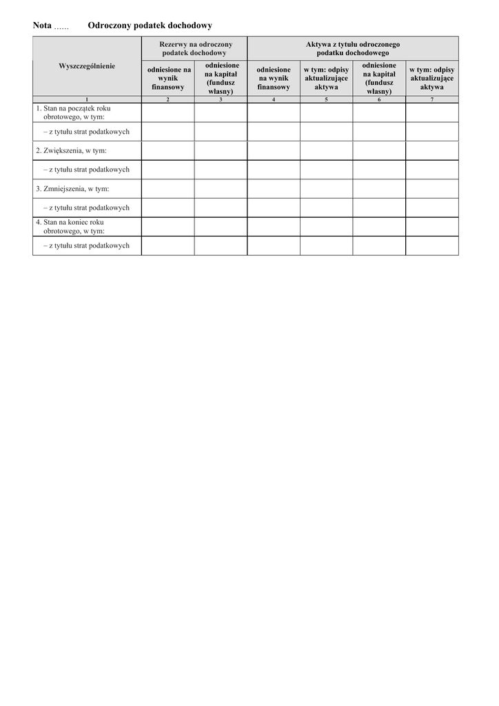 Nota …… Odroczony podatek dochodowy Rezerwy na odroczony podatek dochodowy Wyszczególnienie 1 1. Stan na początek roku obrotowego, w tym: – z tytułu strat podatkowych 2. Zwiększenia, w tym: – z tytułu strat podatkowych 3. Zmniejszenia, w tym: – z tytułu strat podatkowych 4. Stan na koniec roku obrotowego, w tym: – z tytułu strat podatkowych Aktywa z tytułu odroczonego podatku dochodowego odniesione na wynik finansowy odniesione na kapitał (fundusz własny) odniesione na wynik finansowy w tym: odpisy aktualizujące aktywa odniesione na kapitał (fundusz własny) w tym: odpisy aktualizujące aktywa 2 3 4 5 6 7