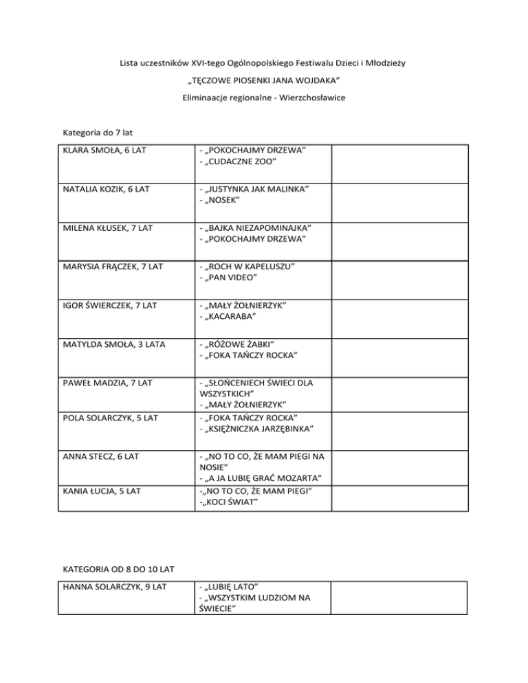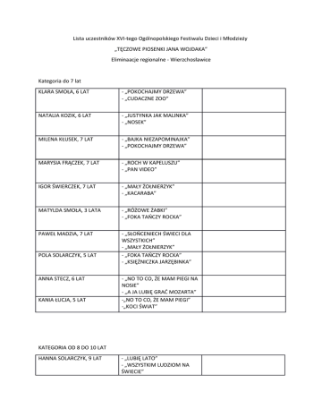 Lista uczestników XVI-tego Ogólnopolskiego Festiwalu Dzieci i Młodzieży „TĘCZOWE PIOSENKI JANA WOJDAKA” Eliminaacje regionalne - Wierzchosławice Kategoria do 7 lat KLARA SMOŁA, 6 LAT - „POKOCHAJMY DRZEWA” - „CUDACZNE ZOO” NATALIA KOZIK, 6 LAT - „JUSTYNKA JAK MALINKA” - „NOSEK” MILENA KŁUSEK, 7 LAT - „BAJKA NIEZAPOMINAJKA” - „POKOCHAJMY DRZEWA” MARYSIA FRĄCZEK, 7 LAT - „ROCH W KAPELUSZU” - „PAN VIDEO” IGOR ŚWIERCZEK, 7 LAT - „MAŁY ŻOŁNIERZYK” - „KACARABA” MATYLDA SMOŁA, 3 LATA - „RÓŻOWE ŻABKI” - „FOKA TAŃCZY ROCKA” PAWEŁ MADZIA, 7 LAT - „SŁOŃCENIECH ŚWIECI DLA WSZYSTKICH” - „MAŁY ŻOŁNIERZYK” - „FOKA TAŃCZY ROCKA” - „KSIĘŻNICZKA JARZĘBINKA” POLA SOLARCZYK, 5 LAT ANNA STECZ, 6 LAT KANIA ŁUCJA, 5 LAT - „NO TO CO, ŻE MAM PIEGI NA NOSIE” - „A JA LUBIĘ GRAĆ MOZARTA” -„NO TO CO, ŻE MAM PIEGI” -„KOCI ŚWIAT” KATEGORIA OD 8 DO 10 LAT HANNA SOLARCZYK, 9 LAT - „LUBIĘ LATO” - „WSZYSTKIM LUDZIOM NA ŚWIECIE” NORBERT JEDLIŃSKI, 10 LAT - „SZARE ŻAGLE DNIA” - „PÓŁ PIOSENKI” ADRIAN FOSZCZ, 10 LAT - „KACARABA” - „NIE DA RADY” OLIWIA NIEMCZURA, 8 LAT - „MOJE GNIEZNO” - „CHCĘ MIEĆ CHŁOPAKA” ZESPÓŁ GOGA: NATALIA MICHALSKA, 8 LAT OLIWIA MIŚ, 8 LAT DAGMARA GROMNIAK, 7 LAT JULIA JUSZCZAK, 8 LAT - „ZAWIJASY Z NASZEJ KLASY” - „LODY, LODY JEŚĆ” WIOLETTA KANIA, 8 LAT - „KOCI ŚWIAT” - „NO TO CO, ŻE MAM PIEGI” - „RÓŻOWY TULIPAN” - „KSIĘŻNICZKA JARZĘBINKA” KATEGORIA OD 11 DO 13 LAT GABRIELA MICHALSKA, 12 LAT - „KOLEJOWY SEN” - „NIE MA DNI BEZ TYGODNIA” PAULINA IGNAC, 12 LAT - „KRAJ MIŁOŚCI” - „DZWONIĘ DO KRAKOWA” KLAUDIA KORDELA, 11 LAT - „DESZCZOWA BOSSA NOVA” - „SŁONECZNY ORDER UŚMIECHU” - „NIE PYTAJCIE” - „SZARE ŻAGLE” ELIZA GĄSIOROWSKA, 12 LAT MARCELINA CIEŚLIK, 12 LAT - „NA POLANIE” - „BIESZCZADZKI POEMAT” GABRIELA GOLEC, 11 LAT - „NIE CHCĘ IDOLA” - „MIŁOŚCI SZLAK” GABRIELA FORTUNA, 12 LAT - „KOLEJOWY SEN” - „CHOĆ NIE ZNAM PANI ANI PANI” - „NIE SZKODA RÓŻ” - „DOOKOŁA WOJTEK” WERONIKA BAJOREK, 12 LAT KATEGORIA OD 14 DO 16 LAT KATARZYNA ZAUCHA, 16 LAT - „NA NIEBIE MOICH MARZEŃ” - „SIÓDME NIEBO” PATRYCJA KOTARBA, 15 LAT - „KRAJ MIŁOŚĆI” - „BIAŁY LATAWIEC” ALEKSANDRA KĄCKA, 14 LAT - „DOPISZĘ CIEBIE DO GORĄCYCH NOCY” - „W MIODOWYM RAJU” - „W MIODOWYM RAJU” - „KRAJ MIŁOŚCI” WIKTORIA OLIWA, 15 LAT ALEKSANDRA ABRAM, 16 LAT - „W LIŚCIACH SNU” - „ECHO SŁÓW” BEATA OGIELA, 14 LAT KINGA DULEBA, 14 LAT - „W MIODOWYM RAJU” -„ W MIODOWYM RAJU” -„DO JUTRA” KATEGORIA OD 17 LAT MAGDALENA LIPIŃSKA, 24 LATA - „KRAJ MIŁOŚCI” - „WIDZĘ CIEBIE” EMILIA ZAJĄC, 20 LAT - „TO NIE FAIR, TO NIE PLAY” - „CHWILE JAK MOTYLE” ANNA OGIELA, 18 LAT - „ECHO SŁÓW” - „”ZOSTAŃ Z NAMI MELODIO” KRYSTIAN KUBOWICZ, 17 LAT - „LONDYN WE MGLE” - „ZACZAROWANY FORTEPIAN” DUET: JULIA HONKISZ, 18 LAT WIKTORIA LASOTA, 18 LAT - „ECHO SŁÓW” - „KRAJ MIŁOŚCI”