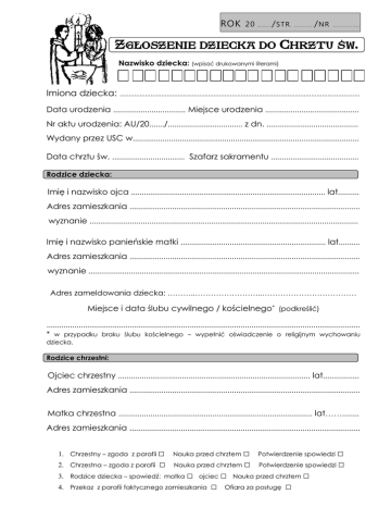 ROK 20 … … . . . / STR . Z GŁOSZENIE DZIECKA DO ........... / NR ............... C HRZTU ŚW . Nazwisko dziecka: (wpisać drukowanymi literami) Imiona dziecka: ..................................................................................................................................... Data urodzenia .................................. Miejsce urodzenia ............................................ Nr aktu urodzenia: AU/20......./................................... z dn. ........................................... Wydany przez USC w.......................................................................................................... Data chrztu św. .................................. Szafarz sakramentu ......................................... Rodzice dziecka: Imię i nazwisko ojca ........................................................................................... lat.......... Adres zamieszkania ............................................................................................................ wyznanie .............................................................................................................................. Imię i nazwisko panieńskie matki .................................................................... lat.......... Adres zamieszkania ............................................................................................................ wyznanie ............................................................................................................................... Adres zameldowania dziecka: ………..……………………..……………………………… Miejsce i data ślubu cywilnego / kościelnego* (podkreślić) ................................................................................................................................................... * w przypadku braku ślubu kościelnego – wypełnić oświadczenie o religijnym wychowaniu dziecka. Rodzice chrzestni: Ojciec chrzestny .......................................................................................... lat................. Adres zamieszkania ............................................................................................................ Matka chrzestna ........................................................................................... lat……........ Adres zamieszkania ............................................................................................................ 1. Chrzestny – zgoda z parafii □ 2. 3. 4. □ Potwierdzenie spowiedzi □ Chrzestna – zgoda z parafii □ Nauka przed chrztem □ Potwierdzenie spowiedzi □ Rodzice dziecka – spowiedź: matka □ ojciec □ Nauka przed chrztem □ Przekaz z parafii faktycznego zamieszkania □ Ofiara za posługę □ Nauka przed chrztem