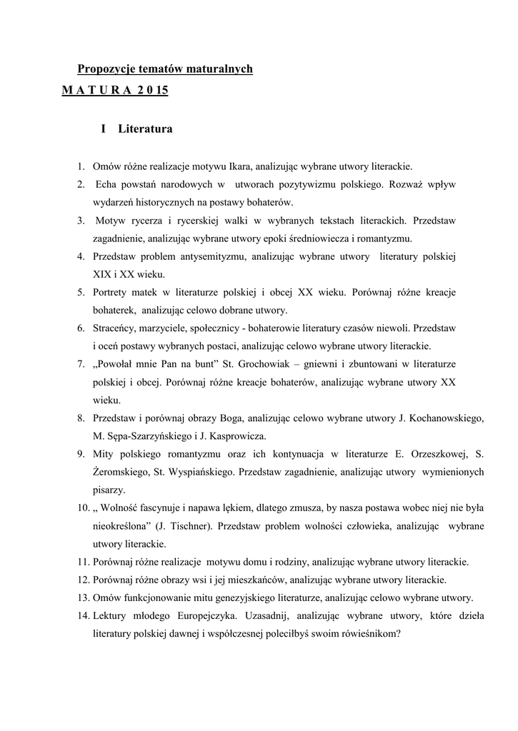 Propozycje tematów maturalnych M A T U R A 2 0 15 I Literatura