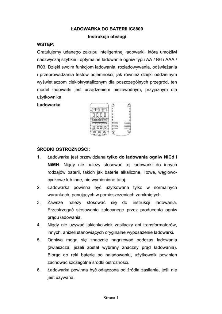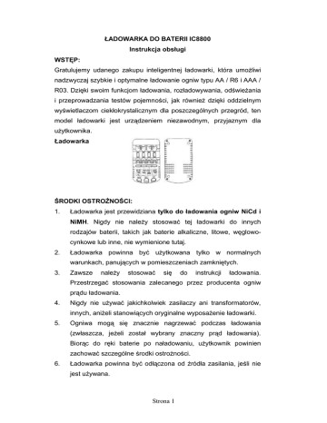 ŁADOWARKA DO BATERII IC8800 Instrukcja obsługi WSTĘP: Gratulujemy udanego zakupu inteligentnej ładowarki, która umożliwi nadzwyczaj szybkie i optymalne ładowanie ogniw typu AA / R6 i AAA / R03. Dzięki swoim funkcjom ładowania, rozładowywania, odświeżania i przeprowadzania testów pojemności, jak również dzięki oddzielnym wyświetlaczom ciekłokrystalicznym dla poszczególnych przegród, ten model ładowarki jest urządzeniem niezawodnym, przyjaznym dla użytkownika. Ładowarka ŚRODKI OSTROŻNOŚCI: 1. Ładowarka jest przewidziana tylko do ładowania ogniw NiCd i NiMH. Nigdy nie należy stosować tej ładowarki do innych rodzajów baterii, takich jak baterie alkaliczne, litowe, węglowocynkowe lub inne, nie wymienione tutaj. 2. Ładowarka powinna być użytkowana tylko w normalnych warunkach, panujących w pomieszczeniach zamkniętych. 3. Zawsze należy stosować się do instrukcji ładowania. Przestrzegać stosowania zalecanego przez producenta ogniw prądu ładowania. 4. Nigdy nie używać jakichkolwiek zasilaczy ani transformatorów, innych, aniżeli stanowiących oryginalne wyposażenie ładowarki. 5. Ogniwa mogą się znacznie nagrzewać podczas ładowania (zwłaszcza, jeżeli został wybrany znaczny prąd ładowania). Biorąc do ręki baterie po naładowaniu, użytkownik powinien zachować szczególne środki ostrożności. 6. Ładowarka powinna być odłączona od źródła zasilania, jeśli nie jest używana. Strona 1 MOŻLIWOŚCI, JAKIE DAJE ŁADOWARKA: Ładowanie ogniw prądem o różnych wartościach (200, 500, 700 lub 1000 mA). Podczas ładowana dwóch baterii, prąd ładowania może być ustawiony na 1500 lub 1800 mAh. Szybkie ładowanie – w ciągu 70 minut naładowanie baterii o pojemności 2000 mAh. Osobne wyświetlacze ciekłokrystaliczne dla poszczególnych przegród. Możliwość jednoczesnego ładowania ogniw w rozmiarach AA / R6 i AAA / R03. Wykrywanie stanu przegrzania, pozwalające na zapobieganie przeładowaniu ogniw. Stosowanie metody minus delta V (-dV) dla rozpoznania stanu pełnego naładowania – w celu zakończenia ładowania. Wykrywanie uszkodzonych baterii. Praca w rozładowanie, trybie a „Discharge” następnie [rozładowanie] ładowanie), (najpierw pozwalającym na zlikwidowanie efektu pamięciowego w ogniwach. Odświeżanie starych ogniw za pomocą cykli „rozładowanie/ładowanie” Funkcja testowania w celu sprawdzenia pojemności ogniw. Operacje rozładowania/ładowania mogą być uruchamiane niezależnie i jednocześnie dla każdego ogniwa, umieszczonego w odpowiedniej przegrodzie. Możliwość stosowania różnych trybów wyświetlania podczas operacji rozładowania/ładowania – wyświetlanie prądu ładowania (w mA), upływu czasu (w hh:mm), napięcia na ogniwach (w V) i nagromadzonego w ogniwie ładunku elektrycznego (w mAh lub Ah). ELEMENTY ZESTAWU: 1. Ładowarka Strona 2 2. Zasilacz 3. Adaptory o rozmiarze C / R14 (4 szt.) oraz D / R20 (4 szt.) 4. Pokrowiec 5. 4 szt. Ogniw AA NiMH 2300mAh 6. Instrukcja obsługi KLAWISZE FUNKCYJNE: Ładowarka posiada trzy łatwe w użyciu klawisze funkcyjne oraz cztery klawisze oznaczone numerami: Klawisze numerów przegród na baterie Klawisz CURRENT (PRĄD ŁADOWANIA) Klawisz MODE (reżim pracy) Klawisz DISPLAY (WYŚWIETLANIE) Klawisze numerów przegród na baterie Aby wybrać odpowiednią przegrodę na baterię w celu ustawienia trybu ładowania i/lub zmiany trybu wyświetlania, należy wcisnąć a następnie zwolnić odpowiedni klawisz oznaczony numerem. Klawisz MODE (tryb pracy ładowarki) Wciskanie i zwalnianie klawisza powoduje przełączanie pomiędzy czterema różnymi trybami pracy „Charge” (ładowanie), „Discharge” (rozładowywanie), „Refresh” (odświeżanie) oraz „Test” (testowanie). Aby zmienić tryb pracy dla poszczególnego ogniwa, najpierw należy wcisnąć odpowiedni klawisz NUMERU przegrody, a następnie wcisnąć klawisz MODE. Klawisz DISPLAY (tryb wyświetlania informacji) Wciskanie i zwalnianie klawisza w trakcie procesu ładowania lub rozładowywania - powoduje przełączanie pomiędzy wyświetlaniem prądu ładowania (w mA), upływu czasu ładowania (w hh:mm), Strona 3 napięcia ogniwa (w V) oraz nagromadzonego ładunku elektrycznego (w mAh lub Ah). Aby zmienić treść wyświetlanej informacji dla poszczególnego ogniwa, najpierw należy wcisnąć odpowiedni klawisz NUMERU przegrody, a następnie wcisnąć klawisz DISPLAY. Klawisz CURRENT (prąd ładowania) Wciśnięcie klawisza (w ciągu pierwszych 8 sekund po umieszczeniu baterii w ładowarce) powoduje wybranie odpowiedniej wartości prądu użytego w różnych trybach pracy (patrz także poniżej – rozdział „Rozpoczęcie ładowania ogniw”). TRYBY PRACY ŁADOWARKI Ta bardzo mocna ładowarka umożliwia pracę w następujących trybach: a. Ładowanie ogniw (tryb „CHARGE”) – pozwala na pełne naładowanie ogniwa, a następnie dokonuje się automatyczne przełączenie na ładowanie podtrzymujące (buforowe). b. Rozładowanie, a następnie naładowanie ogniwa (tryb „DISCHARGE”) – umożliwia rozładowanie ogniwa , a następnie jego naładowanie, co pozwoli na zminimalizowanie efektu pamięciowego baterii. c. Odświeżenie ogniwa (tryb „REFRESH”) – pozwala na przywrócenie ogniwom ich maksymalnej pojemności przez powtarzające się cykle ładowania i rozładowania, aż do osiągnięcia stanu, w którym nie daje się już zaobserwować dalszego wzrostu ich pojemności. W przypadku starych lub długo nie używanych ogniw, takie odświeżenie może doprowadzić do przywrócenia ich pojemności do stanu optymalnego. d. Sprawdzenie pojemności ogniw, wyrażanej w mAh/Ah (tryb „TEST”). Strona 4 TRYB „CHARGE” (ŁADOWANIE) Domyślnym trybem pracy ładowarki jest ładowanie prądem 200 mA. Gdy w ładowarce odbywa się ładowanie tylko dwóch ogniw przy czym wykorzystywane do tego celu są jedynie przegrody 1 i 4, to wciskając klawisz CURRENT można zadać ładowanie prądem 1500