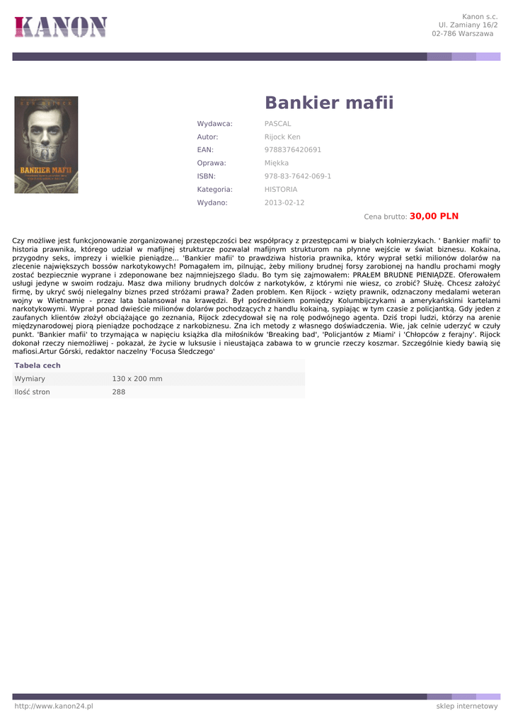 Kanon s.c. Ul. Zamiany 16/2 02-786 Warszawa Bankier mafii Wydawca: PASCAL Autor: Rijock Ken EAN: 9788376420691 Oprawa: Miękka ISBN: 978-83-7642-069-1 Kategoria: HISTORIA Wydano: 2013-02-12 Cena brutto: 30,00 PLN Czy możliwe jest funkcjonowanie zorganizowanej przestępczości bez współpracy z przestępcami w białych kołnierzykach. ' Bankier mafii' to historia prawnika, którego udział w mafijnej strukturze pozwalał mafijnym strukturom na płynne wejście w świat biznesu. Kokaina, przygodny seks, imprezy i wielkie pieniądze... 'Bankier mafii' to prawdziwa historia prawnika, który wyprał setki milionów dolarów na zlecenie największych bossów narkotykowych! Pomagałem im, pilnując, żeby miliony brudnej forsy zarobionej na handlu prochami mogły zostać bezpiecznie wyprane i zdeponowane bez najmniejszego śladu. Bo tym się zajmowałem: PRAŁEM BRUDNE PIENIĄDZE. Oferowałem usługi jedyne w swoim rodzaju. Masz dwa miliony brudnych dolców z narkotyków, z którymi nie wiesz, co zrobić? Służę. Chcesz założyć firmę, by ukryć swój nielegalny biznes przed stróżami prawa? Żaden problem. Ken Rijock - wzięty prawnik, odznaczony medalami weteran wojny w Wietnamie - przez lata balansował na krawędzi. Był pośrednikiem pomiędzy Kolumbijczykami a amerykańskimi kartelami narkotykowymi. Wyprał ponad dwieście milionów dolarów pochodzących z handlu kokainą, sypiając w tym czasie z policjantką. Gdy jeden z zaufanych klientów złożył obciążające go zeznania, Rijock zdecydował się na rolę podwójnego agenta. Dziś tropi ludzi, którzy na arenie międzynarodowej piorą pieniądze pochodzące z narkobiznesu. Zna ich metody z własnego doświadczenia. Wie, jak celnie uderzyć w czuły punkt. 'Bankier mafii' to trzymająca w napięciu książka dla miłośników 'Breaking bad', 'Policjantów z Miami' i 'Chłopców z ferajny'. Rijock dokonał rzeczy niemożliwej - pokazał, że życie w luksusie i nieustająca zabawa to w gruncie rzeczy koszmar. Szczególnie kiedy bawią się mafiosi.Artur Górski, redaktor naczelny 'Focusa Śledczego' Tabela cech Wymiary 130 x 200 mm Ilość stron 288 http://www.kanon24.pl sklep internetowy