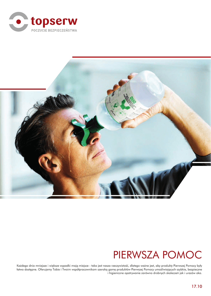 PIERWSZA POMOC Każdego dnia mniejsze i większe wypadki mają miejsce - taka jest nasza rzeczywistość, dlatego ważne jest, aby produkty Pierwszej Pomocy były łatwo dostępne. Oferujemy Tobie i Twoim współpracownikom szeroką gamę produktów Pierwszej Pomocy umożliwiających szybkie, bezpieczne i higieniczne opatrywanie zarówno drobnych skaleczeń jak i urazów oka. 17.10 ROZTWORY DO PŁUKANIA OCZU WERSJE DUO Nakrętka jest jednocześnie podwójną (DUO) wylewką płuczki. Jej kształt pomaga zachować otwarte oczy podczas płukania a także przemywać je jednocześnie w sposób łagodny i równomierny W każdym miejscu, gdzie istnieje ryzyko uszkodzenia wzroku, szybki dostęp do płuczki ma zasadnicze znaczenie 2 ROZTWORY DO PŁUKANIA OCZU ROZTWÓR DO PŁUKANIA OKA, KWAS, ZASADA ROZTWÓR DO PŁUKANIA OKA, CIAŁO OBCE KWAS FOSFORANOWY 4,9% CHLOREK SODU 0,9% • • • Sterylnie zamknięta butelka (płuczka) z roztworem do płukania oka. Sterylnie zamknięta butelka (płuczka) z roztworem do płukania oka. • Stosowana jako wyposażenie indywidualne pracownika, w każdym miejscu gdzie istnieje ryzyko zalania oczu i twarzy substancjami zasadowymi lub kwasem. • • • • • • Wystarczy odkręcić nakrętkę i rozpocząć płukanie. • Piktogramy na butelce oraz prosta i jasna instrukcja umożliwiają płukanie oczu w sposób prawidłowy i bezpieczny. • • • Nie wymaga czyszczenia ani konserwacji. Szybko i skutecznie neutralizuje nawet bardzo silne kwasy i substancje zasadowe. Wystarczy odkręcić nakrętkę i rozpocząć płukanie. Nakrętka jest jednocześnie wylewką płuczki. Jej kształt pokrywa się z naturalną krzywizną oka, co czyni produkt wygodnym, higienicznym i łatwym w użyciu. Nie wymaga czyszczenia ani konserwacji. Przeznaczona do wypłukania ciała obcego z oka. Stosowana jako wyposażenie indywidualne pracownika, w każdym miejscu gdzie istnieje ryzyko uszkodzenia wzroku przez ciało obce. Nakrętka jest jednocześnie wylewką płuczki. Jej kształt pokrywa się z naturalną krzywizną oka, co czyni produkt wygodnym, higienicznym i łatwym w użyciu. Piktogramy na butelce oraz prosta i jasna instrukcja umożliwiają płukanie oczu w sposób prawidłowy i bezpieczny. Certyfikat Kod produktu Pojemność Certyfikat 133.110.200 133.111.500 133.112.100 200 ML 500 ML DUO 1000 ML Kod produktu 133.100.200 133.100.500 133.100.100 133.101.100 Pojemność 200 ML 500 ML 1000 ML 1000 ML DUO www.topserw.com.pl 3 ZESTAWY NAŚCIENNE Certyfikat WYPŁUKIWANIE CIAŁA OBCEGO Z OKA, CHLOREK SODU 0,9% BUTELKA 1 X 500 ML BUTELKA 1 X 1000 ML, DUO, PIKTOGRAM • Sterylnie zamknięta butelka (płuczka) z roztworem do płukania oka do powieszenia na ścianie. • Sterylnie zamknięta butelka (płuczka) z roztworem do płukania oczu oraz uchwytem i piktogramem do powieszenia na ścianie. • • Nie wymaga czyszczenia ani konserwacji. • • Nie wymaga czyszczenia ani konserwacji. Przeznaczony do wypłukania ciała obcego z oka. Kod produktu 133.200.500 BUTELKA 2 X 500 ML, PIKTOGRAM, LUSTRO BUTELKA 2 X 1000 ML, PIKTOGRAM, LUSTRO • Sterylnie zamknięte butelki (płuczki) z roztworem do płukania oczu oraz uchwytem i piktogramem wraz z lustrem do powieszenia na ścianie. • Sterylnie zamknięte butelki (płuczki) z roztworem do płukania oczu oraz piktogramem do powieszenia na ścianie. • Nie nadaje się do miejsc brudnych i zakurzonych. • • Przeznaczony do wypłukania ciała obcego z oczu. • Kod produktu 4 133.202.500 Przeznaczona do wypłukania ciała obcego z oczu. Kod produktu 133.201.100 ZESTAW NAŚCIENNY ZAMYKANY, BUTELKA 2 X 500 ML ZESTAW NAŚCIENNY ZAMYKANY, BUTELKA 2 X 1000 ML DUO • • Nie nadaje się do miejsc brudnych i zakurzonych. Pyłoszczelny zestaw ze sterylnie zamkniętymi butelkami (płuczkami) z roztworem do płukania oczu w zamykanym pudełku naściennym. Pyłoszczelny zestaw ze sterylnie zamkniętymi butelkami (płuczkami) z roztworem do płukania oczu w zamykanym pudełku naściennym. • Wykonany z odpornego na uderzenia poliestru. • Przeznaczony do wypłukania ciała obcego z oczu. Wykonany z odpornego na uderzenia poliestru. • Szczególnie nadaje się do miejsc brudnych i zakurzonych. • Szczególnie nadaje się do miejsc brudnych i zakurzonych. • Przeznaczony do wypłukania ciała obcego z oczu. • Przeznaczony do wypłukania ciała obcego z oczu. Kod produktu 133.202.100 Kod produktu 133.203.500 Kod produktu 133.204.100 WYPŁUKIWANIE KWASÓW I ZASAD Z OKA, KWAS FOSFORANOWY 4,9% BUTELKA 1 X 1000 ML ZESTAW NAŚCIENNY COMBI - BUTELKA 1 X 200 ML, 1 X 500 ML • Sterylnie zamknięta butelka (płuczka) z roztworem do spłukiwania dużej powierzchni ciała oraz uchwytem i piktogramem do powieszenia na ścianie. • Sterylnie zamknięte butelki (płuczki) z roztworem do płukania oczu oraz uchwytem i piktogramem wraz z lustrem do powieszenia na ścianie. • • Nie wymaga czyszczenia ani konserwacji. • • Nie nadaje się do miejsc brudnych i zakurzonych. Szybko i skutecznie neutralizuje nawet bardzo silne kwasy i substancje zasadowe. Kod produktu 133.210.100 ZESTAW NAŚCIENNY ZAMYKANY COMBI - BUTELKA 1 X 200 ML, 1 X 500 ML, PIKTOGRAM, LUSTRO Przeznaczony do wypłukania ciała obcego z oczu oraz neutralizacji nawet bardzo silnych kwasów i substancji zasadowych. Kod produktu 133.220.250 ROZTWÓR DO PŁUKANIA OKA, CIAŁO OBCE, KWAS I ZASADA, DUO BUTELKA 1 X 500 ML, 1 X 1000 ML, PIKTOGRAM, LUSTRO ROZTWÓR DO PŁUKANIA OKA, CIAŁO OBCE, KWAS I ZASADA, DUO BUTELKA 1 X 500 ML, 1 X 1000 ML, PIKTOGRAM, LUSTRO • Sterylnie zamknięte butelki (płuczki) z roztworem do płukania oczu oraz uchwytem i piktogramem wraz z lustrem do powieszenia na ścianie. • Pyłoszczelny zestaw ze sterylnie zamkniętymi butelkami (płuczkami) z roztworem do płukania oczu w zamykanym pudełku naściennym. • Pyłoszczelny zestaw ze sterylnie zamkniętymi butelkami (płuczkami) z roztworem do płukania oczu w zamykanym pudełku naściennym. • Wykonany z od