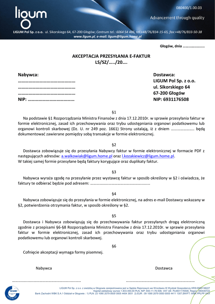 080400/1.00.03 LIGUM Pol Sp. z o.o. ul. Sikorskiego 64, 67-200 Głogów; Centrum tel.: 6064 54 486, tel.+48/76/834-15-65, fax:+48/76/833-50-38 www.ligum.pl, e-mail: [email protected] Głogów, dnia ………………….. AKCEPTACJA PRZESYŁANIA E-FAKTUR LS/SZ/…../20…. Nabywca: ………………………………………… ………………………………………… ………………………………………… NIP: ………………………………… Dostawca: LIGUM Pol Sp. z o.o. ul. Sikorskiego 64 67-200 Głogów NIP: 6931176508 §1 Na podstawie §1 Rozporządzania Ministra Finansów z dnia 17.12.2010r. w sprawie przesyłania faktur w formie elektronicznej, zasad ich przechowywania oraz trybu udostępniania organowi podatkowemu lub organowi kontroli skarbowej (Dz. U. nr 249 poz. 1661) Strony ustalają, iż z dniem ………………….. będą dokumentować zawierane pomiędzy sobą transakcje w formie elektronicznej. §2 Dostawca zobowiązuje się do przesyłania Nabywcy faktur w formie elektronicznej w formacie PDF z następujących adresów: [email protected] oraz [email protected]. W takiej samej formie przesyłane będą faktury korygujące oraz duplikaty faktur. §3 Nabywca wyraża zgodę na przesyłanie przez wystawcę faktur w sposób określony w §2 i oświadcza, że faktury te odbierać będzie pod adresem: …………………………………………………… §4 Nabywca zobowiązuje się do przesyłania w formie elektronicznej, na adres e-mail Dostawcy wskazany w §2, potwierdzenia otrzymania faktur, w sposób określony w §2. §5 Dostawca i Nabywca zobowiązują się do przechowywania faktur przesyłanych drogą elektroniczną zgodnie z przepisami §6-§8 Rozporządzenia Ministra Finansów z dnia 17.12.2010r. w sprawie przesyłania faktur w formie elektronicznej, zasad ich przechowywania oraz trybu udostępniania organowi podatkowemu lub organowi kontroli skarbowej. §6 Cofnięcie akceptacji wymaga formy pisemnej. Nabywca …………………………………………………………… Dostawca …………………………………………………………… LIGUM Pol Sp. z o.o. z siedzibą w Głogowie zarejestrowana jest w Sądzie Rejonowym we Wrocławiu IX Wydział Gospodarczy KRS:0000138227 Kapitał zakładowy wynosi 1.833.000,00 PLN, NIP: 693-11-76-508, VAT UE: PL6931176508, Regon: 390440722 Bank Zachodni WBK S.A.1 Oddział w Głogowie : 1) PLN: 23 1090 2079 0000 0005 4404 3931 2) EUR : 09 1090 2079 0000 0005 4411 1307,SWIFT: WBK PPLPP XXX