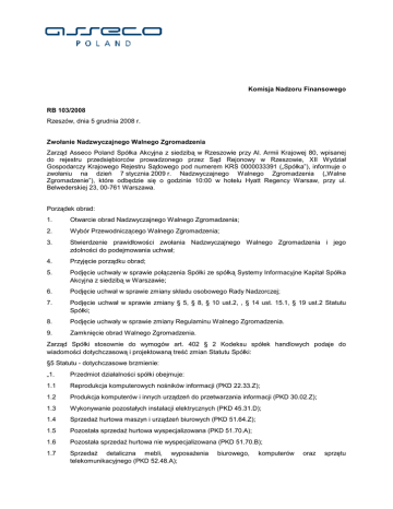 Komisja Nadzoru Finansowego RB 103/2008 Rzeszów, dnia 5 grudnia 2008 r. Zwołanie Nadzwyczajnego Walnego Zgromadzenia Zarząd Asseco Poland Spółka Akcyjna z siedzibą w Rzeszowie przy Al. Armii Krajowej 80, wpisanej do rejestru przedsiębiorców prowadzonego przez Sąd Rejonowy w Rzeszowie, XII Wydział Gospodarczy Krajowego Rejestru Sądowego pod numerem KRS 0000033391 („Spółka”), informuje o zwołaniu na dzień 7 stycznia 2009 r. Nadzwyczajnego Walnego Zgromadzenia („Walne Zgromadzenie”), które odbędzie się o godzinie 10:00 w hotelu Hyatt Regency Warsaw, przy ul. Belwederskiej 23, 00-761 Warszawa. Porządek obrad: 1. Otwarcie obrad Nadzwyczajnego Walnego Zgromadzenia; 2. Wybór Przewodniczącego Walnego Zgromadzenia; 3. Stwierdzenie prawidłowości zwołania Nadzwyczajnego Walnego Zgromadzenia i jego zdolności do podejmowania uchwał; 4. Przyjęcie porządku obrad; 5. Podjęcie uchwały w sprawie połączenia Spółki ze spółką Systemy Informacyjne Kapitał Spółka Akcyjna z siedzibą w Warszawie; 6. Podjęcie uchwał w sprawie zmiany składu osobowego Rady Nadzorczej; 7. Podjęcie uchwał w sprawie zmiany § 5, § 8, § 10 ust.2, , § 14 ust. 15.1, § 19 ust.2 Statutu Spółki; 8. Podjęcie uchwały w sprawie zmiany Regulaminu Walnego Zgromadzenia. 9. Zamknięcie obrad Walnego Zgromadzenia. Zarząd Spółki stosownie do wymogów art. 402 § 2 Kodeksu spółek handlowych podaje do wiadomości dotychczasową i projektowaną treść zmian Statutu Spółki: §5 Statutu - dotychczasowe brzmienie: „1. Przedmiot działalności spółki obejmuje: 1.1 Reprodukcja komputerowych nośników informacji (PKD 22.33.Z); 1.2 Produkcja komputerów i innych urządzeń do przetwarzania informacji (PKD 30.02.Z); 1.3 Wykonywanie pozostałych instalacji elektrycznych (PKD 45.31.D); 1.4 SprzedaŜ hurtowa maszyn i urządzeń biurowych (PKD 51.64.Z); 1.5 Pozostała sprzedaŜ hurtowa wyspecjalizowana (PKD 51.70.A); 1.6 Pozostała sprzedaŜ hurtowa nie wyspecjalizowana (PKD 51.70.B); 1.7 SprzedaŜ detaliczna mebli, wyposaŜenia telekomunikacyjnego (PKD 52.48.A); biurowego, komputerów oraz sprzętu 1.8 Transmisja danych i teleinformatyka (PKD 64.20.C); 1.9 Wynajem nieruchomości na własny rachunek (70.20.Z); 1.10 Wynajem maszyn i urządzeń biurowych (PKD 71.33 .Z); 1.11 Doradztwo w zakresie sprzętu komputerowego (PKD 72. 10.Z); 1.12 Działalność w zakresie oprogramowania (PKD 72.20.Z); 1.13 Przetwarzanie danych (PKD 72.30.Z); 1.14 Działalność związana z bazami danych (PKD 72.40.Z); 1.15 Konserwacja i naprawa maszyn biurowych, księgujących i liczących (PKD 72.50.Z); 1.16 Pozostała działalność związana z informatyką (PKD 72.60.Z); 1.17 Prace badawczo-rozwojowe w dziedzinie nauk technicznych (PKD 73.10.G); 1.18 Doradztwo w zakresie prowadzenia działalności gospodarczej i zarządzania PKD74.14.B); 1.19 Zarządzanie i kierowanie w zakresie prowadzenia działalności gospodarczej (PKD74.14.B); 1.20 Działalność związana z zarządzaniem holdingami (PKD 74.15.Z); 1.21 Reklama (PKD 74.40.Z); 1.22 Pozaszkolne formy kształcenia, gdzie indziej nie sklasyfikowane (PKD 80.42.Z); 1.23 Leasing (PKD 65.21.Z); 1.24 Naprawa i konserwacja urządzeń elektrycznych (PKD 2007 33.14.Z); 1.25 Instalowanie maszyn przemysłowych, sprzętu i wyposaŜenia (PKD 2007 33.20.Z); 1.26 Wykonywanie instalacji wodno-kanalizacyjnych, cieplnych, gazowych i klimatyzacyjnych (PKD 2007 43.22.Z)”. §5 Statutu otrzyma następujące brzmienie: „1. Przedmiot działalności spółki obejmuje: 1.1 Reprodukcja zapisanych nośników informacji (PKD 18.20.Z); 1.2 Produkcja komputerów i urządzeń peryferyjnych (PKD 26.20.Z); 1.3 Instalowanie maszyn przemysłowych, sprzętu i wyposaŜenia (PKD 33.20.Z); 1.4 Pozostała działalność usługowa komputerowych (PKD 62.09.Z); 1.5 Wykonywanie instalacji elektrycznych (PKD 43.21.Z); 1.6 SprzedaŜ hurtowa komputerów, urządzeń peryferyjnych i oprogramowania (PKD 46.51.Z); 1.7 SprzedaŜ hurtowa sprzętu elektronicznego i telekomunikacyjnego oraz części do niego (PKD 46.52.Z); 1.8 SprzedaŜ hurtowa pozostałych maszyn i urządzeń biurowych (PKD 46.66.Z); 1.9 SprzedaŜ hurtowa niewyspecjalizowana (PKD 46.90.Z); w zakresie technologii informatycznych i 1.10 SprzedaŜ detaliczna komputerów, urządzeń peryferyjnych i oprogramowania prowadzona w wyspecjalizowanych sklepach (PKB 47.41.Z); 1.11 SprzedaŜ detaliczna sprzętu telekomunikacyjnego prowadzona w wyspecjalizowanych sklepach (PKD 47.42.Z); 1.12 SprzedaŜ detaliczna mebli, sprzętu oświetleniowego i pozostałych artykułów uŜytku domowego prowadzona w wyspecjalizowanych sklepach (PKD 47.59.Z); 1.13 Działalność w zakresie telekomunikacji przewodowej (PKD 61.10.Z); 1.14 Działalność w zakresie telekomunikacji bezprzewodowej, z wyłączeniem telekomunikacji satelitarnej (PKD 61.20.Z); 1.15 Wynajem i zarządzanie nieruchomościami własnymi lub dzierŜawionymi (PKD 68.20.Z); 1.16 Wynajem i dzierŜawa maszyn i urządzeń biurowych, włączając komputery (PKD 77.33.Z); 1.17 Działalność związana z oprogramowaniem (PKD 62.01.Z); 1.18 Działalność związana z doradztwem w zakresie informatyki (PKD 62.02.Z); 1.19 Pozostała działalność usługowa w zakresie technologii informatycznych i komputerowych (PKD 62.09.Z); 1.20 Działalność związana z zarządzaniem urządzeniami informatycznymi (PKD 62.03.Z); 1.21 Przetwarzanie danych; zarządzanie stronami internetowymi (hosting) i podobna działalność (PKD 63.11.Z); 1.22 Wydawanie ksiąŜek (PKD 58.11.Z); 1.23 Wydawanie gazet (PKD 58.13.Z); 1.24 Wydawanie czasopism i pozostałych periodyków (PKD 58.14.Z); 1.25 Pozostała działalność wydawnicza (PKD 58.19.Z); 1.26 Działalność wydawnicza w zakresie pozostałego oprogramowania (PKD 58.29.Z); 1.27 Działalność portali internetowych (PKD 63.12.Z); 1.28 Naprawa i konserwacja maszyn (PKD 33.12.Z); 1.29 Naprawa i konserwacja komputerów i urządzeń peryferyjnych (PKD 95.11.Z); 1.30 Pozostała działalnoś