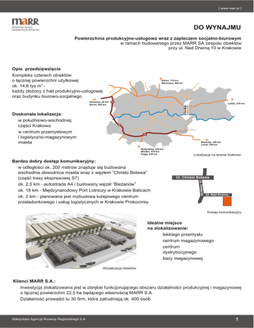 [ www.marr.pl ] DO WYNAJMU Powierzchnia produkcyjno-us³ugowa wraz z zapleczem socjalno-biurowym w ramach budowanego przez MARR SA zespo³u obiektów przy ul. Nad Drwin¹ 10 w Krakowie Opis przedsiêwziêcia Kompleks czterech obiektów o ³¹cznej powierzchni u¿ytkowej ok. 14,6 tys m2 ka¿dy z³o¿ony z hali produkcyjno-us³ugowej oraz budynku biurowo-socjalnego Kielce, 110 km Warszawa, 300 km Katowice, 80 km A4 Berlin, 600 km Business Park Doskona³a lokalizacja: , w po³udniowo-wschodniej czêœci Krakowa , w centrum przemys³owym i logistyczno-magazynowym miasta Lublin, 270 km A4 A4 Rzeszów, 160 km Lwów, 300 km Bratys³awa, 430 km Wiedeñ, 470 km Praga, 530 km Ul. Christo Botewa Ul. Pó³³an ki Bardzo dobry dostêp komunikacyjny: , w odleg³oœci ok. 200 metrów znajduje siê budowana wschodnia obwodnica miasta wraz z wêz³em “Christo Botewa” (czêœæ trasy ekspresowej S7) , ok. 2,5 km - autostrada A4 i budowany wêze³ “Bie¿anów” , ok. 18 km - Miêdzynarodowy Port Lotniczy w Krakowie Balicach , ok. 2 km - planowana jest rozbudowa kolejowego centrum prze³adunkowego i us³ug logistycznych w Krakowie Prokocimiu Lokalizacja na terenie Krakowa Ul. Nad Drwin¹ Dostêp komunikacyjny Idealne miejsce na zlokalizowanie: [ lekkiego przemys³u [ centrum magazynowego [ centrum dystrybucyjnego [ bazy magazynowej Wizualizacja obiektów Klienci MARR S.A.: , Inwestycja zlokalizowana jest w obrêbie funkcjonuj¹cego obszaru dzia³alnoœci produkcyjnej i magazynowej o ³¹cznej powierzchni 22,5 ha bêd¹cego w³asnoœci¹ MARR S.A. , Dzia³alnoœæ prowadzi tu 30 firm, które zatrudniaj¹ ok. 400 osób Ma³opolska Agencja Rozwoju Regionalnego S.A. 1 [ www.marr.pl ] Charakterystyka techniczna obiektów: Hale: [ [ [ [ [ [ [ Nowoczesna konstrukcja stalowa 2 Powierzchnia u¿ytkowa ka¿dej hali ok. 3.125 m Istnieje mo¿liwoœæ z³¹czenia dwóch hal Wymiary: 44 x 72 m Wysokoœæ u¿ytkowa hali 9 m Posadzka przemys³owa na obci¹¿enie 50 kN/m2 Minimalna powierzchnia wynajmu ok. 1.500 m2 Biura i zaplecze socjalne: [ Budynki przylegaj¹ce do hal produkcyjno-us³ugowych [ Dwukondygnacyjne - na parterze powierzchnie socjalne, na piêtrze biura 2 [ Powierzchnia biura - ok. 130 m w ka¿dym budynku 2 [ Powierzchnia zaplecza socjalnego - ok. 200 m w ka¿dym budynku [ Mo¿liwoœæ rozbudowy (3 kondygnacja) Plan jednego z czterech obiektów , , , , , Miejsca parkingowe dla samochodów osobowych i ciê¿arowych Plac manewrowy Zagospodarowane otoczenie obiektów Mo¿liwoœæ wygrodzenia terenu Budynki zrealizowane w podstawowym standardzie wykoñczenia - istnieje mo¿liwoœæ dostosowania powierzchni do potrzeb najemcy Planowany termin udostêpnienia I kwarta³ 2011 Wizualizacja kompleksu obiektów przy ul. Nad Drwin¹ W celu uzyskania szczegó³owych informacji prosimy o kontakt: Ma³opolska Agencja Rozwoju Regionalnego S.A., ul. Kordylewskiego 11, 31-542 Kraków Departament Inwestycji i Zarz¹dzania Nieruchomoœciami, tel. (012) 266 16 84, faks (012) 266 19 57 e-mail [email protected] Ma³opolska Agencja Rozwoju Regionalnego S.A. 2