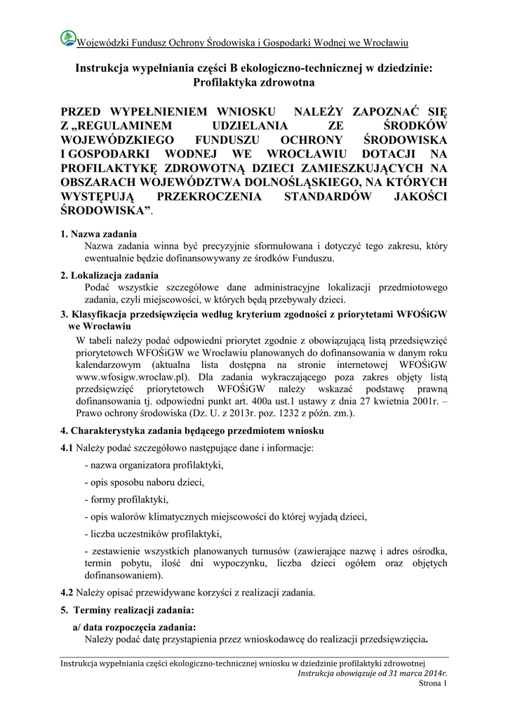Wojewódzki Fundusz Ochrony Środowiska i Gospodarki Wodnej we Wrocławiu Instrukcja wypełniania części B ekologiczno-technicznej w dziedzinie: Profilaktyka zdrowotna PRZED WYPEŁNIENIEM WNIOSKU NALEŻY ZAPOZNAĆ SIĘ Z „REGULAMINEM UDZIELANIA ZE ŚRODKÓW WOJEWÓDZKIEGO FUNDUSZU OCHRONY ŚRODOWISKA I GOSPODARKI WODNEJ WE WROCŁAWIU DOTACJI NA PROFILAKTYKĘ ZDROWOTNĄ DZIECI ZAMIESZKUJĄCYCH NA OBSZARACH WOJEWÓDZTWA DOLNOŚLĄSKIEGO, NA KTÓRYCH WYSTĘPUJĄ PRZEKROCZENIA STANDARDÓW JAKOŚCI ŚRODOWISKA”. 1. Nazwa zadania Nazwa zadania winna być precyzyjnie sformułowana i dotyczyć tego zakresu, który ewentualnie będzie dofinansowywany ze środków Funduszu. 2. Lokalizacja zadania Podać wszystkie szczegółowe dane administracyjne lokalizacji przedmiotowego zadania, czyli miejscowości, w których będą przebywały dzieci. 3. Klasyfikacja przedsięwzięcia według kryterium zgodności z priorytetami WFOŚiGW we Wrocławiu W tabeli należy podać odpowiedni priorytet zgodnie z obowiązującą listą przedsięwzięć priorytetowch WFOŚiGW we Wrocławiu planowanych do dofinansowania w danym roku kalendarzowym (aktualna lista dostępna na stronie internetowej WFOŚiGW www.wfosigw.wroclaw.pl). Dla zadania wykraczającego poza zakres objęty listą przedsięwzięć priorytetowch WFOŚiGW należy wskazać podstawę prawną dofinansowania tj. odpowiedni punkt art. 400a ust.1 ustawy z dnia 27 kwietnia 2001r. – Prawo ochrony środowiska (Dz. U. z 2013r. poz. 1232 z późn. zm.). 4. Charakterystyka zadania będącego przedmiotem wniosku 4.1 Należy podać szczegółowo następujące dane i informacje: - nazwa organizatora profilaktyki, - opis sposobu naboru dzieci, - formy profilaktyki, - opis walorów klimatycznych miejscowości do której wyjadą dzieci, - liczba uczestników profilaktyki, - zestawienie wszystkich planowanych turnusów (zawierające nazwę i adres ośrodka, termin pobytu, ilość dni wypoczynku, liczba dzieci ogółem oraz objętych dofinansowaniem). 4.2 Należy opisać przewidywane korzyści z realizacji zadania. 5. Terminy realizacji zadania: a/ data rozpoczęcia zadania: Należy podać datę przystąpienia przez wnioskodawcę do realizacji przedsięwzięcia. Instrukcja wypełniania części ekologiczno-technicznej wniosku w dziedzinie profilaktyki zdrowotnej Instrukcja obowiązuje od 31 marca 2014r. Strona 1 Wojewódzki Fundusz Ochrony Środowiska i Gospodarki Wodnej we Wrocławiu b/ data zakończenia zadania: Należy podać datę całkowitego zakończenia przedsięwzięcia w zakresie rzeczowym, formalnym oraz finansowym. Załączniki do części B ekologiczno – technicznej w dziedzinie: Profilaktyka zdrowotna: Należy wymienić inne dokumenty załączone do wniosku, poza obowiązkowymi załącznikami 1/B i 2/B. Instrukcja wypełniania części ekologiczno-technicznej wniosku w dziedzinie profilaktyki zdrowotnej Instrukcja obowiązuje od 31 marca 2014r. Strona 2