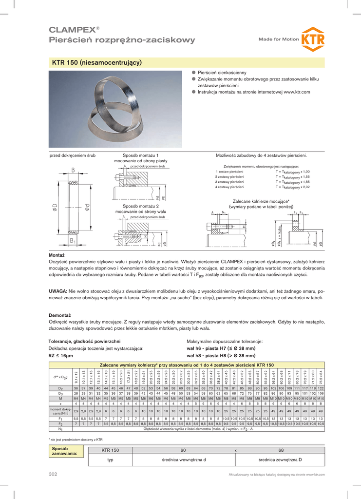 CLAMPEX® Pierścień rozprężno-zaciskowy KTR 150 (niesamocentrujący) zz Pierścień cienkościenny zz Zwiększanie momentu obrotowego przez zastosowanie kilku zestawów pierścieni zz Instrukcja montażu na stronie internetowej www.ktr.com przed dokręceniem śrub Sposób montażu 1 mocowanie od strony piasty Możliwość zabudowy do 4 zestawów pierścieni. przed dokręceniem śrub Zwiększenie momentu obrotowego jest następujące: 1 zestaw pierścieni 2 zestawy pierścieni T = Tkatalogowy x 1,00 T = Tkatalogowy x 1,55 3 zestawy pierścieni T = Tkatalogowy x 1,85 4 zestawy pierścieni T = Tkatalogowy x 2,02 Zalecane kołnierze mocujące* (wymiary podano w tabeli poniżej) Sposób montażu 2 mocowanie od strony wału z = liczba przed dokręceniem śrub Montaż Oczyścić powierzchnie stykowe wału i piasty i lekko je naoliwić. Włożyć pierścienie CLAMPEX i pierścień dystansowy, założyć kołnierz mocujący, a następnie stopniowo i równomiernie dokręcać na krzyż śruby mocujące, aż zostanie osiągnięta wartość momentu dokręcenia odpowiednia do wybranego rozmiaru śruby. Podane w tabeli wartości T i Fax, zostały obliczone dla montażu naoliwionych części. UWAGA: Nie wolno stosować oleju z dwusiarczkiem molibdenu lub oleju z wysokociśnieniowymi dodatkami, ani też żadnego smaru, ponieważ znacznie obniżają współczynnik tarcia. Przy montażu „na sucho” (bez oleju), parametry dokręcania różnią się od wartości w tabeli. Demontaż Odkręcić wszystkie śruby mocujące. Z reguły następuje wtedy samoczynne zluzowanie elementów zaciskowych. Gdyby to nie nastąpiło, zluzowanie należy spowodować przez lekkie ostukanie młotkiem, piasty lub wału. Tolerancje, gładkość powierzchni Maksymalne dopuszczalne tolerancje: Dokładna operacja toczenia jest wystarczająca: wał h6 - piasta H7 (≤ Ø 38 mm) RZ ≤ 16µm wał h8 - piasta H8 (> Ø 38 mm) 18,2 x 22 19,2 x 24 20,2 x 25 22,2 x 26 24,2 x 28 25,2 x 30 28,2 x 32 30,2 x 35 32,2 x 36 35,2 x 40 36,2 x 42 38,2 x 44 40,2 x 45 42,2 x 48 45,2 x 52 48,2 x 55 50,2 x 57 55,2 x 62 45 46 47 48 52 53 54 56 58 60 63 64 68 70 72 78 81 85 88 90 95 102 106 109 111 117 118 122 35 36 37 38 39 42 43 44 45 48 50 53 54 58 60 62 65 68 72 75 77 82 M M4 M4 M4 M4 M5 M5 M5 M5 M5 M6 M6 M6 M6 M6 M6 M6 M6 M6 M6 M6 M8 M8 M8 M8 M8 M8 M10 M10 M10 M10 M10 M10 M10 z 4 4 4 4 moment dokrę2,9 2,9 2,9 2,9 cania [Nm] F1 F2 5,5 5,5 5,5 5,5 7 7 7 7 4 4 4 4 4 4 4 4 4 4 4 4 5 6 6 6 6 6 6 6 6 10 10 10 10 10 10 10 10 10 10 10 7 7 7 7 7 8 8 8 8 8 8 8 8 8 8 8 86 90 93 75,2 x 84 17,2 x 21 44 32 71,2 x 80 16,2 x 20 40 31 70,2 x 79 15,1 x 19 39 29 65,2 x 73 14,1 x 18 37 28 63,2 x 71 13,1 x 16 36 60,2 x 68 12,1 x 15 D2 D3 dH8 x Dg7 56,2 x 64 9,1 x 12 10,1 x 13 Zalecane wymiary kołnierzy* przy stosowaniu od 1 do 4 zestawów pierścieni KTR 150 95 101 102 106 4 4 6 8 8 8 6 6 6 6 8 8 8 25 25 25 25 25 25 49 49 49 49 49 49 49 10,5 10,5 10,5 10,5 10,5 10,5 13 13 13 13 13 13 13 8,5 8,5 8,5 8,5 8,5 8,5 8,5 8,5 8,5 8,5 8,5 8,5 8,5 8,5 8,5 9,5 9,5 9,5 9,5 9,5 9,5 9,5 10,5 10,5 10,5 10,5 10,5 10,5 10,5 N1 Głębokość wiercenia wynika z ilości elementów (maks. 4) i wymiaru = F2 - A. * nie jest przedmiotem dostawy z KTR Sposób zamawiania: 302 KTR 150 60 typ średnica wewnętrzna d x 68 średnica zewnętrzna D Aktualizowany na bieżąco katalog dostępny na stronie www.ktr.com