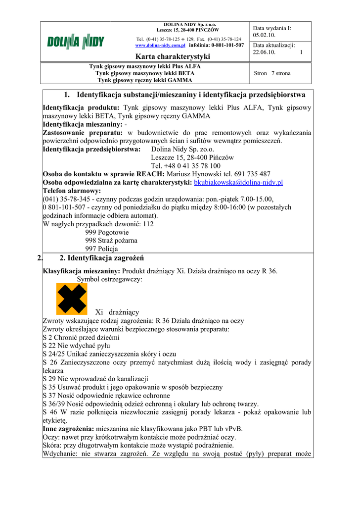 DOLINA NIDY Sp. z o.o. Leszcze 15, 28-400 PIŃCZÓW Tel. (0-41) 35-78-125 ÷ 129, Fax. (0-41) 35-78-124 www.dolina-nidy.com.pl infolinia: 0-801-101-507 Karta charakterystyki Tynk gipsowy maszynowy lekki Plus ALFA Tynk gipsowy maszynowy lekki BETA Tynk gipsowy ręczny lekki GAMMA Data wydania I: 05.02.10. Data aktualizacji: 1 22.06.10. Stron 7 strona 1. Identyfikacja substancji/mieszaniny i identyfikacja przedsiębiorstwa Identyfikacja produktu: Tynk gipsowy maszynowy lekki Plus ALFA, Tynk gipsowy maszynowy lekki BETA, Tynk gipsowy ręczny GAMMA Identyfikacja mieszaniny: Zastosowanie preparatu: w budownictwie do prac remontowych oraz wykańczania powierzchni odpowiednio przygotowanych ścian i sufitów wewnątrz pomieszczeń. Identyfikacja przedsiębiorstwa: Dolina Nidy Sp. zo.o. Leszcze 15, 28-400 Pińczów Tel. +48 0 41 35 78 100 Osoba do kontaktu w sprawie REACH: Mariusz Hynowski tel. 691 735 487 Osoba odpowiedzialna za kartę charakterystyki: [email protected] Telefon alarmowy: (041) 35-78-345 - czynny podczas godzin urzędowania: pon.-piątek 7.00-15.00, 0 801-101-507 - czynny od poniedziałku do piątku między 8:00-16:00 (w pozostałych godzinach informacje odbiera automat). W nagłych przypadkach dzwonić: 112 999 Pogotowie 998 Straż pożarna 997 Policja 2. 2. Identyfikacja zagrożeń Klasyfikacja mieszaniny: Produkt drażniący Xi. Działa drażniąco na oczy R 36. Symbol ostrzegawczy: Xi drażniący Zwroty wskazujące rodzaj zagrożenia: R 36 Działa drażniąco na oczy Zwroty określające warunki bezpiecznego stosowania preparatu: S 2 Chronić przed dziećmi S 22 Nie wdychać pyłu S 24/25 Unikać zanieczyszczenia skóry i oczu S 26 Zanieczyszczone oczy przemyć natychmiast dużą ilością wody i zasięgnąć porady lekarza S 29 Nie wprowadzać do kanalizacji S 35 Usuwać produkt i jego opakowanie w sposób bezpieczny S 37 Nosić odpowiednie rękawice ochronne S 36/39 Nosić odpowiednią odzież ochronną i okulary lub ochronę twarzy. S 46 W razie połknięcia niezwłocznie zasięgnij porady lekarza - pokaż opakowanie lub etykietę. Inne zagrożenia: mieszanina nie klasyfikowana jako PBT lub vPvB. Oczy: nawet przy krótkotrwałym kontakcie może podrażniać oczy. Skóra: przy długotrwałym kontakcie może wystąpić podrażnienie. Wdychanie: nie stwarza zagrożeń. Ze względu na swoją postać (pyły) preparat może DOLINA NIDY Sp. z o.o. Leszcze 15, 28-400 PIŃCZÓW Tel. (0-41) 35-78-125 ÷ 129, Fax. (0-41) 35-78-124 www.dolina-nidy.com.pl infolinia: 0-801-101-507 Karta charakterystyki Tynk gipsowy maszynowy lekki Plus ALFA Tynk gipsowy maszynowy lekki BETA Tynk gipsowy ręczny lekki GAMMA Data wydania I: 05.02.10. Data aktualizacji: 2 22.06.10. Stron 7 strona mechanicznie podrażniać układ oddechowy. Zagrożenia dla środowiska: w przypadku przedostania się do wód gruntowych w zależności od stężenia może zmienić pH wody. Wymieszany z odpadami organicznymi powoduje powstawanie SO2, który jest odpowiedzialny za powstawanie kwaśnych deszczów. W kontakcie z wodą twardnieje i zestala się. Klasyfikację przeprowadzono zgodnie z kryteriami zawartymi w Rozporządzeniu Ministra Zdrowia z dnia 4 września 2007 r. [Dz. U. 07 nr 174 poz. 1222]. 3. Skład/ informacja o składnikach Skład: siarczan wapnia [CaSO4], wodorotlenek wapnia [Ca(OH)2], węglan wapnia [CaCO3], dodatki i domieszki modyfikujące. Substancje wchodzące w skład preparatu, dla których określono najwyższe dopuszczalne stężenie w środowisku pracy (wymagania krajowe) oraz niebezpieczne składniki: Składniki Węglan wapnia Siarczan wapnia Wodorotlenek wapnia • nr CAS 471-34-1 7778-18-9 1305-62-0 nr WE 231-900-3 215-137-3 Symbol ostrzegawczy Xi R 41/37/38* Zawartość w % 20-40 % 50- 70 % 1-5 % - Objaśnienia zwrotów R w rozdziale 16 karty. Inne informacje: Składniki preparatu nie figurują w wykazach substancji niebezpiecznych oraz w wykazie substancji stwarzających szczególne zagrożenie dla środowiska. Do klasyfikacji przyjęto rzeczywistą zawartość składników niebezpiecznych. Wartości NDS według przepisów krajowych składników preparatu podano w pkt. 8. 4. Pierwsza pomoc W przypadku wystąpienia jakichkolwiek niepokojących objawów wezwać lekarza lub odwieźć poszkodowanego do szpitala, pokazać opakowanie lub etykietę. Instrukcje postępowania w zależności od drogi narażenia: Kontakt z oczami: działa drażniąco, powoduje zaczerwienienie, podrażnienie, pieczenie oczu, zapalenie spojówek, również przy krótkotrwałym kontakcie, w przypadku podrażnienia usunąć szkła kontaktowe, jeśli są i natychmiast opłukać oczy dużą ilością czystej wody przez 15 minut, podczas płukania trzymać szeroko otwarte oczy, jeśli podrażnienie utrzymuje się skonsultować się z lekarzem. Kontakt ze skórą: przy długotrwałym kontakcie może powodować odtłuszczenie skóry, podrażnienie, zaczerwienienie, w przypadku podrażnienia zanieczyszczoną skórę przetrzeć na sucho a następnie spłukać obficie czystą wodą z mydłem. Przy wdychaniu: w przypadku niewłaściwego stosowania i wywołania chmury pyłu może powodować podrażnienie górnych dróg oddechowych i śluzówek, unikać wzniecania pyłu, w przypadku podrażnienia wyprowadzić na świeże powietrze i obserwować, w razie konieczności skonsultować się z lekarzem. Wskazówki dla lekarza: stosować leczenie objawowe. 5. Postępowanie w przypadku pożaru Palność: preparat jest niepalny. Zalecane środki gaśnicze: stosować środki gaśnicze odpowiednie dla płonącego otoczenia. Niewskazane środki gaśnicze: silny strumień wody. Produkt twardnieje w kontakcie DOLINA NIDY Sp. z o.o. Leszcze 15, 28-400 PIŃCZÓW Tel. (0-41) 35-78-125 ÷ 129, Fax. (0-41) 35-78-124 www.dolina-nidy.com.pl infolinia: 0-801-101-507 Karta charakterystyki Tynk gipsowy maszynowy lekki Plus ALFA Tynk gipsowy maszynowy lekki BETA Tynk gipsowy ręczny lekki GAMMA Data wydania I: 05.02.10. Data aktualizacji: 3 22.06.10. Stron 7 