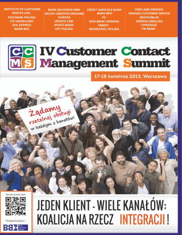 INSTITUTE OF CUSTOMER SERVICE (UK) PKO BANK POLSKA CITI HANDLOWY DHL EXPRESS BANK BGŻ BANK ZACHODNI WBK CREDIT AGRICOLE BANK BANK BPH GRUPA UBEZPIECZENIOWA P4 EUROPA UPDATE CRM IDEA BANK UKRAINA INVEST-BANK VERINT UPC POLSKA WHIRLPOOL POLSKA ORIFLAME SWEDEN ORANGE CUSTOMER SERVICE REDFOXBLUE ENERGA OBSŁUGA I SPRZEDAŻ FM BANK IV Customer Contact Management Summit 17-18 kwietnia 2013, Warszawa y i m a sług Ż ąd ej n l e t e ob ów! ł a n z ka rz m y żd w ka 1 d o m arca do marca 1000 zł T ANIEJ TANIEJ forum-ccms.com Organizator: IV Customer Contact Management Summit Zapraszamy do udziału w IV edycji CUSTOMER CONTACT MANAGEMENT SUMMIT Jedyne na polskim rynku Forum praktyków zarządzających wszystkimi kanałami sprzedaży i kontaktu z klientem W tym roku skoncentrujemy się na tym jak zintegrować kanały, by stać się w pełni multikanałową organizacją, wychodzącą naprzeciw oczekiwaniom klienta R ola kanałów kontaktu zmienia się i ewoluuje na przestrzeni ostatnich lat w odpowiedzi na oczekiwania klientów. Poza dostępem do swych usługodawców wszystkimi kanałami, aktualnych danych dotyczących operacji, szybkich reakcji i bezproblemowego przebiegu komunikacji klienci oczekują pomocy, która odkrywa ich potrzeby i wychodzi im naprzeciw. Zmiana znaczenia kontaktu offline na rzecz online, rosnący udział mobile, potrzeba redefinicji contact center i integracji social media z platformą centrum kontaktowego wymaga natychmiastowej weryfikacji strategii channel management, wyeliminowania skutków konkurencji między kanałami a w końcu, stworzenia prawdziwie funkcjonujących multikanałowych organizacji. Nadchodząca, czwarta już edycja dorocznego Customer Contact Management Summit będzie jedyną na polskim rynku możliwością zmierzenia się z największymi wyzwaniami w obszarze tradycyjnych i zdalnych kanałów kontaktu z klientem. Serdecznie zapraszam. Paulina Pyc WIĘCEJ INFORMACJI O WYDARZENIU Paulina Pyc Project Manager tel. +48 12 350 54 02 [email protected] O WSPÓŁPRACY W ZAKRESIE SPONSORINGU Anna Chrobot B4B Communications Manager tel. +48 22 256 70 35 [email protected] PROFIL UCZESTNIKÓW FORUM ZŁOCI SPONSORZY: Founded in 1976, CGI is a global IT and business process services provider delivering high-quality business consulting, systems integration and outsourcing services. With 71,000 professionals in 40 countries, CGI has an industry-leading track record of successfully performed projects in the field of multichannel strategies and implementation of event based real-time marketing. Vergic is a leading Swedish software company specialized in e-commerce and customer service online. We help companies and public organizations optimize and increase sales and consumer experience within their online world. Our platform offers relevant and targeted engagement possibilities to each unique visitor using real time communication as if it was a real life meeting. 38% Dyrektorzy Contact Center, Obsługi Klienta i Sprzedaży 25% Dyrektorzy ds. Internetu, e-Business, Alternatywnych Kanałów Sprzedaży 17% Dyrektorzy CRM i Rozwoju Relacji z Klientem 11% 9% Dyrektorzy i Kierownicy ds. Telemarketingu, Telesprzedaży Inne Źródło: Trzy edycje Customer Contact Management Summit zorganizowane przez Blue Business Media Złoty sponsor: Sponsorzy srebrni: Sponsorzy: Partnerzy: Wystawca: Patroni medialni: IV Customer Contact Management Summit PROGRAM - DZIEŃ PIERWSZY 9:30 Rejestracja i poranna kawa 17 KWIETNIA 2013, ŚRODA 10:15 Jo Causon, CEO, Institute of Customer Service UK SESJA PLENARNA 10:00 · · · Powitanie uczestników i słowo wstępu Andrzej Szczepaniak, Zastępca Dyrektora ds. Relacji z Klientami, Bank Zachodni WBK Jak mierzyć i osiągnąć pozytywne ROI z wysiłków włożonych w obsługę klienta (MULTI)CHANNEL MANAGEMENT 11:15 Jędrzej Kawecki, Dyrektor ds. Serwisu i Obsługi Klienta dla Polski i Krajów Bałtyckich, Whirlpool Polska · · 11:50 · · Nowe trendy w obsłudze klienta: grywalizacja i social media 11:50 12:10 Lunch 13:10 Budowa strategii multikanałowości od podstaw – warunki sukcesu Przemysław Ćwikła, Dyrektor Departamentu Sprzedaży Bezpośredniej, Grupa Ubezpieczeniowa Europa ROI w obsłudze klienta, czyli co mierzalne i "niemierzalne" elementy procesu obsługi klienta Michał Szybalski, Business Solutions Manager, Comarch Jak osiągnąć równowagę między satysfakcją klienta a produktywnością, czyli kosztem naszych działań z uwzględnieniem wpływu satysfakcji pracowników CC na efektywność Call Center jako wykonawca strategii Customer Experience i the Voice of the Customer Marta Wojewnik, Dyrektor ds. Obsługi Klienta Międzynarodowego, DHL Express · · 14:20 Pante Detsikas, Regional Sales Director, Update Software AG · · 13:10 wartość głosu klienta – wskaźniki jakościowe i ilościowe to za mało klient w centrum zainteresowania – znaczenie kultury całej organizacji dla powodzenia budowania przewagi rynkowej na bazie głosu klienta 15:10 Wykorzystanie bankowości elektronicznej dla budowania relacji z klientem w oparciu o „multichannel strategy” Tomasz Kowalski, Dyrektor Departamentu Produktów Elektronicznych i Wirtualnych, Bank BGŻ · Marcin Szóstak, Dyrektor Strategii i Relacji z Klientami, Orange Customer Service · nowy kanał obsługi – jak sobie poradzić z nowymi wyzwaniami w budowaniu relacji z klientami 13:45 14:55 Przerwa na kawę how to build strong relationships with your customers in a situation of constant change and unpredictability of the market how to cover all essential CRM processes with strong focus on your unique industry expectations 12:10 Lunch Media społecznościowe – nowy kanał obsługi, nowe wyzwania · multikanałowość jako nieodzowny kierunek rozwoju jak doprowadzić do tego by przychody przewyższyły koszty How to increase your sales and marketing effectiveness using the best multichannel solutions Katarzyna Brzozowska, Customer Service Manager EMEA, Oriflame Sweden 