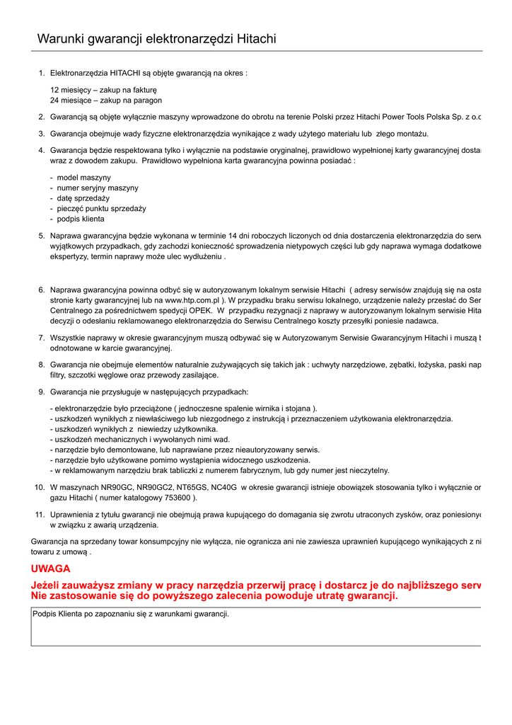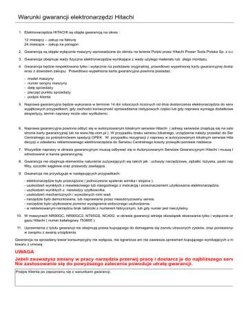 Warunki gwarancji elektronarzędzi Hitachi 1. Elektronarzędzia HITACHI są objęte gwarancją na okres : 12 miesięcy – zakup na fakturę 24 miesiące – zakup na paragon 2. Gwarancją są objęte wyłącznie maszyny wprowadzone do obrotu na terenie Polski przez Hitachi Power Tools Polska Sp. z o.o. 3. Gwarancja obejmuje wady fizyczne elektronarzędzia wynikające z wady użytego materiału lub złego montażu. 4. Gwarancja będzie respektowana tylko i wyłącznie na podstawie oryginalnej, prawidłowo wypełnionej karty gwarancyjnej dostarczonej wraz z dowodem zakupu. Prawidłowo wypełniona karta gwarancyjna powinna posiadać : - model maszyny numer seryjny maszyny datę sprzedaży pieczęć punktu sprzedaży podpis klienta 5. Naprawa gwarancyjna będzie wykonana w terminie 14 dni roboczych liczonych od dnia dostarczenia elektronarzędzia do serwisu .W wyjątkowych przypadkach, gdy zachodzi konieczność sprowadzenia nietypowych części lub gdy naprawa wymaga dodatkowej ekspertyzy, termin naprawy może ulec wydłużeniu . 6. Naprawa gwarancyjna powinna odbyć się w autoryzowanym lokalnym serwisie Hitachi ( adresy serwisów znajdują się na ostatniej stronie karty gwarancyjnej lub na www.htp.com.pl ). W przypadku braku serwisu lokalnego, urządzenie należy przesłać do Serwisu Centralnego za pośrednictwem spedycji OPEK. W przypadku rezygnacji z naprawy w autoryzowanym lokalnym serwisie Hitachi i decyzji o odesłaniu reklamowanego elektronarzędzia do Serwisu Centralnego koszty przesyłki poniesie nadawca. 7. Wszystkie naprawy w okresie gwarancyjnym muszą odbywać się w Autoryzowanym Serwisie Gwarancyjnym Hitachi i muszą być odnotowane w karcie gwarancyjnej. 8. Gwarancja nie obejmuje elementów naturalnie zużywających się takich jak : uchwyty narzędziowe, zębatki, łożyska, paski napę filtry, szczotki węglowe oraz przewody zasilające. 9. Gwarancja nie przysługuje w następujących przypadkach: - elektronarzędzie było przeciążone ( jednoczesne spalenie wirnika i stojana ). - uszkodzeń wynikłych z niewłaściwego lub niezgodnego z instrukcją i przeznaczeniem użytkowania elektronarzędzia. - uszkodzeń wynikłych z niewiedzy użytkownika. - uszkodzeń mechanicznych i wywołanych nimi wad. - narzędzie było demontowane, lub naprawiane przez nieautoryzowany serwis. - narzędzie było użytkowane pomimo wystąpienia widocznego uszkodzenia. - w reklamowanym narzędziu brak tabliczki z numerem fabrycznym, lub gdy numer jest nieczytelny. 10. W maszynach NR90GC, NR90GC2, NT65GS, NC40G w okresie gwarancji istnieje obowiązek stosowania tylko i wyłącznie oryginalneg gazu Hitachi ( numer katalogowy 753600 ). 11. Uprawnienia z tytułu gwarancji nie obejmują prawa kupującego do domagania się zwrotu utraconych zysków, oraz poniesionych kosztó w związku z awarią urządzenia. Gwarancja na sprzedany towar konsumpcyjny nie wyłącza, nie ogranicza ani nie zawiesza uprawnień kupującego wynikających z niezgodno towaru z umową . UWAGA Jeżeli zauważysz zmiany w pracy narzędzia przerwij pracę i dostarcz je do najbliższego serwisu. Nie zastosowanie się do powyższego zalecenia powoduje utratę gwarancji. Podpis Klienta po zapoznaniu się z warunkami gwarancji.
