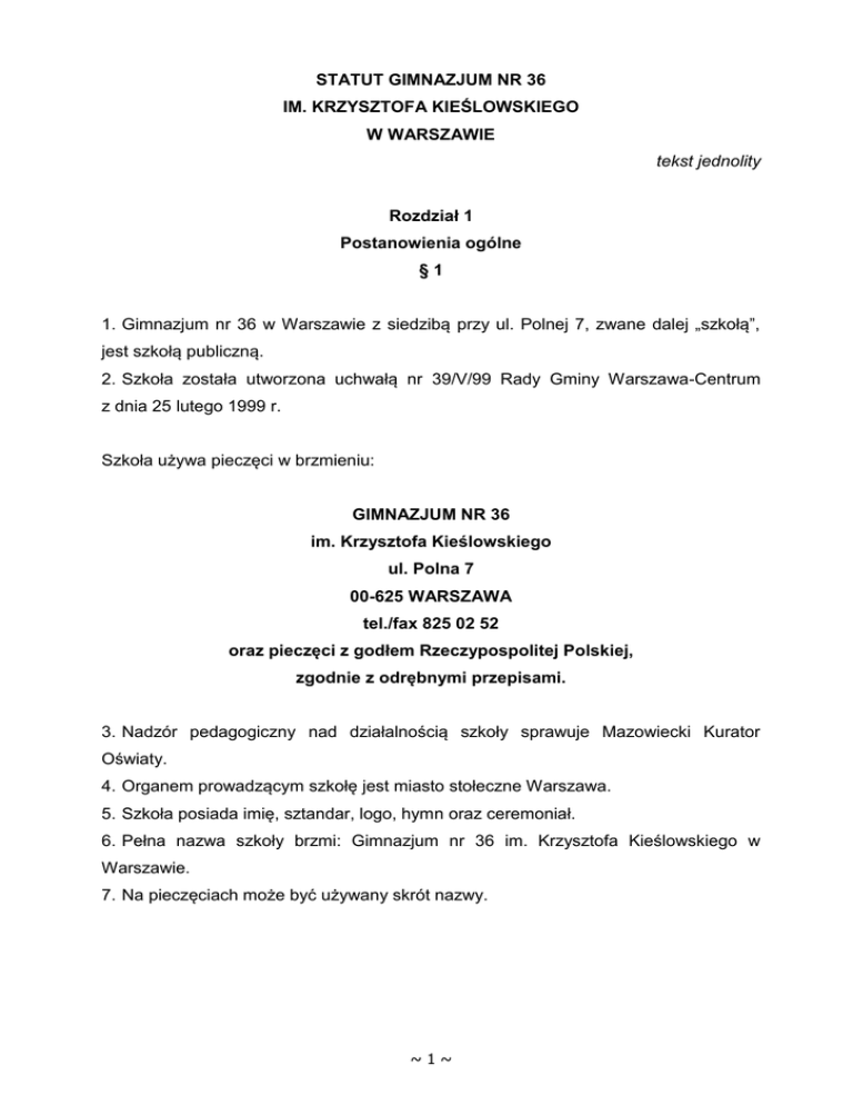 STATUT GIMNAZJUM NR 36 IM. KRZYSZTOFA KIEŚLOWSKIEGO W WARSZAWIE tekst jednolity Rozdział 1 Postanowienia ogólne §1 1. Gimnazjum nr 36 w Warszawie z siedzibą przy ul. Polnej 7, zwane dalej „szkołą”, jest szkołą publiczną. 2. Szkoła została utworzona uchwałą nr 39/V/99 Rady Gminy Warszawa-Centrum z dnia 25 lutego 1999 r. Szkoła używa pieczęci w brzmieniu: GIMNAZJUM NR 36 im. Krzysztofa Kieślowskiego ul. Polna 7 00-625 WARSZAWA tel./fax 825 02 52 oraz pieczęci z godłem Rzeczypospolitej Polskiej, zgodnie z odrębnymi przepisami. 3. Nadzór pedagogiczny nad działalnością szkoły sprawuje Mazowiecki Kurator Oświaty. 4. Organem prowadzącym szkołę jest miasto stołeczne Warszawa. 5. Szkoła posiada imię, sztandar, logo, hymn oraz ceremoniał. 6. Pełna nazwa szkoły brzmi: Gimnazjum nr 36 im. Krzysztofa Kieślowskiego w Warszawie. 7. Na pieczęciach może być używany skrót nazwy. ~1~ §2 uchylono §3 1. Umożliwiając realizację obowiązku szkolnego, szkoła: 1) zapewnia bezpłatne nauczanie w ramach ustalonych planów nauczania w trzyletnim cyklu kształcenia, 2) przyjmuje uczniów z rejonu określonego przez organ prowadzący, którzy ukończyli kl. VI szkoły podstawowej, 3) przyjmuje uczniów spoza rejonu pod warunkiem, że szkoła dysponuje wolnymi miejscami, 4) zatrudnia nauczycieli i innych pracowników posiadających kwalifikacje określone w odrębnych przepisach, 5) realizuje ustalone przez ministra właściwego do spraw oświaty zasady oceniania, klasyfikowania i promowania uczniów oraz opracowane na ich podstawie zasady szkolnego oceniania, 6) realizuje opracowany na dany rok Program Wychowawczy i Program Profilaktyki uchwalony przez Radę Rodziców w porozumieniu z Radą Pedagogiczną, 7) realizuje program doradztwa zawodowego, 8) rozpoczyna i kończy zajęcia dydaktyczne z uwzględnieniem przerw i ferii, zgodnie z przepisami w sprawie organizacji roku szkolnego oraz dokonuje klasyfikowania uczniów w dwóch terminach: śródroczne w ostatnim tygodniu stycznia i roczne w ostatnim tygodniu przed zakończeniem zajęć edukacyjnych. Rozdział 2 Cele i zadania szkoły oraz zasady dotyczące bezpieczeństwa §4 1.Szkoła realizuje cele i zadania określone w ustawie o systemie oświaty oraz w przepisach wykonawczych wydanych na jej podstawie, a także w Programie Profilaktyki i Programie Wychowawczym, a w szczególności: 1) umożliwia zdobycie wiedzy i umiejętności niezbędnych do uzyskania świadectwa ukończenia gimnazjum poprzez atrakcyjny i nowatorski proces nauczania; ~2~ 2) kształtuje środowisko wychowawcze sprzyjające realizowaniu celów i zasad określonych w ustawie, stosownie do warunków szkoły i wieku ucznia dzięki: a) zapewnieniu odpowiedniej bazy dla uczniów, b) systematycznemu diagnozowaniu zachowań uczniów, c) realizowaniu programu wychowawczego szkoły ustalonego przez organy szkoły. 3) sprawuje opiekę nad uczniami odpowiednio do ich potrzeb; opieka i zajęcia dodatkowe prowadzone są w miarę posiadanych środków finansowych i warunków technicznych; 4) szkoła prowadzi warsztaty i spotkania teatralne we współpracy z instytucjami wspomagającymi szkołę: Strażą Miejską, Policją, zespołami teatralnymi w ramach szeroko pojętej profilaktyki; 5) szkoła przeciwdziała demoralizacji dzięki: a) prowadzeniu programów profilaktycznych i terapeutycznych dla dzieci z rodzin zagrożonych patologią, b) współpracy z Inspektoratami ds. Nieletnich przy Komendach Policji, kuratorami sądowymi, poradniami, c) współpracę ze specjalistycznymi fundacjami, d) organizację zajęć pozalekcyjnych. 6) szkoła realizuje zadania w szczególności dzięki: a) organizacji: obowiązkowych zajęć lekcyjnych, fakultatywnych zajęć pozalekcyjnych, uroczystości podtrzymujących tradycję szkoły, regionu i kraju, imprez rozrywkowych, wycieczek przedmiotowych i turystyczno-krajoznawczych, wyjazdów na „zielone szkoły”, zajęć profilaktycznych i terapeutycznych dla uczniów z rodzin zagrożonych patologią. b) umożliwieniu korzystania z: pomieszczeń do nauki szkolnej, biblioteki szkolnej i czytelni, zespołu urządzeń sportowych i rekreacyjnych. c) dostosowaniu treści, metod, form pracy i organizacji nauczania do możliwości psychofizycznych uczniów; ~3~ d) udzielaniu uczniom i ich rodzicom (opiekunom prawnym) pomocy pedagogicznej’ e) zapewnieniu uczniom przewlekle chorym indywidualnego toku nauczania w szkole lub w domu ucznia (zgodnie z obowiązującymi przepisami), za zgodą organu prowadzącego szkołę; f) umożliwieniu rozwoju zainteresowań, zdolności i talentów dzięki: udziałowi w zajęciach kół zainteresowań, pomocy w przygotowaniu do udziału w konkursach zewnątrzi wewnątrzszkolnych, olimpiadach przedmiotowych i zawodach sportowych, samokształcenie z wykorzystaniem zasobów bibliotecznych w formie papierowej i/lub elektronicznej. 2. Szkoła prowadzi dokumentację nauczania w formie dziennika elektronicznego, za który szkoła nie pobiera opłat od rodziców (prawnych opiekunów) §5 1. Szkoła zapewnia warunki bezpiecznego pobytu uczniów realizując zadania wynikające z Programu Profilaktyki i Programu Wychowawczego, uwzględniając obowiązujące przepisy bezpieczeństwa i higieny: 1) sprawowanie opieki nad uczniami przebywającymi w szkole podczas zajęć lekcyjnych i pozalekcyjnych przez osobę prowadzącą zajęcia; 2) zapewnienie opieki uczniom podczas wycieczek i zajęć poza terenem szkoły, zgodnie z obowiązującymi przepisami (Regulaminem Organizowania Wycieczek Szkolnych). 2) a. umożliwienie uczniom samodzielnego powrotu z wyjść edukacyjnych, wycieczek tylko i wyłącznie po otrzymaniu każdorazowo pisemnej zgody rodziców. 3) pełnienie przez nauczycieli obowiązkowych dyżurów porządkowych przed rozpoczęciem zajęć szkolnych oraz w czasie przerw międzylekcyjnych, zgodnie z Regulaminem Dyżurów; 4) sprawowanie opieki nad uczniami przebywającymi w szkole przez innych pracownikó
