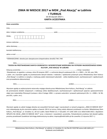 ZIMA W MIESCIE 2017 w MDK „Pod Akacją” w Lublinie I TURNUS 16-20 styczeń 2017 r. KARTA UCZESTNIKA Dane uczestnika: imię …........................................................................... nazwisko………………............................................................................................ data i miejsce urodzenia................................................................. wiek..................................................................................... PESEL: imiona rodziców ..................................................................................................................................................................................... adres domowy ........................................................................................................................................................................................ kontakt telefoniczny ............................................................................................................................................................................. adres e-mail ........................................………………………………………………………………..…………………………………………………………………………….. *OŚWIADCZENIE: dziecko jest ubezpieczone (niepotrzebne skreślić) TAK / NIE data………………………………………………………… podpis……………………………………………… *ZGODA NA PRZETWARZANIE DANYCH OSOBOWYCH I WYKORZYSTANIE WIZERUNKU NA POTRZEBY MŁODZIEŻOWEGO DOMU KULTURY ,,POD AKACJĄ” W LUBLINIE Dotyczą uczestnika ……………………………………………………………………………………………………………………….( Imię i nazwisko) Oświadczam, że zgodnie z ustawą z dnia 29 sierpnia 1997 r. o ochronie danych osobowych (Dz. U. z 2002 r., Nr 101, poz. 926, z późn. zm.) wyrażam zgodę na przetwarzanie danych dziecka i rodziców / opiekunów prawnych przez Młodzieżowy Dom Kultury „Pod Akacją” w Lublinie w związku z realizacją zadań statutowych placówki - celów dydaktycznych, wychowawczych i opiekuńczych oraz prowadzenia dokumentacji data………………………………………………………… podpis…………………………………………….. Wyrażam zgodę na wykorzystanie wizerunku mojego dziecka przez Młodzieżowy Dom Kultury „Pod Akacją” w Lublinie do promowania działań związanych z realizacją celów dydaktycznych, wychowawczych i opiekuńczych poprzez upowszechnianie zdjęć oraz materiałów filmowych (ustawa z dnia 4 lutego 1994 r. o prawie autorskim i prawach pokrewnych (Dz. U. z 2006 r. Nr 90, poz.631, z późn. zm.). data………………………………………………………… podpis……………………………………………… Wyrażam zgodę na udział mojego dziecka we wszystkich formach zajęć i wycieczkach w ramach programu „ZIMA W MIESCIE 2017” oraz zobowiązuję się do uiszczenia opłaty w kwocie 150 zł za turnus, którą należy dokonać przelewem na konto: Młodzieżowy Dom Kultury „Pod Akacją”, ul. Grodzka 11, 20-112 Lublin. Bank PEKAO S.A. V O/Lublin: 47 1240 1503 1111 0010 0148 3432 z dopiskiem WPŁATA NA AKCJĘ „ZIMA W MIESCIE 2017” wraz z imieniem i nazwiskiem uczestnika. Potwierdzenie przelewu lub dowód wpłaty prosimy przedstawić (osobiście lub drogą elektroniczną na adres: [email protected] do czwartku 12 stycznia 2017 r.) data………………………………………………………… podpis……………………………………………… Młodzieżowy Dom Kultury „Pod Akacją” w Lublinie, ul. Grodzka 11, tel./fax 81 5322740 www.mdk.lublin.pl • facebook.com/mdklublin