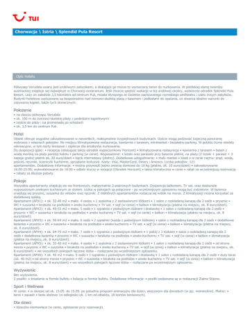 Chorwacja \ Istria \ Splendid Pula Resort Opis hotelu Półwysep Verudela usiany jest urokliwymi zatoczkami, a okalające go morze to wymarzony teren do nurkowania. W pobliskiej starej twierdzy austriackiej znajduje się największe w Chorwacji oceanarium. Jeśli chcecie spędzić wakacje w tej urokliwej okolicy, wybierzcie ośrodek Splendid Pula Resort. Leży on zaledwie 3,5 kilometra od centrum Puli, miasta słynącego ze świetnie zachowanego rzymskiego amfiteatru i wielu innych zabytków. Budynki hotelowe usytuowane są bezpośrednio nad żwirowo-skalistą plażą z basenem i podestami do opalania, co stwarza idealne warunki do zażywania kąpieli, także tych słonecznych. Położenie • • • • na zboczu półwyspu Verudela ok. 100 m do żwirowo-skalistej plaży z podestami kąpielowymi zejście do plaży i na promenadę po schodach ok. 3,5 km do centrum Puli. Hotel Obiekt oferuje wygodne zakwaterowanie w niewielkich, maksymalnie trzypiętrowych budynkach. Goście mogą podziwiać bajeczną panoramę wybrzeża z własnych pokojów. Na miejscu klimatyzowana restauracja, kawiarnia z tarasem, minimarket i bezpłatny parking. W pobliżu liczne obiekty rekreacyjne, w tym korty tenisowe i zaplecze dla amatorów nurkowania. Do dyspozycji gości: • recepcja (obsługuje także ośrodek wypoczynkowy Horizont) • klimatyzowana restauracja • kawiarnia z tarasem • basen z wodą morską na plaży poniżej hotelu • parking (w cenie). Wyposażenie: • leżaki oraz parasole przy basenie płatne, na plaży (2 leżaki + parasol + 2 napoje gratis) płatne ok. 20 euro/dzień • kącik internetowy (płatny). Dodatkowe udogodnienia: • mały market • kiosk • w cenie najmu: prąd, woda, pościel, ręczniki, ściereczki kuchenne, sprzątanie końcowe. Karty: Visa, MasterCard, Diners i Amexco. Liczba pokojów: 121 apartamentów. Dodatkowe informacje: • można przywieźć jedno zwierzę domowe do 10 kg (płatne, ok. 10 euro/dzień) • zakwaterowanie 16.00-23.00; wykwaterowanie do 10.00 • odbiór kluczy w recepcji (Ośrodek Horizont) • taksa klimatyczna w cenie • rabat za wcześniejszą rezerwację • rabaty za dłuższe pobyty. Pokoje Wszystkie apartamenty znajdują sie we frontowych, maksymalnie 3-piętrowych budynkach. Dysponują balkonem, TV sat. oraz doskonale wyposażonym aneksem kuchennym ze stołem. Łóżka w pokojach są połączone - po wcześniejszym zgłoszeniu mogą być rodzielone. W łazience znajdują się prysznic, suszarka do włosów oraz ręczniki. Z niektórych apartamentów roztacza się widok na morze. Z klimatyzacji można korzystać za dodatkową opłatą. Apartament (APX1): • ok. 32-40 m2 • maks. 4 osoby • 1 sypialnia z 2 zestawionymi łóżkami • 1 salon z rozkładaną kanapą dla 2 osób • prysznic • WC • suszarka • terakota na podłodze • aneks kuchenny • TV sat. • sejf (w cenie) • balkon • klimatyzacja (płatna na miejscu, ok. 8 euro/dzień). Apartament (APX2): • ok. 40-55 m2 • maks. 5 osób • 1 sypialnia z podwójnym łóżkiem i dostawką • 1 salon z rozkładaną kanapą dla 2 osób • prysznic • WC • suszarka • terakota na podłodze • aneks kuchenny • TV sat. • sejf (w cenie) • balkon • klimatyzacja (płatna na miejscu, ok. 8 euro/dzień). Apartament (APX3): • ok. 50-64 m2 • maks. 6 osób • 2 sypialnie (każda z podwójnym łóżkiem) • salon z rozkładaną kanapą dla 2 osób • dodatkowa łazienka • prysznic • WC • suszarka • terakota na podłodze • aneks kuchenny • TV sat. • sejf (w cenie) • balkon • klimatyzacja (płatna na miejscu, ok. 8 euro/dzień). Apartament (APX4): • ok. 64-75 m2 • maks. 7 osób • 1 sypialnia z podwójnym łóżkiem • 1 pokój z 3 łóżkami • salon z rozkładaną kanapą dla 2 osób • dodatkowa łazienka • prysznic • WC • suszarka • terakota na podłodze • aneks kuchenny • TV sat. • sejf (w cenie) • balkon • klimatyzacja (płatna na miejscu, ok. 8 euro/dzień). Apartament (APX5): • ok. 32-40 m2 • maks. 4 osoby • 1 sypialnia z 2 zestawionymi łóżkami • 1 salon z rozkładaną kanapą dla 2 osób • od strony morza • prysznic • WC • suszarka • terakota na podłodze • aneks kuchenny • TV sat. • sejf (w cenie) • balkon • klimatyzacja (płatna na miejscu, ok. 8 euro/dzień) • we wszystkich pokojach łączone łóżka – rozłączane po wcześniejszym zgłoszeniu. Apartament (APX6): • ok. 40 m2 • maks. 5 osób • 1 sypialnia z podwójnym łóżkiem i dostawką • 1 salon z rozkładaną kanapą dla 2 osób • duży taras (ok. 40 m2) • od strony morza • prysznic • WC • suszarka • terakota na podłodze • aneks kuchenny • TV sat. • sejf (w cenie) • balkon • klimatyzacja (płatna na miejscu, ok. 8 euro/dzień) • we wszystkich pokojach łączone łóżka – rozłączane po wcześniejszym zgłoszeniu. Wyżywienie Bez wyżywienia. 2 posiłki: • śniadanie w formie bufetu • kolacja w formie bufetu. Dodatkowe informacje: • posiłki podawane są w restauracji Zlatne Stijene. Sport i Wellness W cenie: • w okresie od ok. 15.05. do 15.09. po południu program animacyjny dla dzieci, wieczorem dla dorosłych (w jęz. niemieckim). Płatne: • tenis • squash • tenis stołowy (w odległości ok. 1 km od obiektu, 18 kortów tenisowych). Dla dzieci • łóżeczko niemowlęce (w cenie, zgłoszenie przy rezerwacji).