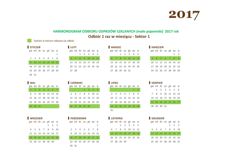 2017 HARMONOGRAM ODBIORU ODPADÓW SZKLANYCH (małe pojemniki) 2017 rok Odbiór 1 raz w miesiącu - Sektor 1 Tydzień w którym odbywa się odbiór. STYCZEŃ pn wt śr cz pt so n LUTY pn wt śr cz pt so n 1 4 5 6 7 8 6 7 1 2 3 4 8 9 10 11 12 MARZEC pn wt śr cz pt so n 5 6 7 1 2 3 4 8 9 10 11 12 KWIECIEŃ pn wt śr cz pt so n 5 3 4 5 6 7 1 2 8 9 2 3 9 10 11 12 13 14 15 13 14 15 16 17 18 19 13 14 15 16 17 18 19 10 11 12 13 14 15 16 16 17 18 19 20 21 22 20 21 22 23 24 25 26 20 21 22 23 24 25 26 17 18 19 20 21 22 23 23 24 25 26 27 28 29 27 28 27 28 29 30 31 24 25 26 27 28 29 30 30 31 MAJ pn wt śr cz pt so n 1 2 3 4 5 6 8 9 10 11 12 13 14 CZERWIEC pn wt śr cz pt so n 7 5 6 7 1 2 3 8 9 10 11 LIPIEC pn wt śr cz pt so n 4 3 4 5 6 7 1 2 8 9 SIERPIEŃ pn wt śr cz pt so n 7 1 2 3 4 5 6 8 9 10 11 12 13 15 16 17 18 19 20 21 12 13 14 15 16 17 18 10 11 12 13 14 15 16 14 15 16 17 18 19 20 22 23 24 25 26 27 28 19 20 21 22 23 24 25 17 18 19 20 21 22 23 21 22 23 24 25 26 27 29 30 31 26 27 28 29 30 24 25 26 27 28 29 30 28 29 30 31 31 WRZESIEŃ pn wt śr cz pt so n PAŹDZIERNIK pn wt śr cz pt so n LISTOPAD pn wt śr cz pt so n 1 2 3 8 9 10 2 3 11 12 13 14 15 16 17 9 10 11 12 13 14 15 13 14 15 16 17 18 19 11 12 13 14 15 16 17 18 19 20 21 22 23 24 16 17 18 19 20 21 22 20 21 22 23 24 25 26 18 19 20 21 22 23 24 25 26 27 28 29 30 23 24 25 26 27 28 29 27 28 29 30 25 26 27 28 29 30 31 4 5 6 7 1 30 31 4 5 6 7 8 6 7 1 2 3 8 9 10 11 12 4 GRUDZIEŃ pn wt śr cz pt so n 5 4 5 6 7 1 2 3 8 9 10