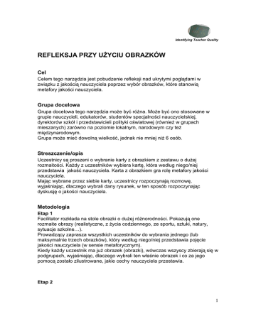 Identifying Teacher Quality REFLEKSJA PRZY UŻYCIU OBRAZKÓW Cel Celem tego narzędzia jest pobudzenie refleksji nad ukrytymi poglądami w związku z jakością nauczyciela poprzez wybór obrazków, które stanowią metafory jakości nauczyciela. Grupa docelowa Grupa docelowa tego narzędzia może być różna. Może być ono stosowane w grupie nauczycieli, edukatorów, studentów specjalności nauczycielskiej, dyrektorów szkół i przedstawicieli polityki oświatowej (również w grupach mieszanych) zarówno na poziomie lokalnym, narodowym czy też międzynarodowym. Grupa może mieć dowolną wielkość, jednak nie mniej niż 6 osób. Streszczenie/opis Uczestnicy są proszeni o wybranie karty z obrazkiem z zestawu o dużej rozmaitości. Każdy z uczestników wybiera kartę, która według niego/niej przedstawia jakość nauczyciela. Karta z obrazkiem gra rolę metafory jakości nauczyciela. Mając wybrane przez siebie karty, uczestnicy rozpoczynają rozmowę, wyjaśniając, dlaczego wybrali dany rysunek, w ten sposób rozpoczynając dyskusję o jakości nauczyciela. Metodologia Etap 1 Facilitator rozkłada na stole obrazki o dużej różnorodności. Pokazują one rozmaite obrazy (realistyczne, z życia codziennego, ze sportu, sztuki, natury, sytuacje szkolne…). Prowadzący zaprasza wszystkich uczestników do wybrania jednego (lub maksymalnie trzech obrazków), który według niego/niej przedstawia pojęcie jakości nauczyciela (w sensie metaforycznym). Kiedy każdy uczestnik ma już obrazek (obrazki), wówczas wszyscy zbierają się w podgrupach, wyjaśniając, dlaczego wybrali ten właśnie obrazek i co za jego pomocą zostało zilustrowane, jakie cechy nauczyciela przestawia. Etap 2 1 Identifying Teacher Quality W następnym etapie w pod(grupach) można podyskutować o tym, jakie elementy jakości zostały podkreślone przez różnych uczestników, wykorzystując pytania: Jakie cechy zostały podkreślone przez różnych uczestników? Jakie emocje pociągają one za sobą? Jakie rodzaje cech można dostrzec (np. umiejętności, postawy, itd.) Jakie różnice istnieją między uczestnikami? Czy te różnice są związane z różnicami pochodzenia czy doświadczenia (jak np. rodzaj szkoły, rola, narodowość, płeć, wiek, doświadczenie, środowisko kulturowe, itd.)? Etap 3 Z wszystkich cech podanych przez grupę można stworzyć zbiorczą listę. Uczestników prosi się o uszeregowanie cech pod względem ważności poprzez wybranie 10 cech, które są dla nich najważniejsze. Z połączenia indywidualnych list może powstać „wspólny standard” (zależnie od logicznej spójności listy: czy wynika z niej wspólne centrum listy, które akceptują prawie wszyscy uczestnicy?). Etap 4 Ostatecznie można zapytać uczestników o to, na ile mieszczą się w tym wspólnym centrum i jakie to niesie za sobą skutki dla ich planów rozwoju zawodowego. Warianty Ta metoda może być zmieniana na wiele sposobów: Może być przeprowadzona w bardziej osobisty/konfrontujący sposób poprzez zadanie na początku innego pytania: „wybierz obrazek, który najlepiej przedstawia to, jak widzisz swoją zawodową jakość”. Karty z obrazkami mogą być też wykorzystane do rozbudzenia zainteresowania i jako sposób na wzajemne poznanie się. Może też być zastosowana odnośnie różnych tematów: który obrazek wyobraża dobrą szkołę, twój zespół, twoją karierę zawodową… Kiedy karty są tak użyte, że są związane z sytuacjami w klasie, można zadać pytanie: „co stanie się potem?”. Można o tym podyskutować albo przedstawić w formie krótkiego odegrania ról. Kiedy jest duża liczba uczestników, w etapie 3 listę można opracowywać stopniowo: o Zacznijcie w parach, które stworzą wspólną listę 5 najważniejszych cech nauczycieli, w oparciu o wybrane wcześniej obrazki i dyskusję w etapie 2. o Dwie pary siadają razem, żeby porównać swoje najważniejsze piątki. Ich zadanie polega na przygotowaniu wspólnej najważniejszej piątki. 2 Identifying Teacher Quality o Dwie grupy czteroosobowe łączą się w grupę ośmioosobową, by porównać swoje najważniejsze piątki i sporządzić wspólną najważniejszą piątkę. o Itd. aż cała grupa osiągnie porozumienie. Kiedy w ostatniej fazie grupa jest duża, można z każdej podgrupy wyłonić negocjatorów do prowadzenia negocjacji. Źródła/teoria Wiele narzędzi refleksji jest skoncentrowanych na podejściu językowym: poprzez czytanie, pisanie, dyskusję i ustne prezentacje. To podejście językowe często stymuluje procesy poznawcze i analityczne. Użycie obrazów może zachęcić do refleksji oddziałując na inne zmysły. W tym wypadku punktem wyjścia będą osobiste odczucia, przekonania i doświadczenia. Miles, S. & Kaplan, I. (2005) Using images to promote reflection: an action research study in Zambia and Tanzania (Użycie obrazów dla pobudzenia refleksji: studia badawcze w działaniu w Zambii i Tanzanii). In Journal of Research in Special Educational Needs, Vol 5, No 2, pp 77-83. Warunki Kiedy pytania i dyskusja przebiega na bardziej na osobistym poziomie (np. „wybierz obrazek, który najlepiej przedstawia to, jak widzisz swoją zawodową jakość”, ważne jest, żeby uczestnicy mieli poczucie bezpieczeństwa i żeby istniało wspólne zrozumienie i zaufanie. Materiały Zestaw kart z obrazkami. Mogą być gotowe (np. http://www.managementboek.nl/boekeninfo.asp?CODE=rocqqqqqcbihr&RefererI D=NHP_int) lub można je przygotować samemu (zbierając widokówki, wyszukując w Internecie itd.). Rodzaje obrazków mogą się różnić w zależności od zamierzonego typu refleksji. Obrazy mogą być metaforyczne (np. spadochron, kaktus, zwierzęta, balony, itd.) lub bardziej dotyczyć rzeczywistych sytuacji w klasie, pokazujących nauczycieli i uczniów. Mocne i słabe strony Mocne strony: Refleksja w oparciu o karty z obrazkami jest łatwa w użyciu i elastyczna. Może być wykorzystana jako wstęp, do rozbud