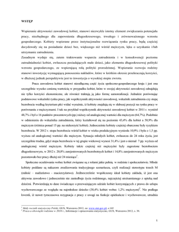 WSTĘP Wspieranie aktywności zawodowej kobiet, stanowi niezwykle istotny element zwiększania potencjału pracy, niezbędnego dla zapewnienia długookresowego, trwałego i zrównoważonego wzrostu gospodarczego. Kobiety wspierane przez instytucjonalne rozwiązania rynku pracy, będą częściej decydowały się na posiadanie dzieci bez, większego niż wśród mężczyzn, lęku o uzyskanie i/lub utrzymanie zatrudnienia. Zasadnym wydaje się, zatem traktowanie wsparcia zatrudnienia i w konsekwencji poziomu zatrudnialności kobiet, zwłaszcza posiadających małe dzieci, jako elementu długookresowej polityki wzrostu gospodarczego, ze wspierającą rolą polityki prorodzinnej. Wspieranie rozwoju rodziny stanowi inwestycję wymagającą ponoszenia nakładów, które w krótkim okresie przekraczają korzyści, w dłuższej jednak perspektywie jest to inwestycja o wysokiej stopie zwrotu. Praca zawodowa kobiet stanowi nieodłączną część życia społeczno-gospodarczego kraju i jest ona szczególnie wysoko cenioną wartością w przypadku kobiet, które w swojej aktywności zawodowej odnajdują nie tylko korzyści ekonomiczne, ale również traktują ją jako formę samorealizacji. Jednakże porównując podstawowe wskaźniki rynku pracy, jak współczynnik aktywności zawodowej, wskaźnik zatrudnienia czy stopę bezrobocia według kryterium płci widać wyraźnie, iż kobiety znajdują się w słabszej pozycji na rynku pracy w porównaniu z mężczyznami. I tak na przykład współczynnik aktywności zawodowej kobiet w 2011 r. wyniósł 48,7% i był o 16 punktów procentowych (pp.) niższy od analogicznej wartości dla mężczyzn (64,7%). Podobnie w odniesieniu do wskaźnika zatrudnienia, który kształtował się na poziomie 43,4% dla kobiet a 58,9% dla mężczyzn (różnica ponad 15 pp. na niekorzyść kobiet). Jednocześnie kobiety częściej obarczone były ryzykiem bezrobocia. W 2012 r. stopa bezrobocia wśród kobiet w wieku produkcyjnym wyniosła 10,9% i była o 1,5 pp. wyższa od analogicznej wartości dla mężczyzn. Sytuacja młodych kobiet, zwłaszcza do 24 roku życia, jest szczególnie trudna, gdyż stopa bezrobocia w tej grupie wiekowej wynosi 31,4% i jest o niemal 7 pp. wyższa od analogicznej wśród mężczyzn. Kobiety także częściej niż mężczyźni były zagrożone bezrobociem długookresowym, w 2012 r. 20,8% zarejestrowanych bezrobotnych kobiet i 14,8% zarejestrowanych mężczyzn pozostawało bez pracy dłużej niż 24 miesiące1. Społeczne oczekiwania wobec kobiet związane są z rolami jakie pełnią w rodzinie i społeczeństwie. Młode kobiety poddane są nakazom zrealizowania tradycyjnego scenariusza, czyli realizacji stereotypu trzech M (miłość – małżeństwo - macierzyństwo). Jednocześnie współczesny ideał kobiety zakłada, iż jest ona aktywna zawodowo i jednocześnie nie zaniedbuje życia rodzinnego, najczęściej utożsamianego z opieką nad dziećmi. Potwierdzają to dane świadczące o przeważającym udziale kobiet korzystających z prawa do urlopu wychowawczego ze względu na najmłodsze dziecko (38,4% kobiet wobec 1,2% mężczyzn)2. Nie podlega kwestii, iż nawet tymczasowa rezygnacja z pracy z uwagi na funkcje opiekuńcze i wychowawcze, utrudnia 1 2 Mały rocznik statystyczny Polski, GUS, Warszawa 2012, za: www.stat.gov.pl, s.165 Praca a obowiązki rodzinne w 2010 r., Informacje i opracowania statystyczne, GUS, Warszawa 2012, s. 38. 1 powrót kobiet na rynek pracy. Są one postrzegane jako mniej kompetentne, ze względu na spadek umiejętności i kwalifikacji zawodowych, a także mniej dyspozycyjne. Jednym z rozwiązań służących zwiększeniu udziału kobiet wychowujących dzieci, które nie są objęte obowiązkiem szkolnym, mogłaby stać się subsydiowana forma zatrudnienia- ½ etatu. Takie rozwiązanie dawałoby szansę kobietom na godzenie tradycyjnej roli matki z funkcją pracownika, jako aktywnego uczestnika rynku pracy. Co prawda, praca na część etatu z wynagrodzeniem proporcjonalnym do wynagrodzenia pełnoetatowego, wskazywana jest dopiero na piątym miejscu pod względem preferencji dotyczących rozwiązań umożliwiających godzenie pracy zawodowej i obowiązków rodzicielskich (po elastycznym czasie pracy, wydłużeniu urlopu macierzyńskiego, lepszych możliwościach opieki dzieci do lat 7 poza domem i wyższych zasiłkach na dzieci)3, natomiast niewątpliwie utrzymuje kobiety w stanie aktywności zawodowej. Dzięki temu wzrastają szanse zatrudnienia pełnoetatowego w przyszłości, wpływając także na obecną i przyszłą sytuację materialną rodzin oraz niezależność kobiet. Celem głównym niniejszego artykułu jest przedstawienie wyników badań i analiz na temat zapotrzebowania pracodawców i pracobiorców - kobiet i mężczyzn wychowujących dzieci/dziecko do 6. roku życia - na innowacyjną, subsydiowaną formę aktywizacji zawodowej, jaką jest ½ etatu. Dotychczas takie rozwiązanie legislacyjne nie stanowi formy wsparcia osób znajdujących się w szczególnej sytuacji na rynku pracy przewidzianej w Ustawie o promocji zatrudnienia i instytucjach rynku pracy. Uzyskane w procesie badawczym informacje dotyczą zatem innowacyjnego, nowatorskiego instrumentu, który mógłby znaleźć się w katalogu rozwiązań administracyjno-prawnych wykorzystywanym przez publiczne służby zatrudnienia. Subsydiowana forma zatrudnienia w opinii pracodawców Badania dotyczące zapotrzebowania pracodawców na innowacyjną formę zatrudnienia (subsydiowanie ½ etatu), rozszerzone o diagnozę popytu na pracę, objęły pracodawców reprezentujących przedsiębiorstwa ze wszystkich działów gospodarki narodowej (poza rolnictwem i leśnictwem). Badanie, przeprowadzone w połowie 2012 roku, objęło 500. przedsiębiorstw z wybranych powiatów (kielecki- miasto Kielce, buski, skarżyski) województwa świętokrzyskiego. Wśród ankietowanych najliczniejszą – 79,4% grupę stanowiły mikropodmioty, następnie małe – 15,2%, 
