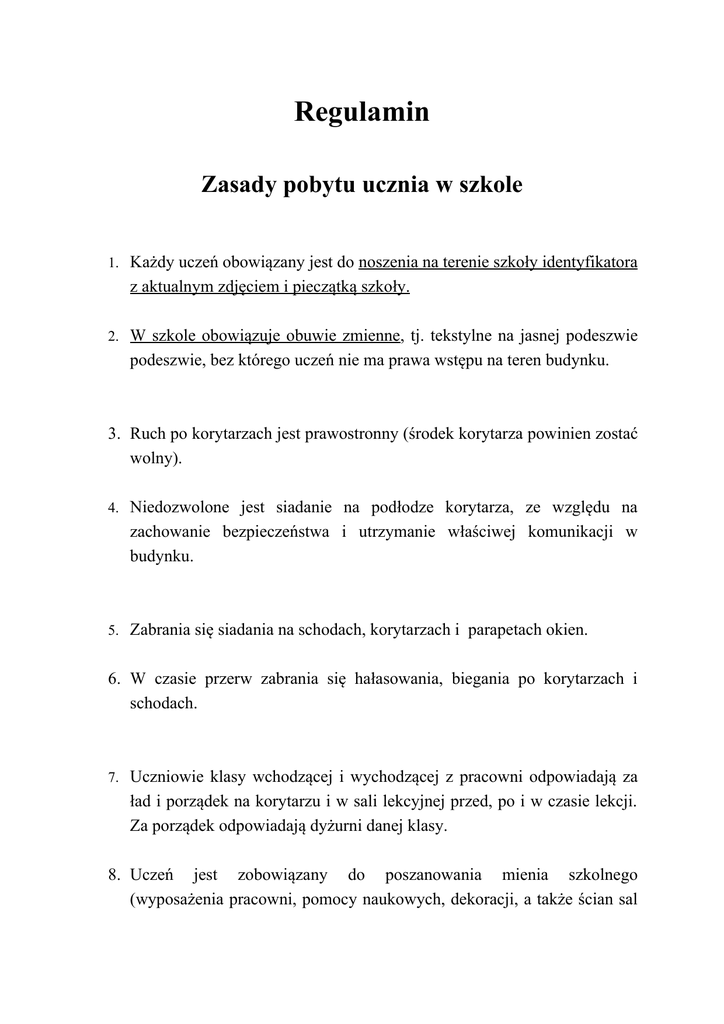 Regulamin Zasady pobytu ucznia w szkole 1. Każdy uczeń obowiązany jest do noszenia na terenie szkoły identyfikatora z aktualnym zdjęciem i pieczątką szkoły. 2. W szkole obowiązuje obuwie zmienne, tj. tekstylne na jasnej podeszwie podeszwie, bez którego uczeń nie ma prawa wstępu na teren budynku. 3. Ruch po korytarzach jest prawostronny (środek korytarza powinien zostać wolny). 4. Niedozwolone jest siadanie na podłodze korytarza, ze względu na zachowanie bezpieczeństwa i utrzymanie właściwej komunikacji w budynku. 5. Zabrania się siadania na schodach, korytarzach i parapetach okien. 6. W czasie przerw zabrania się hałasowania, biegania po korytarzach i schodach. 7. Uczniowie klasy wchodzącej i wychodzącej z pracowni odpowiadają za ład i porządek na korytarzu i w sali lekcyjnej przed, po i w czasie lekcji. Za porządek odpowiadają dyżurni danej klasy. 8. Uczeń jest zobowiązany do poszanowania mienia szkolnego (wyposażenia pracowni, pomocy naukowych, dekoracji, a także ścian sal lekcyjnych i korytarzy, niedewastowania urządzeń sanitarnych w toaletach. Za zniszczony sprzęt odpowiadają uczniowie. 9. Zabrania się zaśmiecania terenu wokół szkoły i niszczenia elewacji budynku. 10. Na terenie szkoły obowiązuje bezwzględny zakaz: posiadania, sprzedawania i używania narkotyków; • posiadania i picia alkoholu oraz przebywania pod jego wpływem; • posiadania oraz palenia tytoniu; • wnoszenia na teren szkoły przedmiotów niebezpiecznych, zagrażających życiu i zdrowiu członków społeczności szkolnej; • 11. Uczniowi nie wolno: opuszczać zajęć edukacyjnych bez zgody nauczyciela (wychowawcy), przebywać w sklepiku szkolnym i na korytarzach w czasie obowiązujących go zajęć lekcyjnych. Uczniowie dojeżdżający mogą oczekiwać na zajęcia w salce rekreacyjnej. 12. W czasie odbywania lekcji obowiązuje bezwzględny zakaz spożywania posiłków, picia napojów i żucia gumy. 13.Uczeń uczestniczy w zajęciach szkolnych w ubiorze godnym, stosownym do okoliczności, tzn.: • okrycia wierzchnie uczniowie pozostawiają w szatni, uczeń nie ma prawa wejść do sali na zajęcia szkolne w płaszczu czy kurtce; • uczeń na co dzień przychodzi na zajęcia szkolne ubrany w strój wygodny, czysty, schludny, niewyzywający i niezagrażający jego bezpieczeństwu. Za strój wyzywający uważa się - zbyt krótkie bluzki, z dużym dekoltem, odkrywające brzuch - ubrania z prześwitującego materiału - zbyt krótkie spódnice lub spodenki • uczniowie przygotowujący w szkole apele, akademie, spektakle itp. uroczystości szkolne w dniu prezentacji ubrani są stosownie do tematu apelu, akademii, spektaklu. Zaleca się, jeśli nie obowiązuje kostium sceniczny, by był to ubiór galowy (w kolorach białoczarnym, lub biało granatowym); • członkowie szkolnego pocztu sztandarowego są z racji pełnionych przez siebie funkcji zobowiązani są do występowania w stroju galowym (chłopcy: biała koszula lub granatowy garnitur, dziewczęta: biała bluzka, czarna lub granatowa spódnica o długości co najmniej do kolan); 14. Uczeń może nosić w szkole skromną biżuterię, tj. zegarek, łańcuszek, wisiorek, drobne pierścionki na palcach, drobne kolczyki w uszach. Odzież, ozdoby i pomoce szkolne nie mogą zawierać treści związanych ze środkami uzależniającymi i kulturą śmierci. 15. Na terenie szkoły obowiązuje bezwzględny zakaz używania w czasie lekcji i innych zajęć szkolnych telefonów komórkowych oraz innych urządzeń elektronicznych (np. odtwarzaczy muzyki, aparatów fotograficznych, dyktafonów itp.). Idąc na lekcję uczeń zobowiązany jest wyłączyć i schować telefon lub inne urządzenia. Jeżeli uczeń korzysta w czasie lekcji z powyższych urządzeń to nauczyciel ten fakt odnotowuje w dzienniku lekcyjnym i zgłasza wychowawcy oraz pełniącemu w tym czasie dyżur przedstawicielowi dyrekcji szkoły. 16. Ucznia ZSP nr 4 w Bełchatowie obowiązuje kultura słowa. W szkole nie wolno używać wulgaryzmów, stosować wobec kogokolwiek przemocy fizycznej i psychicznej. 17. Kategorycznie zabrania się „szkolenia kotów”. 18.Uczniowie zobowiązani są administracji i obsługi szkoły. respektować polecenia pracowników 19. Zabrania się parkowania samochodów przez uczniów na parkingu i wokół szkoły. Dojazd do szkoły nie może być zastawiony, utrudniony. 20.Nieprzestrzeganie zasad regulaminu skutkuje konsekwencji określonych w Statucie ZSP nr 4. wyciągnięciem