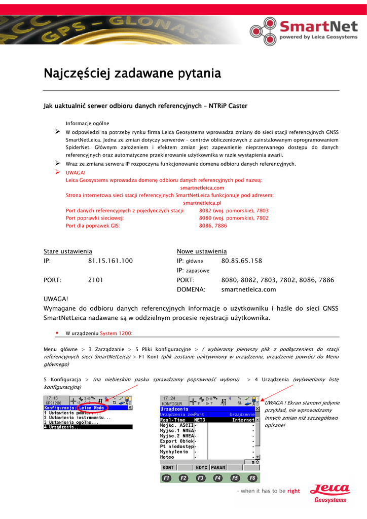Najczęściej zadawane pytania Jak uaktualnić serwer odbioru danych referencyjnych – NTRiP Caster Informacje ogólne W odpowiedzi na potrzeby rynku firma Leica Geosystems wprowadza zmiany do sieci stacji referencyjnych GNSS SmartNetLeica. Jedna ze zmian dotyczy serwerów – centrów obliczeniowych z zainstalowanym oprogramowaniem SpiderNet. Głównym założeniem i efektem zmian jest zapewnienie nieprzerwanego dostępu do danych referencyjnych oraz automatyczne przekierowanie użytkownika w razie wystąpienia awarii. Wraz ze zmiana serwera IP rozpoczyna funkcjonowanie domena odbioru danych referencyjnych. UWAGA! Leica Geosystems wprowadza domenę odbioru danych referencyjnych pod nazwą: smartnetleica.com Strona internetowa sieci stacji referencyjnych SmartNetLeica funkcjonuje pod adresem: smartnetleica.pl Port danych referencyjnych z pojedynczych stacji: 8082 (woj. pomorskie), 7803 Port poprawki sieciowej: 8080 (woj. pomorskie), 7802 Port dla poprawek GIS: 8086, 7886 Stare ustawienia Nowe ustawienia IP: IP: główne 81.15.161.100 80.85.65.158 IP: zapasowe PORT: 2101 PORT: 8080, 8082, 7803, 7802, 8086, 7886 DOMENA: smartnetleica.com UWAGA! Wymagane do odbioru danych referencyjnych informacje o użytkowniku i haśle do sieci GNSS SmartNetLeica nadawane są w oddzielnym procesie rejestracji użytkownika. W urządzeniu System 1200: Menu główne > 3 Zarządzanie > 5 Pliki konfiguracyjne > ( wybieramy pierwszy plik z podłączeniem do stacji referencyjnych sieci SmartNetLeica) > F1 Kont (plik zostanie uaktywniony w urządzeniu, urządzenie powróci do Menu głównego) 5 Konfiguracja > (na niebieskim pasku sprawdzamy poprawność wyboru) > 4 Urządzenia (wyświetlamy listę konfiguracyjną) UWAGA ! Ekran stanowi jedynie przykład, nie wprowadzamy innych zmian niż szczegółowo opisane! F4 PARAM > (wyświetlamy ekran edycji portów sieci) > wybieramy nazwę serwera do edycji (np. Leica) > wciskamy klawisz Enter (wyświetlamy ekran edycji serwera) F3 EDYC > (zmieniamy Ares IP ze starego na nowy, lub domenę oraz IP Port ze starego na nowy) Stare ustawienia Nowe ustawienia UWAGA! Jeśli jest taka możliwość, wprowadzamy nazwę domeny smartnetleica.com Dla plików konfiguracyjnych pojedynczych stacji port 8082, dla plików konfiguracyjnych poprawki sieciowej port 8080 Nowe ustawienia IP: główne 80.85.65.158 PORT: 8082 (dla SmartNet Pomorskie > woj. pomorskie) 7803 (dla pozostałych stacji) DOMENA: smartnetleica.com F1 ZAPIS > F1 KONT > F1 KONT > (wyświetlony jest ekran konfiguracyjny) F3 EDYC > F2 RUCH > F6 STRON > F5 ŹRÓDŁ (wibramy stacje referencyjną, której dotyczy plik konfiguracyjny np. REDA) F1 KONT > F1 KONT > F1 KONT > F1 KONT > Menu główne F7 Połącz > (sprawdzamy poprawność konfiguracji) W urządzeniu System VIVA: W systemie VIVA należy edytować profile z podłączeniem do pojedynczych stacji referencyjnych serwera Leica Geosystems. W tym celu należy wybrać: Z listy profili należy wybrać właściwy (np. Leica Reda) do edycji, a następnie przejść do kolejnego ekranu (KONT) UWAGA ! Kontynuujemy wszystkie ustawienia > KONT aż do ekranu: - Potrzebny jest serwer RTK. Co chcesz zrobić > Edytuj obecny serwer > KONT Wybierz serwer RTK do edycji > Nazwa serwera nie musi być identyczna jak na poniższym ekranie. Sprawdź IP, jeśli jest zgodne z poniższym ekranem > KONT Wprowadź nowe ustawienia: Adres: Adres smartnetleica.com Port:: Port: 8082 (dla SmartNet Pomorskie > woj. pomorskie) 7803 (dla pozostałych stacji) Identyfikator użytkownika NTRIP: NTRIP Należy wpisać właściwe uzyskane w procesie rejestracji na smartnetleica.pl Hasło użytkownika NTRIP: Należy wpisać właściwe uzyskane w procesie rejestracji na smartnetleica.pl Ekran z nowymi ustawieniami powinien wyglądać następująco: Po wprowadzeniu poprawnych ustawień > KONT Na kolejnym ekranie wybierz źródło z listy pobranej z serwera UWAGA ! Stacje referencyjne otrzymują nowe nazwy Z listy stacji należy wybrać odpowiednią do edytowanego profilu, przejść do kolejnego ekranu Pozostałe ustawienia nie zmieniają się. Kontynuujemy aż kreator zakończy pracę. Dla odbiorników GIS (Zeno, Uno): Serwer: 80.85.65.158 Port: 7886 lub 8086 Wersja RTCM: 2.x komunikaty 18,19 UWAGA! Sprawdź ustawienia przed wyjazdem w teren.