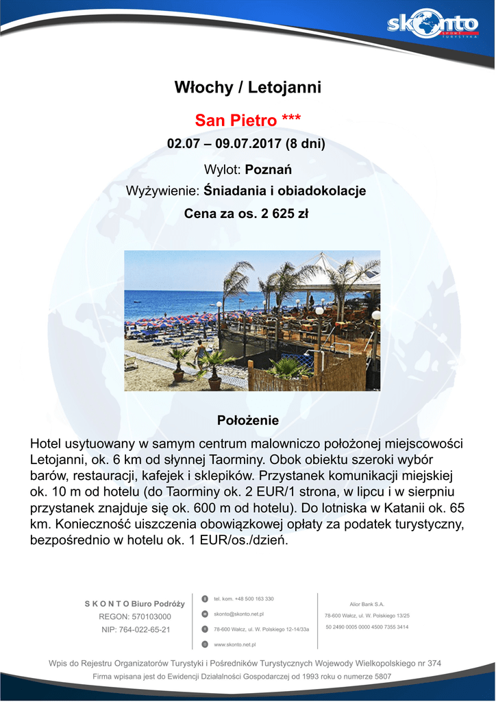 Włochy / Letojanni San Pietro *** 02.07 – 09.07.2017 (8 dni) Wylot: Poznań Wyżywienie: Śniadania i obiadokolacje Cena za os. 2 625 zł Położenie Hotel usytuowany w samym centrum malowniczo położonej miejscowości Letojanni, ok. 6 km od słynnej Taorminy. Obok obiektu szeroki wybór barów, restauracji, kafejek i sklepików. Przystanek komunikacji miejskiej ok. 10 m od hotelu (do Taorminy ok. 2 EUR/1 strona, w lipcu i w sierpniu przystanek znajduje się ok. 600 m od hotelu). Do lotniska w Katanii ok. 65 km. Konieczność uiszczenia obowiązkowej opłaty za podatek turystyczny, bezpośrednio w hotelu ok. 1 EUR/os./dzień. Plaża Bezpośrednio przy hotelu (przejście przez ulicę) znajduje się piaszczystożwirowa plaża (zalecane obuwie ochronne). Płatny serwis plażowy na plaży w okresie od czerwca do września (ok. 4 EUR/dzień/os.), w sierpniu (ok. 6 EUR/dzień/os.), poza sezonem brak serwisu plażowego. Do dyspozycji gości Recepcja 24 h, lobby, 2 windy, płatny sejf, restauracja główna serwująca śniadania i obiadokolacje oraz restauracja a'la carte przy plaży serwujące obiadokolacje (za dodatkową opłatą, konieczna wcześniejsza rezerwacja, otwarta od połowy maja do połowy września), bar. Brak basenu, hotel nie zapewnia ręczników kąpielowych. Ponadto: sala telewizyjna, płatny parking w odległości ok. 500 m od hotelu. Pokoje Hotel składa się z 94 pokoi standardowych położonych na 5 piętrach, wyposażonych w: łazienkę (prysznic i suszarka do włosów), centralnie sterowaną klimatyzację, mini lodówkę, telefon, TV Sat., bezpłatny sejf, balkon. Za dopłatą pokoje z bocznym widokiem na morze lub na potwierdzenie pokoje z frontalnym widokiem na morze. Bezpłatne łóżeczko dla dziecka do 2 lat. Wyżywienie Śniadania w formie bufetu, obiadokolacje serwowane do stolika (do wyboru z 2-3 pozycji menu, bufet sałatkowy, deser). Napoje do obiadokolacji płatne dodatkowo. Dania kuchni regionalnej i międzynarodowej. Program sportowy i animacyjny Hotel nie prowadzi programu animacyjnego. Sporty wodne dostępne na plaży publicznej za dodatkową opłatą (żeglarstwo, windsurfing, kajaki, ok. 25 EUR/godz.). W szczycie sezonu w centrum Letojanni liczne bary, kafejki, restauracje oraz dyskoteki. Internet Bezpłatny Internet Wi-Fi w lobby.
