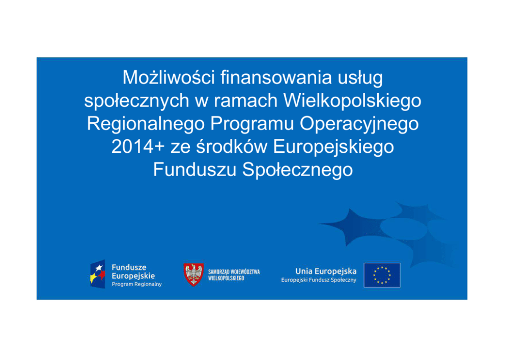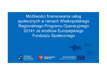 Możliwości finansowania usług społecznych w ramach Wielkopolskiego Regionalnego Programu Operacyjnego 2014+ ze środków Europejskiego Funduszu Społecznego Oś priorytetowa 7 Włączenie społeczne Deinstytucjonalizacja usług w ramach Wielkopolskiego Regionalnego Programu Operacyjnego 2014-2020 na podstawie Ogólnoeuropejskich wytycznych dotyczących przejścia od opieki instytucjonalnej do opieki świadczonej na poziomie lokalnych społeczności. DEINSTYTUCJONALIZACJA USŁUG Proces przejścia od opieki instytucjonalnej do usług świadczonych w lokalnej społeczności, realizowany zgodnie z „Ogólnoeuropejskimi wytycznymi dotyczącymi przejścia od opieki instytucjonalnej do opieki świadczonej na poziomie lokalnych społeczności” i wymagający z jednej strony rozwoju usług świadczonych w lokalnej społeczności, z drugiej – stopniowego ograniczenia usług w ramach opieki instytucjonalnej. Usługi świadczone w LOKALNEJ SPOŁECZNOŚCI Usługi umożliwiające osobom niezależne życie w środowisku lokalnym. Usługi te zapobiegają odizolowaniu osób od rodziny i środowiska lokalnego, a gdy to nie jest możliwe, gwarantują tym osobom warunki życia jak najbardziej zbliżone do warunków domowych i rodzinnych oraz umożliwiają podtrzymywanie więzi rodzinnych i sąsiedzkich Są to usługi świadczone w sposób: a) zindywidualizowany (dostosowany do potrzeb i możliwości danej osoby) oraz jak najbardziej zbliżony do warunków odpowiadających życiu w środowisku domowym i rodzinnym; b) umożliwiający odbiorcom tych usług kontrolę nad swoim życiem i nad decyzjami, które ich dotyczą; c) zapewniający, że odbiorcy usług nie są odizolowani od ogółu społeczności lub nie są zmuszeni do mieszkania razem; d) gwarantujący, że wymagania organizacyjne nie mają pierwszeństwa przed indywidualnymi potrzebami mieszkańców. Możliwości finansowania usług asystenckich i opiekuńczych Projekty poprawiające dostęp do usług opiekuńczych i asystenckich Usługi opiekuńcze - świadczone dla osób niesamodzielnych Wsparcie dla usług opiekuńczych odbywa się poprzez tworzenie miejsc świadczenia usług opiekuńczych w formie usług świadczonych w lokalnej społeczności. Tworzone miejsca świadczenia usług opiekuńczych mogą być miejscami: a) stałego lub krótkookresowego pobytu dziennego; b) stałego lub krótkookresowego pobytu całodobowego. Miejsca krótkookresowego pobytu służą przede wszystkim poprawie dostępu do usług opiekuńczych w zastępstwie za opiekunów faktycznych. Projekty poprawiające dostęp do usług opiekuńczych i asystenckich Aby umożliwić pozostanie osób z niepełnosprawnościami i osób niesamodzielnych w lokalnej społeczności, dopuszcza się finansowanie działań pozwalających tym osobom na w miarę możliwości samodzielne funkcjonowanie, w tym działań zwiększających mobilność, autonomię, bezpieczeństwo osób z niepełnosprawnościami i osób niesamodzielnych (np. likwidowanie barier architektonicznych w miejscu zamieszkania, sfinansowanie wypożyczenia sprzętu niezbędnego do opieki nad osobami niesamodzielnymi lub sprzętu zwiększającego samodzielność osób, usługi dowożenia posiłków, przewóz do miejsca pracy lub ośrodka wsparcia). Tego rodzaju działania realizowane są wyłącznie jako element kompleksowych projektów dotyczących usług asystenckich lub usług opiekuńczych i mogą być finansowane z EFS lub w ramach cross-financingu. Możliwe jest wykorzystanie nowoczesnych technologii informacyjno-komunikacyjnych w usługach opiekuńczych np. teleopieki, systemów przywoławczych. Projekty poprawiające dostęp do usług opiekuńczych i asystenckich Możliwa jest realizacja działań wspierających opiekunów faktycznych w opiece nad osobami niesamodzielnymi, w szczególności: kształcenie, w tym szkolenie i zajęcia praktyczne oraz wymianę doświadczeń dla opiekunów faktycznych, zwiększających ich umiejętności w zakresie opieki nad osobami niesamodzielnymi; poradnictwo, w tym psychologiczne oraz pomoc w uzyskaniu informacji umożliwiających poruszanie się po rożnych systemach wsparcia, z których korzystanie jest niezbędne dla sprawowania wysokiej jakości opieki i odciążenia opiekunów faktycznych; tworzenie miejsc krótkookresowego pobytu w zastępstwie za opiekunów faktycznych w formie pobytu całodobowego lub dziennego, sfinansowanie usługi asystenckiej lub usługi opiekuńczej w celu umożliwienia opiekunom faktycznym funkcjonowania społecznego, zawodowego lub edukacyjnego. Projekty poprawiające dostęp do usług opiekuńczych i asystenckich Usługi asystenckie - świadczone dla osób z niepełnosprawnościami Wsparcie świadczone w ramach usług asystenckich jest wsparciem wysokiej jakości dostosowanym do indywidualnych potrzeb osób wynikających z poszczególnych rodzajów niepełnosprawności oraz zakresu czynności wykonywanych przez asystenta w ramach usługi asystenckiej. Usługi asystenckie mogą być świadczone przez asystentów osób niepełnosprawnych, którzy ukończyli kształcenie w zawodzie asystenta osoby niepełnosprawnej zgodnie z rozporządzeniem Ministra Edukacji Narodowej z dnia 7 lutego 2012 r. w sprawie podstawy programowej kształcenia w zawodach (Dz. U. poz. 184, z późn. zm.) lub przez asystentów osobistych posiadających doświadczenie w realizacji usług asystenckich lub odpowiednie przeszkolenie, przy czym istnieje możliwość przeszkolenia asystentów w ramach projektu przed rozpoczęciem świadczenia przez nich usług na rzecz osób z niepełnosprawnościami. Możliwe jest sfinansowanie usługi asystenckiej w celu umożliwienia jej opiekunom faktycznym funkcjonowania społecznego, zawodowego lub edukacyjnego. Wsparcie dla projektów z zakresu zwiększenia dostępu do mieszkalnictwa wspomaganego Mieszkanie wspomagane – usługa świadczona w lokalnej społeczności: a) w postaci mieszkania chronionego, o którym mowa w ustawie z dnia 12 m