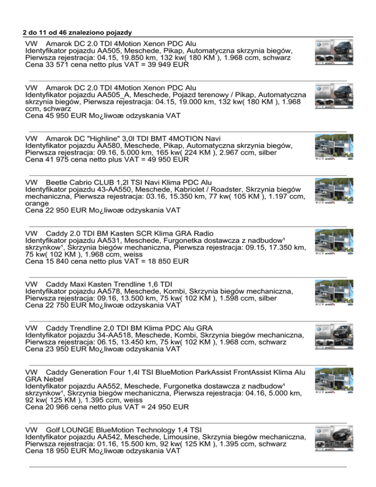 2 do 11 od 46 znaleziono pojazdy VW Amarok DC 2.0 TDI 4Motion Xenon PDC Alu Identyfikator pojazdu AA505, Meschede, Pikap, Automatyczna skrzynia biegów, Pierwsza rejestracja: 04.15, 19.850 km, 132 kw( 180 KM ), 1.968 ccm, schwarz Cena 33 571 cena netto plus VAT = 39 949 EUR VW Amarok DC 2.0 TDI 4Motion Xenon PDC Alu Identyfikator pojazdu AA505_A, Meschede, Pojazd terenowy / Pikap, Automatyczna skrzynia biegów, Pierwsza rejestracja: 04.15, 19.000 km, 132 kw( 180 KM ), 1.968 ccm, schwarz Cena 45 950 EUR Mo¿liwoæ odzyskania VAT VW Amarok DC "Highline" 3,0l TDI BMT 4MOTION Navi Identyfikator pojazdu AA580, Meschede, Pikap, Automatyczna skrzynia biegów, Pierwsza rejestracja: 09.16, 5.000 km, 165 kw( 224 KM ), 2.967 ccm, silber Cena 41 975 cena netto plus VAT = 49 950 EUR VW Beetle Cabrio CLUB 1,2l TSI Navi Klima PDC Alu Identyfikator pojazdu 43-AA550, Meschede, Kabriolet / Roadster, Skrzynia biegów mechaniczna, Pierwsza rejestracja: 03.16, 15.350 km, 77 kw( 105 KM ), 1.197 ccm, orange Cena 22 950 EUR Mo¿liwoæ odzyskania VAT VW Caddy 2.0 TDI BM Kasten SCR Klima GRA Radio Identyfikator pojazdu AA531, Meschede, Furgonetka dostawcza z nadbudow¹ skrzynkow¹, Skrzynia biegów mechaniczna, Pierwsza rejestracja: 09.15, 17.350 km, 75 kw( 102 KM ), 1.968 ccm, weiss Cena 15 840 cena netto plus VAT = 18 850 EUR VW Caddy Maxi Kasten Trendline 1,6 TDI Identyfikator pojazdu AA578, Meschede, Kombi, Skrzynia biegów mechaniczna, Pierwsza rejestracja: 09.16, 13.500 km, 75 kw( 102 KM ), 1.598 ccm, silber Cena 22 750 EUR Mo¿liwoæ odzyskania VAT VW Caddy Trendline 2,0 TDI BM Klima PDC Alu GRA Identyfikator pojazdu 34-AA518, Meschede, Kombi, Skrzynia biegów mechaniczna, Pierwsza rejestracja: 06.15, 13.450 km, 75 kw( 102 KM ), 1.968 ccm, schwarz Cena 23 950 EUR Mo¿liwoæ odzyskania VAT VW Caddy Generation Four 1,4l TSI BlueMotion ParkAssist FrontAssist Klima Alu GRA Nebel Identyfikator pojazdu AA552, Meschede, Furgonetka dostawcza z nadbudow¹ skrzynkow¹, Skrzynia biegów mechaniczna, Pierwsza rejestracja: 04.16, 5.000 km, 92 kw( 125 KM ), 1.395 ccm, weiss Cena 20 966 cena netto plus VAT = 24 950 EUR VW Golf LOUNGE BlueMotion Technology 1,4 TSI Identyfikator pojazdu AA542, Meschede, Limousine, Skrzynia biegów mechaniczna, Pierwsza rejestracja: 01.16, 15.500 km, 92 kw( 125 KM ), 1.395 ccm, schwarz Cena 18 950 EUR Mo¿liwoæ odzyskania VAT VW Golf Alltrack 4MOTION 2,0l TDI AHK RearView Navi Klima Identyfikator pojazdu AA565, Meschede, Kombi, Skrzynia biegów mechaniczna, Pierwsza rejestracja: 07.16, 7.500 km, 110 kw( 150 KM ), 1.968 ccm, schwarz Cena 30 950 EUR Mo¿liwoæ odzyskania VAT