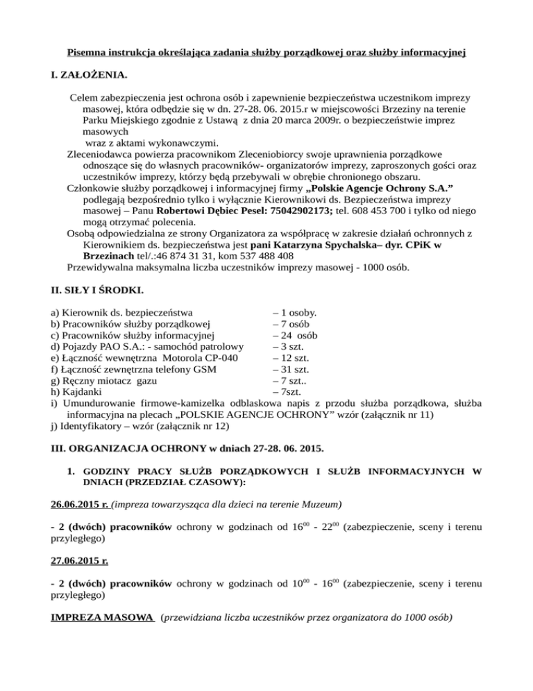 Pisemna instrukcja określająca zadania służby porządkowej oraz służby informacyjnej I. ZAŁOŻENIA. Celem zabezpieczenia jest ochrona osób i zapewnienie bezpieczeństwa uczestnikom imprezy masowej, która odbędzie się w dn. 27-28. 06. 2015.r w miejscowości Brzeziny na terenie Parku Miejskiego zgodnie z Ustawą z dnia 20 marca 2009r. o bezpieczeństwie imprez masowych wraz z aktami wykonawczymi. Zleceniodawca powierza pracownikom Zleceniobiorcy swoje uprawnienia porządkowe odnoszące się do własnych pracowników- organizatorów imprezy, zaproszonych gości oraz uczestników imprezy, którzy będą przebywali w obrębie chronionego obszaru. Członkowie służby porządkowej i informacyjnej firmy „Polskie Agencje Ochrony S.A.” podlegają bezpośrednio tylko i wyłącznie Kierownikowi ds. Bezpieczeństwa imprezy masowej – Panu Robertowi Dębiec Pesel: 75042902173; tel. 608 453 700 i tylko od niego mogą otrzymać polecenia. Osobą odpowiedzialna ze strony Organizatora za współpracę w zakresie działań ochronnych z Kierownikiem ds. bezpieczeństwa jest pani Katarzyna Spychalska– dyr. CPiK w Brzezinach tel/.:46 874 31 31, kom 537 488 408 Przewidywalna maksymalna liczba uczestników imprezy masowej - 1000 osób. II. SIŁY I ŚRODKI. a) Kierownik ds. bezpieczeństwa – 1 osoby. b) Pracowników służby porządkowej – 7 osób c) Pracowników służby informacyjnej – 24 osób d) Pojazdy PAO S.A.: - samochód patrolowy – 3 szt. e) Łączność wewnętrzna Motorola CP-040 – 12 szt. f) Łączność zewnętrzna telefony GSM – 31 szt. g) Ręczny miotacz gazu – 7 szt.. h) Kajdanki – 7szt. i) Umundurowanie firmowe-kamizelka odblaskowa napis z przodu służba porządkowa, służba informacyjna na plecach „POLSKIE AGENCJE OCHRONY” wzór (załącznik nr 11) j) Identyfikatory – wzór (załącznik nr 12) III. ORGANIZACJA OCHRONY w dniach 27-28. 06. 2015. 1. GODZINY PRACY SŁUŻB PORZĄDKOWYCH I SŁUŻB INFORMACYJNYCH W DNIACH (PRZEDZIAŁ CZASOWY): 26.06.2015 r. (impreza towarzysząca dla dzieci na terenie Muzeum) - 2 (dwóch) pracowników ochrony w godzinach od 1600 - 2200 (zabezpieczenie, sceny i terenu przyległego) 27.06.2015 r. - 2 (dwóch) pracowników ochrony w godzinach od 1000 - 1600 (zabezpieczenie, sceny i terenu przyległego) IMPREZA MASOWA (przewidziana liczba uczestników przez organizatora do 1000 osób) - 31 (trzydziestu jeden) pracowników ochrony ( zgodnie z Ustawą o ochronie imprez masowych) w godzinach od 16:00 – 23:00 (posterunki stałe01,02,03- zabezpieczenie terenu imprezy, sceny, dwa patrole piesze dwu osobowe oraz odwód) - 2 (dwóch) pracowników ochrony w godzinach od 2300 - 600 (zabezpieczenie, sceny i terenu przyległego) 28.06.2015 r. - 2 (dwóch) pracowników ochrony w godzinach od 1000 - 1600 (zabezpieczenie, sceny i terenu przyległego) IMPREZA MASOWA (przewidziana liczba uczestników przez organizatora do 1000 osób) - 31 (trzydziestu jeden) ochrony ( zgodnie z Ustawą o ochronie imprez masowych) w godzinach od 16:00 – 23:00 (posterunki stałe- zabezpieczenie terenu imprezy, sceny, dwa patrol piesze dwu osobowe terenu przyległego) 2. DYSLOKACJA SŁUŻB PORZĄDKOWYCH I SŁUŻB INFORMACYJNYCH w trakcie trwania 27-28. 06. 2015r Kierownik ds. bezpieczeństwa – Dębiec Robert – kryptonim 00. - Centrum dowodzenia ZADANIA KIEROWNIKA DS. BEZPIECZEŃSTWA 1. Przeprowadzenie szczegółowej odprawy z pracownikami służb porządkowych i służb informacyjnych biorących udział w imprezie przed jej rozpoczęciem. 2. Koordynować działania poszczególnych odcinków w celu przeciwdziałania wszelkim zakłóceniom porządku w czasie trwania imprezy. 3. Bezpośrednio współpracować z osobą reprezentującą organizatora i na bieżąco korygować wszelkie niedociągnięcia. 4. Bezpośrednia współpraca z Policją oraz innymi służbami porządkowymi i ratunkowymi, polegająca na przekazywaniu informacji i bezpośrednie działanie w terenie. 5. Podejmowanie wiążących decyzji dla kierowników poszczególnych odcinków ochrony w przypadku wystąpienia zakłóceń porządku publicznego lub innych zdarzeń nie oczekiwanych. 6. Współpraca ze spikerem w zakresie przekazywania nagłośnionych informacji na terenie imprezy. 7. W przypadku wydarzeń nadzwyczajnych wykonywać decyzje dowódcy Policji w zakresie przywrócenia zakłóconego porządku publicznego lub innego powstałego zdarzenia. ZADANIA DLA PRACOWNIKÓW SŁUŻB PORZĄDKOWYCH I SŁUŻB INFORMACYJNYCH W ODWODZIE 1. Sprawdzanie uprawnień osób do uczestniczenia w imprezie masowej, a w przypadku stwierdzenia braku takich uprawnień – wezwania do opuszczenia imprezy masowej. 2. Legitymowanie w celu sprawdzenia ich tożsamości. 3. Przeglądanie zawartości bagażu i odzieży osób w przypadku podejrzenia, że osoby te wnoszą lub posiadają broń lub inne niebezpieczne przedmioty, materiałów wybuchowych, wyrobów pirotechnicznych, materiałów pożarowo niebezpiecznych, napojów alkoholowych, środków odurzających lub substancji psychotropowych. 4. W przypadku zakłócenia porządku publicznego należy wydać polecenie porządkowe do zastosowania się do regulaminu imprezy masowej lub obiektu (terenu) a w przypadku niewykonania tych poleceń wezwać do opuszczenia imprezy masowej 5. Dokonać ujęcia w celu niezwłocznego przekazania Policji, osób stwarzających bezpośrednie zagrożenie dla dóbr powierzonych ochronie oraz osób dopuszczających się czynów zabronionych. 6. Udzielanie wsparcia poszczególnym odcinkom w celu przeciwdziałania zakłóceniom porządku publicznego przy wykorzystaniu różnego rodzaju form i szyków ochronnych. 7. W przypadku ewakuacji wykonywać polecenia Kierownika Odwodu. 8. W przypadku awarii środków łączności przekazywanie poleceń poszczególnym posterunkom. 9. Dbanie o drożność dróg ewakuacyjnych i kierować służby ratownicze na miejsce zdarzenia, 10. O wszelkich negatywnych zjawiskach niezwłocznie informować przełożonyc