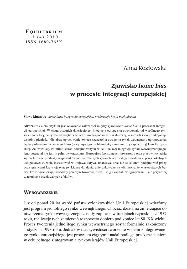 Equilibrium 1 (4) 2010 ISSN 1 6 8 9 - 7 6 5 X Anna Kozłowska Zjawisko home bias w procesie integracji europejskiej Słowa kluczowe: home bias, integracja europejska, preferencje kraju pochodzenia Abstrakt: Celem artykułu jest wskazanie zależności między zjawiskiem home bias a procesem integracji europejskiej. W ciągu ostatnich dziesięcioleci integracja europejska ewoluowała od wspólnego rynku i unii celnej, do rynku wewnętrznego oraz unii gospodarczej i walutowej, w ramach której funkcjonuje wspólny pieniądz. Niniejsze opracowanie zwraca szczególną uwagę na rynek wewnętrzny ugrupowania, będący rdzeniem pierwszego filaru (obejmującego problematykę ekonomiczną i społeczną) Unii Europejskiej. Zauważa się, że mimo starań podejmowanych w celu dalszej integracji rynku wewnątrzunijnego, jego potencjał nie jest w pełni wykorzystany. Europejscy konsumenci, inwestorzy oraz pracownicy zdają się preferować produkty wyprodukowane na lokalnych rynkach oraz usługi świadczone przez lokalnych usługodawców, wolą inwestować w krajowe aktywa finansowe oraz nie są skłonni podejmować pracy poza granicami kraju ojczystego. Liczne działania ukierunkowane na eliminowanie występujących barier, które ograniczają swobodny przepływ towarów, osób, usług i kapitału w ugrupowaniu, nie przynoszą w rezultacie oczekiwanych efektów. Wprowadzenie Już od ponad 20 lat wśród państw członkowskich Unii Europejskiej wdrażany jest program jednolitego rynku wewnętrznego. Chociaż działania zmierzające do utworzenia rynku wewnętrznego zostały zapisane w traktatach rzymskich z 1957 roku, realizację tych zamierzeń rozpoczęto dopiero pod koniec lat 80. XX wieku. Proces tworzenia jednolitego rynku wewnętrznego został formalnie zakończony 1 stycznia 1993 roku. Jednak w rzeczywistości tworzenie w pełni zintegrowanego rynku europejskiego jest procesem ciągłym i nadal podlega przekształceniom w celu pełnego zintegrowania rynków krajów Unii Europejskiej. 144 Anna Kozłowska Integracja1 jednolitego rynku Unii Europejskiej jest częścią szerszego procesu globalizacji i liberalizacji gospodarki światowej i polega na znoszeniu wszelkich barier w funkcjonowaniu ugrupowania. Integracja eurorynku jest bardzo ważnym procesem przynoszącym korzyści zarówno całej gospodarce unijnej, jak również poszczególnym konsumentom i producentom. Ogólnie rzecz ujmując, rezultatem procesów integracyjnych jest „ukształtowanie się w ramach ugrupowania integracyjnego jakościowo nowej struktury ekonomicznej, charakteryzującej się trwałością powiązań między poszczególnymi ogniwami gospodarki i wysokim szczeblem koordynacji polityki społeczno-gospodarczej państw integrowanych” (Grabowski, 2008, s. 10). Utworzenie i funkcjonowanie jednolitego rynku europejskiego przyniosło dla całego ugrupowania wiele korzyści. Wśród efektów ekonomicznych, wynikających z istnienia rynku wewnętrznego, można wskazać na: wzrost inwestycji, powstanie nowych miejsc pracy, ograniczenie inflacji, wzrost konkurencji na rynku, intensyfikacja handlu wewnętrznego oraz wzrost bezpośrednich inwestycji zagranicznych (por. Kundera, 2003, s. 167–203). Ważne jest zatem, aby wciąż zacieśniać współpracę w ramach jednolitego rynku europejskiego. Europejski rynek wewnętrzny jest obszarem, na który składa się 27 zróżnicowanych gospodarek narodowych, na terytorium których zamieszkuje łącznie około 500 mln osób. Zauważa się jednak, że nie jest w pełni wykorzystywany jego potencjał. Rynek ten pozostaje w dużej części rozdrobniony i składa się z 27 mini-rynków krajowych. Liczne działania ukierunkowane na eliminowanie występujących barier technicznych, administracyjnych, regulacyjnych oraz prawnych, które ograniczają dokonywanie transakcji transgranicznych w ugrupowaniu, w rezultacie nie przynoszą oczekiwanych efektów. Poziom integracji rynku wewnętrznego traci swoją dynamikę. Rynek Unii Europejskiej nadal jest sfragmentaryzowany, a mieszkańcy poszczególnych państw należących do ugrupowania preferują produkty krajowe lub regionalne, pracują na krajowym rynku pracy oraz inwestują w akcje krajowych spółek. Zjawisko preferencji kraju pochodzenia zwane jest również jako zjawisko home bias. Niniejszy artykuł ma na celu przybliżenie pojęcia integracji rynku wewnętrznego Unii Europejskiej oraz wskazanie na zjawisko home bias, które może mieć istotny wpływ na stopień integracji poszczególnych gospodarek wchodzących w skład ugrupowania. Ponieważ likwidacja formalnych barier, występujących w dokonywaniu transakcji między podmiotami zlokalizowanymi w różnych krajach europejskich, nie przynosi oczekiwanych efektów, warto zwrócić uwagę na inne czynniki ograniczające rozwój integrującego się obszaru. 1 W teorii integracji rozróżnia się dwa zasadnicze pojęcia: pogłębianie integracji oraz jej rozszerzanie, czyli integrację „w głąb” i „wszerz”. Rozważania niniejszego artykułu odnoszą się do integracji „w głąb” [por. Gawlikowska-Hueckel, Zielińska-Głębocka, 2004, s. 9–10]. Zjawisko home bias w procesie integracji europejskiej Istota jednolitego rynku 145 Unii Europejskiej Według art. 26 ust. 2 Traktatu o funkcjonowaniu Unii Europejskiej, rynek wewnętrzny2 (Internal Market), zwany również jednolitym rynkiem (Single Market) lub jednolitym rynkiem wewnętrznym (Single Internal Market), definiowany jest jako „obszar bez granic wewnętrznych, w którym jest zapewniony swobodny przepływ towarów, osób, usług i kapitału” (Dz.Urz. UE C 83 z 30.3.2010, s. 59). Podstawową przesłanką utworzenia jednolitego rynku europejskiego było zatem umożliwienie swobodnego przepływu dóbr, kapitału, usług i siły roboczej wewnątrz krajów Unii Europejskiej, a jego utworzenie stanowiło kluczowy element procesu integracji gospodarczej w Europie. Jest to obszar działania konkurujących ze sobą przedsięb