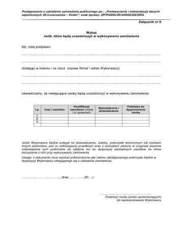 Postępowanie o udzielenie zamówienia publicznego pn.: „Przetwarzanie i interpretacja danych sejsmicznych 3D Łuszczanów – Kotlin”, znak sprawy: ZP/PGNIG/2014/0020/GE/DRG Załącznik nr 6 Wykaz osób, które będą uczestniczyć w wykonywaniu zamówienia My, niżej podpisani .................................................................................................................................................... .................................................................................................................................................... działając w imieniu i na rzecz (nazwa /firma/ i adres Wykonawcy) .................................................................................................................................................... .................................................................................................................................................... oświadczamy, że następujące osoby będą uczestniczyć w wykonywaniu zamówienia: Lp. Imię i nazwisko Kwalifikacje zawodowe (rodzaj i nr uprawnień) Wykształcenie i doświadczenie Podstawa do dysponowania osobą 1. 2. 3. Jeżeli Wykonawca będzie polegał na doświadczeniu, wiedzy, potencjale technicznym lub osobach innych podmiotów, jest on zobowiązany przedłożyć wraz z wnioskiem złożone w oryginale pisemne zobowiązanie tych podmiotów do oddania mu do dyspozycji niezbędnych zasobów na okres korzystania z nich przy wykonywaniu zamówienia. Uwaga: z dokumentu musi wynikać jednoznacznie jaki zakres udostępnianego potencjału będzie w dyspozycji Wykonawcy ubiegającego się o udzielenie zamówienia. ……………………………., dnia …………..20… r. ............................................................. Podpis(y) osoby (osób) uprawnionej(ych) do reprezentowania Wykonawcy