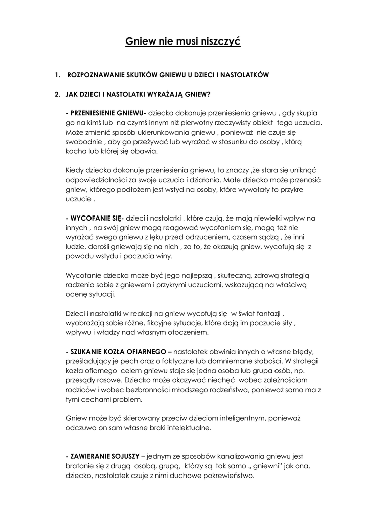 Gniew nie musi niszczyć 1. ROZPOZNAWANIE SKUTKÓW GNIEWU U DZIECI I NASTOLATKÓW 2. JAK DZIECI I NASTOLATKI WYRAŻAJĄ GNIEW? - PRZENIESIENIE GNIEWU- dziecko dokonuje przeniesienia gniewu , gdy skupia go na kimś lub na czymś innym niż pierwotny rzeczywisty obiekt tego uczucia. Może zmienić sposób ukierunkowania gniewu , ponieważ nie czuje się swobodnie , aby go przeżywać lub wyrażać w stosunku do osoby , którą kocha lub której się obawia. Kiedy dziecko dokonuje przeniesienia gniewu, to znaczy ,że stara się uniknąć odpowiedzialności za swoje uczucia i działania. Małe dziecko może przenosić gniew, którego podłożem jest wstyd na osoby, które wywołały to przykre uczucie . - WYCOFANIE SIĘ- dzieci i nastolatki , które czują, że mają niewielki wpływ na innych , na swój gniew mogą reagować wycofaniem się, mogą też nie wyrażać swego gniewu z lęku przed odrzuceniem, czasem sądzą , że inni ludzie, dorośli gniewają się na nich , za to, że okazują gniew, wycofują się z powodu wstydu i poczucia winy. Wycofanie dziecka może być jego najlepszą , skuteczną, zdrową strategią radzenia sobie z gniewem i przykrymi uczuciami, wskazującą na właściwą ocenę sytuacji. Dzieci i nastolatki w reakcji na gniew wycofują się w świat fantazji , wyobrażają sobie różne, fikcyjne sytuacje, które dają im poczucie siły , wpływu i władzy nad własnym otoczeniem. - SZUKANIE KOZŁA OFIARNEGO – nastolatek obwinia innych o własne błędy, prześladujący je pech oraz o faktyczne lub domniemane słabości. W strategii kozła ofiarnego celem gniewu staje się jedna osoba lub grupa osób, np. przesądy rasowe. Dziecko może okazywać niechęć wobec zależnościom rodziców i wobec bezbronności młodszego rodzeństwa, ponieważ samo ma z tymi cechami problem. Gniew może być skierowany przeciw dzieciom inteligentnym, ponieważ odczuwa on sam własne braki intelektualne. - ZAWIERANIE SOJUSZY – jednym ze sposobów kanalizowania gniewu jest bratanie się z drugą osobą, grupą, którzy są tak samo „ gniewni” jak ona, dziecko, nastolatek czuje z nimi duchowe pokrewieństwo. - NEGATYWIZM- różne stany , od przygnębienia doświadczanego przez kilka godzin lub dni, do bardziej trwałej, ogólniejszej postawy. Dziecko lub nastolatek może przybrać negatywną postawę wobec konkretnego nauczyciela lub rodzica , komunikując swoje przekonanie , że na dorosłych nie można liczyć , że jego własne środowisko go nie wspiera, a świat ogólnie jest zły. O niskim poczuciu wartości dzieci i młodzieży świadczy to, że dyskredytują, pomniejszają, a nawet ignorują pozytywne wsparcie innych, skupiają się na najsłabszej negatywnej interakcji, twierdzą, że nie zasługują na miłość. - PESYMIZM- dzieci/nastolatki są przekonane, że tylko je spotyka , to co najgorsze, wątpią, aby w wyniku ich własnych działań mogło spotkać je coś dobrego. Podłożem pesymizmu jest poczucie zranienia i rozczarowania, a źródłem sytuacje trudne i traumatyczne z okresu wczesnodziecięcego . W skrajnym przypadku pesymizm może prowadzić do poczucia bezradności i beznadziejności - dwóch czynników najczęściej związanych z myślami samobójczymi i samookaleczeniami , gniew związany z pesymizmem skierowany jest przeciwko własnej rodzinie i może skłaniać dzieci/ nastolatki do ucieczki z domu. - SAMOOKALECZANIE- dzieci i nastolatki mogą okaleczać się na wiele sposobów: zadawać rany, przypalać lub wyrządzać sobie inną krzywdę- bez zamiaru popełnienia samobójstwa. Zadawanie sobie ran może być sposobem skierowania uwagi na to, co dzieje się tu i teraz, a przez to uspokojenie swoich myśli lub obniżenie emocjonalnego napięcia. - ZACHOWANIA SAMOBÓJCZE – trudności w zarządzaniu gniewem , oprócz depresji , są częstym czynnikiem leżącym u podłoża myśli samobójczych postaw i prób Zachowania samobójcze dzieci są wzmacniane wielkim cierpieniem emocjonalnym wywołanym przez stratę, odrzucenie, porzucenie lub poczucie beznadziejności i bezsilności Co trzecią główną przyczyną śmierci nastolatków w przedziale wiekowym 1519 lat jest samobójstwo. Myśli samobójcze wypływają z pragnienia zakończenia emocjonalnego cierpienia, a dziecko myślące o samobójstwie jest błędnie przekonane , że położenie kresu swemu życiu jest jedynym sposobem wyzwolenia się od cierpienia. SYGNAŁY OSTRZEGAWCZE WSKAZUJĄCE NA CHĘĆ POPEŁNIENIA PRZEZ DZIECKO SAMOBÓJSTWA: - podejmowanie próby samobójczej przez dziecko, - poważne uzależnienie od narkotyków lub alkoholu, - grożenie popełnieniem samobójstwa lub dzielenie się samobójczymi zamysłami , myślami o śmierci, umieraniu lub życiu po śmierci, - nagłe pogłębienie się zjawiska popadania w pesymistyczne nastroje, wycofanie się lub izolowanie od innych, - poważne zmiany w zwyczajach odżywiania i snu, - poczucie beznadziejności , winy lub braku własnej wartości , - słaba kontrola nad własnym postępowaniem , - impulsywne, agresywne zachowania, perfekcjonizm, - pogorszenie się wyników w nauce lub osłabienie zainteresowania szkołą , - brak zainteresowania dotychczasowymi zajęciami , - rozdawanie najcenniejszych rzeczy ze swego majątku, - żegnanie się z bliskimi WCZEŚNIEJ WYMIENIONE SYGNAŁY OSTRZEGAWCZE SĄ JESZCZE POWAŻNIEJSZE, JEŚLI: - dziecko lub nastolatek zostało dotknięte doświadczeniem śmierci, - przeżyło zerwanie z sympatią, - miało konflikt z rodzicami lub w rodzinie, - jeśli dziecko , nastolatek z lokalnej społeczności podejmowało próbę samobójczą, popełniło samobójstwo. JAK POMÓC DZIECIOM I NASTOLATKOM USTRZEC SIĘ PRZED PRÓBĄ SAMOBÓJCZĄ, SAMOBÓJSTWEM? Potraktowanie poważnie słów dziecka / nastolatka - rozmawiaj o jego zmartwieniach i jeśli trzeba poszukaj fachowej pomocy, - pamiętaj, że większość nastolatków , które targnęły się na życie rozmawiało o tym z innymi , Słuchaj dziecka/nastolat