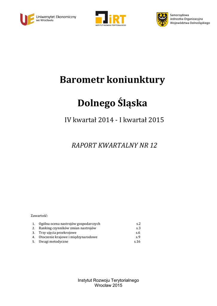 Samorządowa Jednostka Organizacyjna Województwa Dolnośląskiego Barometr koniunktury Dolnego Śląska IV kwartał 2014 - I kwartał 2015 RAPORT KWARTALNY NR 12 Zawartość: 1. 2. 3. 4. 5. Ogólna ocena nastrojów gospodarczych Ranking czynników zmian nastrojów Trzy ujęcia przekrojowe Otoczenie krajowe i międzynarodowe Uwagi metodyczne s.2 s.3 s.6 s.9 s.16 Instytut Rozwoju Terytorialnego Wrocław 2015 Barometr koniunktury Dolnego Śląska Raport kwartalny nr 12 1. Ogólna ocena nastrojów gospodarczych Syntetyczny wskaźnik koniunktury (SWK) gospodarczej Dolnego Śląska za okres IV kw. 2014 roku - I kw. 2015 roku wzrósł do poziomu 15,9%. Ponowny wzrost dobrze świadczy o gospodarce tego województwa, jednak czynniki zewnętrzne stają się coraz mniej sprzyjające. Dlatego widoczne są oznaki osłabienia w niektórych częściach gospodarki regionu i kraju. Szczególnie istotny jest spadek cen nośników energii, który dla jednych regionów może być korzystny (np. Dolny Śląsk), a dla innych niekorzystny (np. Górny Śląsk). Dopiero następne kwartały pozwolą na odpowiednie dostosowania. Zależność koniunktury Dolnego Śląska od otoczenia zewnętrznego może się silniej zarysować w kolejnych kwartałach. Trzeba pamiętać, że aktualny wzrost gospodarczy jest stabilny, ale nie charakteryzuje się zbyt dużą dynamiką. Dlatego też pojawianie się czynników ryzyka jest natychmiast zauważalne. Może stać się to jeszcze bardziej widoczne w warunkach objawów deflacji (mamy tu dużo mniejsze doświadczenie niż w przypadku inflacji), wynikających z bardzo szybkich spadków cen ropy. Wykres 1. Nastroje gospodarcze na Dolnym Śląsku w kolejnych badaniach kwartalnych. 20% 18% 16% 14% 12% 10% 8% 6% 4% 2% 0% I-II kw. II-III kw. III-IV kw. 2012 2012 2012 IV I-II kw. II-III kw. III-IV kw. IV I-II kw. II-III kw. III-IV kw. IV kw.2012 kw.2013 kw.2014 I kw.2013 2013 2013 Ocena zakończonego kwartału 2013 I kw.2014 2014 2014 2014 Syntetyczny wskaźnik koniunktury Prognoza dla rozpoczętego kwartału Źródło: Opracowanie na podstawie badań: Instytut Rozwoju Terytorialnego, Wrocław 2015. 2 I kw.2015 Barometr koniunktury Dolnego Śląska Raport kwartalny nr 12 Niniejsze badanie pokazuje, że na Dolnym Śląsku: kontynuacji wzrostu towarzyszą symptomy osłabienia widoczne we wskaźnikach cząstkowych, prognozy na nowy kwartał są niższe niż wykonanie poprzedniego kwartału mimo, że SWK jest najwyższy od rozpoczęcia pomiarów na początku 2012 roku, wzrasta ryzyko gospodarowania ze względu na deflację i związane z tym działania Europejskiego Banku Centralnego dotyczące „dodruku” 60 mld euro miesięcznie co spowoduje wzrost zmienności kursowej. Spowoduje to zwiększenie zmienności kursów walutowych. Wzrost gospodarczy przebiega w trudniejszych warunkach: reorientacji więzi gospodarczych między zachodem a wschodem Europy, ryzyka wystąpienia tendencji deflacyjnych w Polsce i innych krajów UE, zbyt szybkich spadków cen nośników energii, które mogą najpierw przynieść efekty negatywne zamiast pozytywnych, stabilnej sytuacji na rynku pracy. Trzeba zauważyć, że mimo utrwalania poprawy występują okoliczności ograniczające optymizm: ryzyko, że skutki sankcji dotkną gospodarkę Dolnego Śląska, ryzyko, że łagodzenie sankcji wobec Rosji zostanie wykorzystane przez bogatsze kraje do wyparcia innych państw z rynku rosyjskiego, pojawiają się dane wskazujące na pogłębienie zróżnicowania sytuacji gospodarczej regionów, krajów i głównych światowych gospodarek. 2.Ranking czynników zmian nastrojów W danych zawartych w tabeli 1 dominuje przewaga wskazań pozytywnych stanowiących kontynuację pomiarów, w których widoczny jest dobry klimat gospodarczy. Jednakże dynamika zmian przedstawionych wskaźników jest mniejsza, 3 Barometr koniunktury Dolnego Śląska Raport kwartalny nr 12 gdyż pojawiły się znaczne przetasowania w rankingu. Aktualnie mamy do czynienia z czymś w rodzaju korekty hierarchii poszczególnych wskaźników. Mimo ogólnej poprawy nawet w takim ujęciu widoczny jest spadek dynamiki wzrostowej. Tabela 1. Ranking zmian nastrojów we wskaźnikach cząstkowych SWK (%). Zmiana WSKAŹNIK kw./kw. Zapasy wyrobów/towarów/materiałów 10,87% Wartość zakupów importowych 7,61% Wartość nakładów inwestycyjnych 4,35% Średnie wynagrodzenie w firmie 3,62% Wartość sprzedaży na eksport 3,62% Sytuacja finansowa firmy 1,81% Popyt na produkty/towary/usługi 1,45% Stan zatrudnienia 1,45% Wartość sprzedaży krajowej -0,72% Wydatki na promocję i marketing -2,90% Udział należności przeterminowanych 0,00% Źródło: Opracowanie na podstawie badań: Instytut Rozwoju Terytorialnego, Wrocław 2015. Najwyższą pozycję w rankingu ma wskaźnik Zapasów wyrobów/towarów/materiałów. Choć jest to wartość dodatnia, to nie można nadawać jej wydźwięku zbyt pozytywnego. Ma to swe uzasadnienie w spadku dwóch wskaźników tj. Wartości sprzedaży krajowej i Wydatków na promocję i marketing. Pokazują one, że zwiększone moce gospodarki mogą być większe od potrzeb rynkowych. Kolejne kwartały pokażą czy stanowi to sygnał zmniejszenia produkcji w najbliższej przyszłości czy tylko przejściowe odchylenie (szczególnie na tle wzrostu produkcji w ujęciu branżowym w niniejszym raporcie oraz z punktu widzenia produkcji przemysłowej w skali krajowej). Widać to w niskim poziomie wskaźnika Popytu na produkty/towary/usługi. Mimo, że jest on dodatni i wpisuje się ciągle jeszcze w całkiem wysokie tempo rozwoju gospodarczego, to sygnalizuje on konieczność zachowania 4 Barometr koniunktury Dolnego Śląska Raport kwartalny nr 12 ostrożności, gdyby przedsiębiorstwo nastawiało osiągnięcie większych zysków, niż dotychczas. Pozytywne wskazania wystąpiły też w przypadku Stanu zatrudnienia i Wzrostu wynagrodzeń. Jednak w porównaniu do znacznie wyższych poziomów tych wskaźników w poprzednich pomiarach, ich w