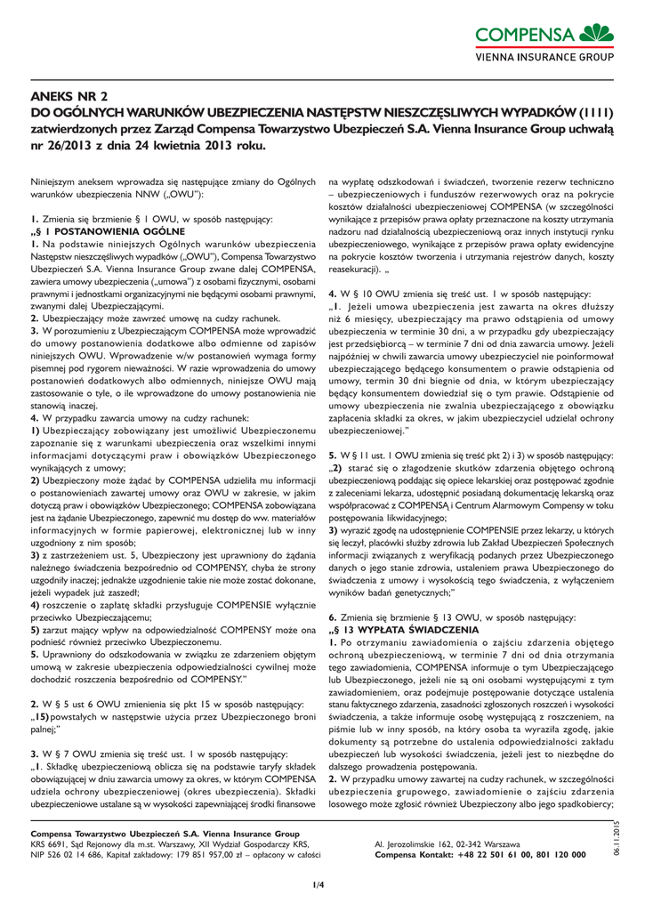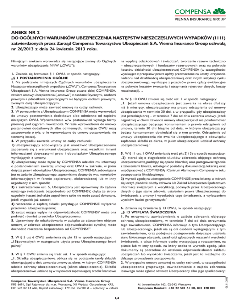 ANEKS NR 2 DO OGÓLNYCH WARUNKÓW UBEZPIECZENIA NASTĘPSTW NIESZCZĘSLIWYCH WYPADKÓW (1111) zatwierdzonych przez Zarząd Compensa Towarzystwo Ubezpieczeń S.A. Vienna Insurance Group uchwałą nr 26/2013 z dnia 24 kwietnia 2013 roku. 1. Zmienia się brzmienie § 1 OWU, w sposób następujący: „§ 1 POSTANOWIENIA OGÓLNE 1. Na podstawie niniejszych Ogólnych warunków ubezpieczenia Następstw nieszczęśliwych wypadków („OWU”), Compensa Towarzystwo Ubezpieczeń S.A. Vienna Insurance Group zwane dalej COMPENSA, zawiera umowy ubezpieczenia („umowa”) z osobami fizycznymi, osobami prawnymi i jednostkami organizacyjnymi nie będącymi osobami prawnymi, zwanymi dalej Ubezpieczającymi. 2. Ubezpieczający może zawrzeć umowę na cudzy rachunek. 3. W porozumieniu z Ubezpieczającym COMPENSA może wprowadzić do umowy postanowienia dodatkowe albo odmienne od zapisów niniejszych OWU. Wprowadzenie w/w postanowień wymaga formy pisemnej pod rygorem nieważności. W razie wprowadzenia do umowy postanowień dodatkowych albo odmiennych, niniejsze OWU mają zastosowanie o tyle, o ile wprowadzone do umowy postanowienia nie stanowią inaczej. 4. W przypadku zawarcia umowy na cudzy rachunek: 1)Ubezpieczający zobowiązany jest umożliwić Ubezpieczonemu zapoznanie się z warunkami ubezpieczenia oraz wszelkimi innymi informacjami dotyczącymi praw i obowiązków Ubezpieczonego wynikających z umowy; 2)Ubezpieczony może żądać by COMPENSA udzieliła mu informacji o postanowieniach zawartej umowy oraz OWU w zakresie, w jakim dotyczą praw i obowiązków Ubezpieczonego; COMPENSA zobowiązana jest na żądanie Ubezpieczonego, zapewnić mu dostęp do ww. materiałów informacyjnych w formie papierowej, elektronicznej lub w inny uzgodniony z nim sposób; 3)z zastrzeżeniem ust. 5, Ubezpieczony jest uprawniony do żądania należnego świadczenia bezpośrednio od COMPENSY, chyba że strony uzgodniły inaczej; jednakże uzgodnienie takie nie może zostać dokonane, jeżeli wypadek już zaszedł; 4)roszczenie o zapłatę składki przysługuje COMPENSIE wyłącznie przeciwko Ubezpieczającemu; 5)zarzut mający wpływ na odpowiedzialność COMPENSY może ona podnieść również przeciwko Ubezpieczonemu. 5. Uprawniony do odszkodowania w związku ze zdarzeniem objętym umową w zakresie ubezpieczenia odpowiedzialności cywilnej może dochodzić roszczenia bezpośrednio od COMPENSY.” 2. W § 5 ust 6 OWU zmienienia się pkt 15 w sposób następujący: „15)powstałych w następstwie użycia przez Ubezpieczonego broni palnej;” 3. W § 7 OWU zmienia się treść ust. 1 w sposób następujący: „1. Składkę ubezpieczeniową oblicza się na podstawie taryfy składek obowiązującej w dniu zawarcia umowy za okres, w którym COMPENSA udziela ochrony ubezpieczeniowej (okres ubezpieczenia). Składki ubezpieczeniowe ustalane są w wysokości zapewniającej środki finansowe Compensa Towarzystwo Ubezpieczeń S.A. Vienna Insurance Group KRS 6691, Sąd Rejonowy dla m.st. Warszawy, XII Wydział Gospodarczy KRS, NIP 526 02 14 686, Kapitał zakładowy: 179 851 957,00 zł – opłacony w całości 1/4 na wypłatę odszkodowań i świadczeń, tworzenie rezerw techniczno – ubezpieczeniowych i funduszów rezerwowych oraz na pokrycie kosztów działalności ubezpieczeniowej COMPENSA (w szczególności wynikające z przepisów prawa opłaty przeznaczone na koszty utrzymania nadzoru nad działalnością ubezpieczeniową oraz innych instytucji rynku ubezpieczeniowego, wynikające z przepisów prawa opłaty ewidencyjne na pokrycie kosztów tworzenia i utrzymania rejestrów danych, koszty reasekuracji). „ 4. W § 10 OWU zmienia się treść ust. 1 w sposób następujący: „1. Jeżeli umowa ubezpieczenia jest zawarta na okres dłuższy niż 6 miesięcy, ubezpieczający ma prawo odstąpienia od umowy ubezpieczenia w terminie 30 dni, a w przypadku gdy ubezpieczający jest przedsiębiorcą – w terminie 7 dni od dnia zawarcia umowy. Jeżeli najpóźniej w chwili zawarcia umowy ubezpieczyciel nie poinformował ubezpieczającego będącego konsumentem o prawie odstąpienia od umowy, termin 30 dni biegnie od dnia, w którym ubezpieczający będący konsumentem dowiedział się o tym prawie. Odstąpienie od umowy ubezpieczenia nie zwalnia ubezpieczającego z obowiązku zapłacenia składki za okres, w jakim ubezpieczyciel udzielał ochrony ubezpieczeniowej.” 5. W § 11 ust. 1 OWU zmienia się treść pkt 2) i 3) w sposób następujący: „2) starać się o złagodzenie skutków zdarzenia objętego ochroną ubezpieczeniową poddając się opiece lekarskiej oraz postępować zgodnie z zaleceniami lekarza, udostępnić posiadaną dokumentację lekarską oraz współpracować z COMPENSĄ i Centrum Alarmowym Compensy w toku postępowania likwidacyjnego; 3)wyrazić zgodę na udostępnienie COMPENSIE przez lekarzy, u których się leczył, placówki służby zdrowia lub Zakład Ubezpieczeń Społecznych informacji związanych z weryfikacją podanych przez Ubezpieczonego danych o jego stanie zdrowia, ustaleniem prawa Ubezpieczonego do świadczenia z umowy i wysokością tego świadczenia, z wyłączeniem wyników badań genetycznych;” 6. Zmienia się brzmienie § 13 OWU, w sposób następujący: „§ 13 WYPŁATA ŚWIADCZENIA 1. Po otrzymaniu zawiadomienia o zajściu zdarzenia objętego ochroną ubezpieczeniową, w terminie 7 dni od dnia otrzymania tego zawiadomienia, COMPENSA informuje o tym Ubezpieczającego lub Ubezpieczonego, jeżeli nie są oni osobami występującymi z tym zawiadomieniem, oraz podejmuje postępowanie dotyczące ustalenia stanu faktycznego zdarzenia, zasadności zgłoszonych roszczeń i wysokości świadczenia, a także informuje osobę występującą z roszczeniem, na piśmie lub w inny sposób, na który osoba ta wyraziła zgodę, jakie dokumenty są potrzebne do ustalenia odpowiedzialności zakładu ubezpieczeń lub wysokości świadczenia, jeżeli jest to niezbędne do dalszego prowadzenia postępow