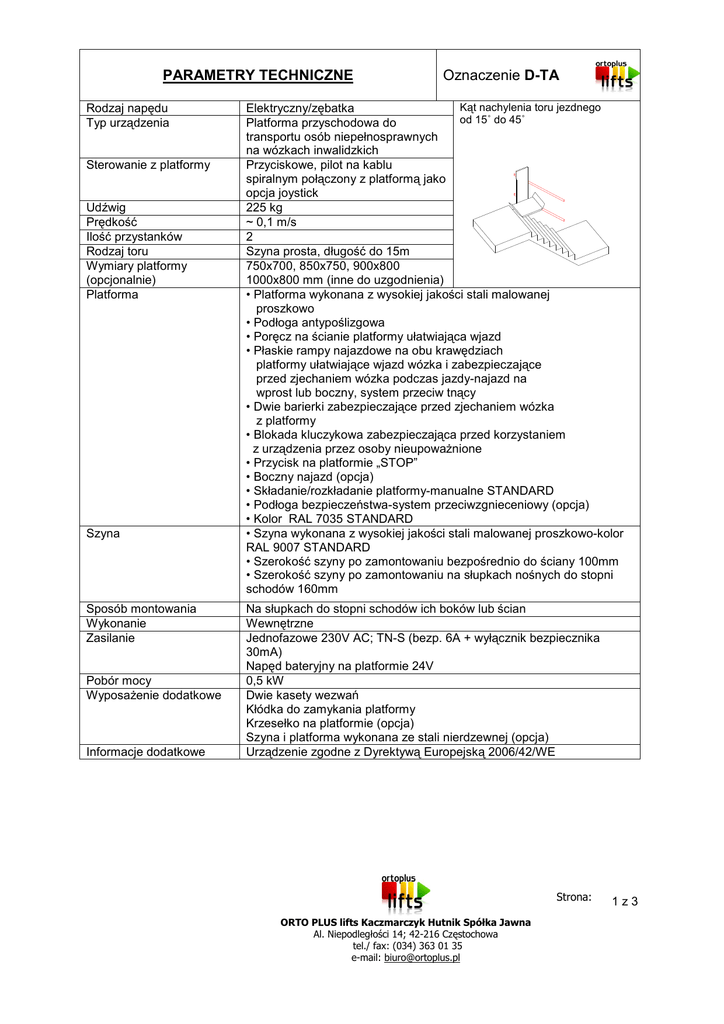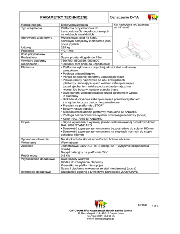PARAMETRY TECHNICZNE Rodzaj napędu Typ urządzenia Sterowanie z platformy Udźwig Prędkość Ilość przystanków Rodzaj toru Wymiary platformy (opcjonalnie) Platforma Szyna Sposób montowania Wykonanie Zasilanie Pobór mocy Wyposażenie dodatkowe Informacje dodatkowe Oznaczenie D-TA Kąt nachylenia toru jezdnego Elektryczny/zębatka od 15˚ do 45˚ Platforma przyschodowa do transportu osób niepełnosprawnych na wózkach inwalidzkich Przyciskowe, pilot na kablu spiralnym połączony z platformą jako opcja joystick 225 kg ~ 0,1 m/s 2 Szyna prosta, długość do 15m 750x700, 850x750, 900x800 1000x800 mm (inne do uzgodnienia) • Platforma wykonana z wysokiej jakości stali malowanej proszkowo • Podłoga antypoślizgowa • Poręcz na ścianie platformy ułatwiająca wjazd • Płaskie rampy najazdowe na obu krawędziach platformy ułatwiające wjazd wózka i zabezpieczające przed zjechaniem wózka podczas jazdy-najazd na wprost lub boczny, system przeciw tnący • Dwie barierki zabezpieczające przed zjechaniem wózka z platformy • Blokada kluczykowa zabezpieczająca przed korzystaniem z urządzenia przez osoby nieupoważnione • Przycisk na platformie „STOP” • Boczny najazd (opcja) • Składanie/rozkładanie platformy-manualne STANDARD • Podłoga bezpieczeństwa-system przeciwzgnieceniowy (opcja) • Kolor RAL 7035 STANDARD • Szyna wykonana z wysokiej jakości stali malowanej proszkowo-kolor RAL 9007 STANDARD • Szerokość szyny po zamontowaniu bezpośrednio do ściany 100mm • Szerokość szyny po zamontowaniu na słupkach nośnych do stopni schodów 160mm Na słupkach do stopni schodów ich boków lub ścian Wewnętrzne Jednofazowe 230V AC; TN-S (bezp. 6A + wyłącznik bezpiecznika 30mA) Napęd bateryjny na platformie 24V 0,5 kW Dwie kasety wezwań Kłódka do zamykania platformy Krzesełko na platformie (opcja) Szyna i platforma wykonana ze stali nierdzewnej (opcja) Urządzenie zgodne z Dyrektywą Europejską 2006/42/WE Strona: ORTO PLUS lifts Kaczmarczyk Hutnik Spółka Jawna Al. Niepodległości 14; 42-216 Częstochowa tel./ fax: (034) 363 01 35 e-mail: [email protected] 1z3 KARTA WYMIARÓW PLATFORMA DELTA UWAGA: Podane wymiary na niniejszym schemacie są wymiarami orientacyjnymi uzależnionymi od miejsca instalacji urządzenia oraz od wyposażenia urządzenia. Strona: ORTO PLUS lifts Kaczmarczyk Hutnik Spółka Jawna Al. Niepodległości 14; 42-216 Częstochowa tel./ fax: (034) 363 01 35 e-mail: [email protected] 2z3 ZDJECIA Z INSTALACJI Strona: ORTO PLUS lifts Kaczmarczyk Hutnik Spółka Jawna Al. Niepodległości 14; 42-216 Częstochowa tel./ fax: (034) 363 01 35 e-mail: [email protected] 3z3