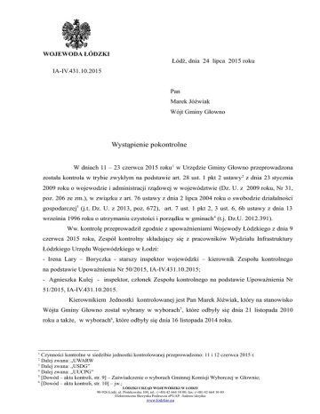 WOJEWODA ŁÓDZKI Łódź, dnia 24 lipca 2015 roku IA-IV.431.10.2015 Pan Marek Jóźwiak Wójt Gminy Głowno Wystąpienie pokontrolne W dniach 11 – 23 czerwca 2015 roku 1 w Urzędzie Gminy Głowno przeprowadzona została kontrola w trybie zwykłym na podstawie art. 28 ust. 1 pkt 2 ustawy 2 z dnia 23 stycznia 2009 roku o wojewodzie i administracji rządowej w województwie (Dz. U. z 2009 roku, Nr 31, poz. 206 ze zm.), w związku z art. 76 ustawy z dnia 2 lipca 2004 roku o swobodzie działalności gospodarczej3 (j.t. Dz. U. z 2013, poz. 672), art. 7 ust. 1 pkt 2, 3 ust. 6, 6b ustawy z dnia 13 września 1996 roku o utrzymaniu czystości i porządku w gminach4 (t.j. Dz.U. 2012.391). Ww. kontrolę przeprowadził zgodnie z upoważnieniami Wojewody Łódzkiego z dnia 9 czerwca 2015 roku, Zespół kontrolny składający się z pracowników Wydziału Infrastruktury Łódzkiego Urzędu Wojewódzkiego w Łodzi: - Irena Lary – Boryczka - starszy inspektor wojewódzki – kierownik Zespołu kontrolnego na podstawie Upoważnienia Nr 50/2015, IA-IV.431.10.2015; - Agnieszka Kulej - inspektor, członek Zespołu kontrolnego na podstawie Upoważnienia Nr 51/2015, IA-IV.431.10.2015. Kierownikiem Jednostki kontrolowanej jest Pan Marek Jóźwiak, który na stanowisko Wójta Gminy Głowno został wybrany w wyborach 5, które odbyły się dnia 21 listopada 2010 roku a także, w wyborach6, które odbyły się dnia 16 listopada 2014 roku. 1 Czynności kontrolne w siedzibie jednostki kontrolowanej przeprowadzono: 11 i 12 czerwca 2015 r. Dalej zwana: „UWARW 3 Dalej zwana: „USDG” 4 Dalej zwana: „UUCPG” 5 [Dowód – akta kontroli, str. 9] – Zaświadczenie o wyborach Gminnej Komisji Wyborczej w Głownie; 6 [Dowód – akta kontroli, str. 10] – jw.; 2 ŁÓDZKI URZĄD WOJEWÓDZKI W ŁODZI 90-926 Łódź, ul. Piotrkowska 104, tel.: (+48) 42 664 10 00, fax: (+48) 42 664 10 40 Elektroniczna Skrzynka Podawcza ePUAP: /lodzuw/skrytka www.lodzkie.eu Sekretarzem Gminy Głowno jest Pani Jolanta Szkup, której stanowisko 7 Sekretarza Gminy zostało powierzone na podstawie Umowy o pracę zawartej w Głownie w dniu 30 sierpnia 2013 roku na czas nieokreślony w pełnym wymiarze czasu pracy. Zakres kontroli: wykonywanie przez Wójta Gminy Głowno w 2013, 2014 i 2015 roku (do czasu rozpoczęcia kontroli), zadania zleconego z zakresu administracji rządowej polegającego na wydawaniu, odmowie wydania, zmianie zakresu i cofnięciu podmiotom zewnętrznym zezwoleń na prowadzenie działalności dotyczącej ochrony przed bezdomnymi zwierzętami, opróżnianiu zbiorników bezodpływowych i transportu nieczystości ciekłych, a także prowadzeniu w formie elektronicznej rejestrów wydanych i cofniętych zezwoleń. Poza ogólnie obowiązującymi przepisami prawa, związanymi z udzielaniem zezwoleń przez Wójta Gminy Głowno na prowadzenie przez przedsiębiorców działalności w ww. zakresie, znaczenie mają również przepisy lokalne. Rada Gminy Głowno podjęła w tym zakresie: a. Uchwałę Nr XXXII/153/13 z dnia 27 lutego 2013 roku w sprawie określenia wymagań, jakie powinien spełniać przedsiębiorca ubiegający się o uzyskanie zezwolenia na prowadzenie działalności w zakresie opróżniania zbiorników bezodpływowych i transportu nieczystości ciekłych na terenie Gminy Głowno. [Dowód – akta kontroli – str. 19 - 22]; b. Uchwałę Nr XVI/84/12 Rady Gminy Głowno z dnia 31 stycznia 2012 roku w sprawie określenia wymagań, jakie powinni spełniać przedsiębiorcy ubiegający się o uzyskanie zezwolenia na prowadzenie działalności w zakresie ochrony przed bezdomnymi zwierzętami, prowadzenia schronisk dla bezdomnych zwierząt, a także grzebowisk i spalarni zwłok zwierzęcych lub ich części na terenie Gminy Głowno. [Dowód – akta kontroli – str. 23 - 30]; Okres objęty kontrolą: 2013, 2014 i 2015 rok ( do czasu rozpoczęcia kontroli). Przed kontrolą uzyskano informację z Urzędu Gminy Głowno o ilości wydanych przez Wójta Gminy zezwoleń (decyzji) w zakresie: ochrony przed bezdomnymi zwierzętami – wydano jedną decyzję ( poza okresem objętym kontrolą); opróżniania zbiorników bezodpływowych i transportu nieczystości ciekłych - wydano trzy decyzje (z czego jedna mieści się w okresie objętym kontrolą). Z uwagi na powyższe kontrolą zostało objętych 100% złożonych wniosków i decyzji mieszczących się w zakresie objętym kontrolą (od 2013 do 2015 do czasu rozpoczęcia kontroli). W związku z tym kontrolujący pracownicy Wydziału Infrastruktury Łódzkiego Urzędu 7 [Dowód – akta kontroli, str. 11 - 18] - Umowa o pracę na czas nieokreślony, Karta pracy; 2 Wojewódzkiego w Łodzi dokonali w Urzędzie Gminy Głowno analizy przedłożonej do kontroli dokumentacji dotyczącej wydawania zezwoleń na prowadzenie przez przedsiębiorców działalności w zakresie opróżniania zbiorników bezodpływowych i transportu nieczystości ciekłych a także prowadzeniu w formie elektronicznej rejestrów wydanych, cofniętych zezwoleń. Na podstawie niżej opisanych ustaleń, wykonanie przez Wójta Gminy Głowno zadania zleconego z zakresu administracji rządowej (wydawanie, odmowa wydania, zmiana zakresu i cofnięcie podmiotom zewnętrznym zezwoleń na prowadzenie działalności dotyczącej opróżnianiu zbiorników bezodpływowych i transportu nieczystości ciekłych, a także prowadzeniu w formie elektronicznej rejestrów wydanych i cofniętych zezwoleń), ocenia się pozytywnie z nieprawidłowościami: Ustalenia kontroli: Wójt Gminy Głowno przyjął złożony przez przedsiębiorcę 8 wniosek o udzielenie 1. zezwolenia na prowadzenie działalności w zakresie opróżniania zbiorników bezodpływowych i transportu nieczystości ciekłych, który wpłynął do Urzędu Gminy Głowno w dniu 11 maja 2015 roku. Wniosek9 o udzielenie zezwolenia na prowadzenie działalności w zakresie opróżniania 2. zbiorników bezodpływowych i transportu nieczystości ciekłych złożony przez Przedsi