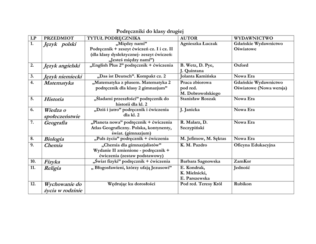 Podręczniki do klasy drugiej LP 1. PRZEDMIOT 2. Język angielski 3. 4. Język niemiecki Matematyka 5. Historia 6. 7. Wiedza o społeczeństwie Geografia 8. 9. Biologia Chemia 10. 11. Fizyka Religia 12. Wychowanie do życia w rodzinie Język polski TYTUŁ PODRĘCZNIKA „Między nami” Podręcznik + zeszyt ćwiczeń cz. I i cz. II (dla klasy dyslektycznej- zeszyt ćwiczeń: „Jesteś między nami”) „English Plus 2” podręcznik + ćwiczenia „Das ist Deutsch”. Kompakt cz. 2 „Matematyka z plusem. Matematyka 2 podręcznik dla klasy 2 gimnazjum” „Śladami przeszłości” podręcznik do historii dla kl. 2 „Dziś i jutro” podręcznik i ćwiczenia dla kl. 2 „Planeta nowa” podręcznik + ćwiczenia Atlas Geograficzny. Polska, kontynenty, świat. (gimnazjum) „Puls życia” podręcznik + ćwiczenia „Chemia dla gimnazjalistów” Wydanie II zmienione - podręcznik + ćwiczenia (zestaw podstawowy) „Świat fizyki” podręcznik + ćwiczenia „ Błogosławieni, którzy ufają Jezusowi” Wędrując ku dorosłości AUTOR Agnieszka Łuczak WYDAWNICTWO Gdańskie Wydawnictwo Oświatowe B. Wetz, D. Pye, J. Quintana Jolanta Kamińska Praca zbiorowa pod red. M. Dobrowolskiego Stanisław Roszak Oxford J. Janicka Nowa Era R. Malarz, D. Szczypiński Nowa Era M. Jefimow, M. Sęktas K. M. Pazdro Nowa Era Oficyna Edukacyjna Barbara Sagnowska E. Kondrak, K. Mielnicki, E. Parszewska Pod red. Teresy Król ZamKor Jedność Nowa Era Gdańskie Wydawnictwo Oświatowe (Nowa wersja) Nowa Era Rubikon