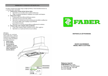 PROBLEMY W TRAKCIE UŻYTKOWANIA W trakcie użytkowania okapu mogą wystąpić problemy. Przed skontaktowaniem się z serwisem należy sprawdzić: 1) Podczas pracy okapu słychać dziwny hałas: • Sprawdzić czy wszystkie śruby są dobrze dokręcone; • Zdjąć ewentualne przedmioty znajdujące się na półce nad okapem. 2) Okap się nie włącza: • Przeprowadzić prawidłową kalibrację sensora; • Sprawdzić pozycję sterownika silnika; • Sprawdzić czy łącznik przewodu zasilania jest prawidłowo podłączony do wtyczki silnika, która znajduję się pod filtrami przeciwtłuszczowymi; • Sprawdzić czy wtyczka jest prawidłowo podłączona do zasilania; 3) Okap pracuje mało wydajnie (słabo pochłania): • Umyć filtry metalowe bądź wymienić na nowe filtry węglowe; • Sprawdzić czy wyjście powietrza nie jest zatkane. UWAGA: Kontaktując się z serwisem należy podać dane z tabliczki znamionowej znajdującej się wewnątrz okapu pod filtrami przeciwtłuszczowymi: 1) Model okapu, 2) Kod produktu, 3) Data produkcji 4) znajdujący się obok tabliczki znamionowej numer Inspektora kontroli jakości INSTRUKCJA UŻYTKOWANIA OKAPU KUCHENNEGO MODEL WEST & COTTAGE Wyłączny importer DOM BIANCO sp. z o.o. al. Krakowska 5, 05-090 Raszyn tel. 0-22 7201198, 7201199 fax 0-22 7200688 -2- - 15 - 1. ZALECENIA I SUGESTIE Szanowni Państwo. Zastosowanie się do zaleceń i sugestii zawartych w niniejszej instrukcji, pozwoli Państwu zachować przez długi czas sprawność i żywotność okapu. Przed przystąpieniem do montażu okapu kuchennego należy przewidzieć ewentualne trudności, jakie mogą powstać podczas montażu i użytkowania urządzenia. Prace montażowe powinny być wykonywane przez odpowiednio przeszkolony i wykwalifikowany personel. Sposób podłączenia urządzenia do instalacji wentylacyjnych i elektrycznych musi odpowiadać obowiązującym przepisom prawa i normom, a w szczególności postanowieniom rozporządzenia Ministra Infrastruktury z dnia 12 kwietnia 2002 r w sprawie warunków technicznych, jakim powinny odpowiadać budynki i ich usytuowanie (Dz. U. nr 75 z 2002 r. poz. 690). 1.1. Instalacja ♦ Producent i dystrybutor nie ponoszą żadnej odpowiedzialności prawnej i/lub materialnej za wszelkie straty materialne i/lub szkody w zdrowiu albo życiu ludzkim spowodowane niewłaściwą instalacją urządzenia. ♦ Minimalna odległość między dolną powierzchnią okapu a najwyższym punktem płyty grzewczej (kuchni), nad którą jest umieszczony, powinna wynosić 650 mm. ♦ Należy upewnić się, czy napięcie i częstotliwość prądu w domowej instalacji elektrycznej odpowiadają wartościom podanym na tabliczce znamionowej. ♦ Okap w wersji wyciąg łączymy z kanałami wentylacyjnymi lub otworem w zewnętrznej ścianie budynku za pomocą elastycznych lub sztywnych rur o minimalnej średnicy 120 mm. Długość podłączenia i kanału wentylacyjnego powinna być jak najmniejsza. W przypadku stosowania rur o przekrojach innych niż okrągłe, pole ich przekroju poprzecznego powinno wynosić co najmniej 115 cm2. ♦ Nie wolno podłączać okapu w wersji wyciąg do kanałów, którymi są odprowadzane spaliny z innych urządzeń (podgrzewaczy wody, kotłów c.o., kominków itp.). ♦ Jeżeli w pomieszczeniu, w którym jest zainstalowany okap, funkcjonują także inne urządzenia zasilane energią inną niż elektryczna (np. gazem), to należy zapewnić odpowiednią wentylację takiego pomieszczenia w celu niedopuszczenia do nawrotu spalin do pomieszczenia. Pomieszczenie powinno być wyposażone w otwór w ścianie zewnętrznej budynku zapewniający dopływ odpowiedniej ilości świeżego powietrza. Rys. 12. Zespół oświetlenia i wymiana żarówki. -3- - 14 - 1.2. Użytkowanie ♦ Okap kuchenny został zaprojektowany wyłącznie do użytkowania w gospodarstwach domowych w celu eliminowania substancji zapachowych powstających podczas gotowania i/lub smażenia oraz pieczenia potraw. Rys. 10. Metalowe filtry przeciwtłuszczowe. Rys. 11. Filtry węglowe ♦ ♦ Nie wolno używać okapu do celów innych, niż podane w poprzednim punkcie. Nie wolno pozostawiać pod okapem włączonych palników gazowych ustawionych na maksymalną wielkość płomienia. - 13 - -4♦ Wielkość płomienia należy regulować tak, aby nie wychodził on poza obręb naczynia ustawionego nad danym palnikiem. ♦ Podczas smażenia na tłuszczu naczynie musi znajdować się pod stałym dozorem, gdyż przegrzany lub pryskający tłuszcz może ulec zapaleniu. ♦ Dzieci oraz osoby nie zapoznane z instrukcją obsługi urządzenia nie mogą go użytkować. 1.3. Obsługa techniczna ♦ ♦ ♦ Przed przystąpieniem do jakichkolwiek prac związanych z obsługą techniczną okapu (w tym z czyszczeniem) urządzenie należy odłączyć od źródła zasilania elektrycznego. Filtry należy czyścić i/lub wymieniać w zalecanych przez producenta odstępach czasu. Okap czyścimy za pomocą wilgotnej szmatki i płynnego środka do mycia naczyń. Rys. 8. Montaż ramy ozdobnej. 2. PARAMETRY 2.1. Wymiary Podstawowe wymiary okapu oraz wykończeniowych zostały podane na rys. 1. opcjonalnych elementów 2.2. Elementy składowe (rys. 2) 1 Nr Ilość 1 2 8 9 10 20 1 1 1 1 1 7.1 7.2 11 12a 12e 12m 12n 1 1 4 4 2 6 4 Zakres dostawy fabrycznej Korpus okapu wyposażony w panel sterowania, zespół oświetleniowy, silnik i filtry Maskownica komina Kratka wylotowa Kołnierz redukcyjny ∅150/120 mm Drewniana rama do pomalowania Drewniana listewka do pomalowania Elementy montażowe Uchwyt naścienny korpusu okapu Uchwyt naścienny maskownicy komina Kołki rozporowe Wkręty 4,2x44,4 mm Wkręty 2,9x6,5 mm Wkręty 2,9x18 mm Wkręty 3,5x30 mm Rys. 9. Panel sterowania -5- - 12 - 3. INSTALACJA Rys. 6. Wersja wyciąg. 3.1. Rozmieszczenie otworów montażowych i mocowanie uchwytów naściennych (rys. 3 Zaznaczanie miejsc wykonania otworów montażowych 1. Na ścianie narysować pionową linię wychodzącą ze śladu osi sym
