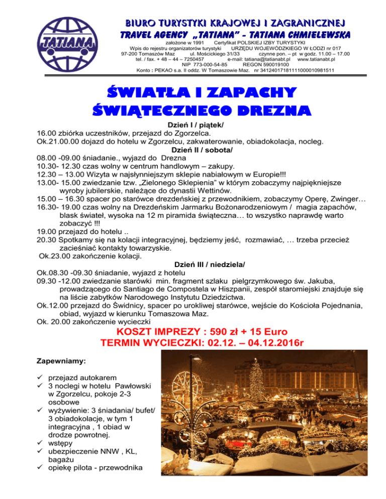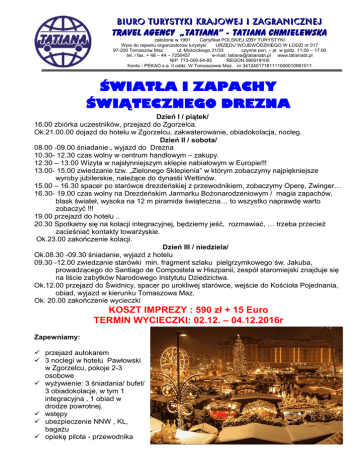 Biuro Turystyki Krajowej i Zagranicznej Travel agency „Tatiana” - tatiana Chmielewska założone w 1991 Certyfikat POLSKIEJ IZBY TURYSTYKI Wpis do rejestru organizatorów turystyki URZĘDU WOJEWÓDZKIEGO W ŁODZI nr 017 97-200 Tomaszów Maz ul. Mościckiego 31/33 czynne pon. – pt w godz. 11.00 – 17.00 tel. / fax. + 48 – 44 – 7250457 e-mail: [email protected] www.tatianabt.pl NIP 773-000-54-85 REGON 590019100 Konto : PEKAO s.a. II oddz. W Tomaszowie Maz. nr 34124017181111000010981511 ŚWIATŁA I ZAPACHY ŚWIĄTECZNEGO DREZNA Dzień I / piątek/ 16.00 zbiórka uczestników, przejazd do Zgorzelca. Ok.21.00.00 dojazd do hotelu w Zgorzelcu, zakwaterowanie, obiadokolacja, nocleg. Dzień II / sobota/ 08.00 -09.00 śniadanie., wyjazd do Drezna 10.30- 12.30 czas wolny w centrum handlowym – zakupy. 12.30 – 13.00 Wizyta w najsłynniejszym sklepie nabiałowym w Europie!!! 13.00- 15.00 zwiedzanie tzw. „Zielonego Sklepienia” w którym zobaczymy najpiękniejsze wyroby jubilerskie, należące do dynastii Wettinów. 15.00 – 16.30 spacer po starówce drezdeńskiej z przewodnikiem, zobaczymy Operę, Zwinger… 16.30- 19.00 czas wolny na Drezdeńskim Jarmarku Bożonarodzeniowym / magia zapachów, blask świateł, wysoka na 12 m piramida świąteczna… to wszystko naprawdę warto zobaczyć !!! 19.00 przejazd do hotelu .. 20.30 Spotkamy się na kolacji integracyjnej, będziemy jeść, rozmawiać, … trzeba przecież zacieśniać kontakty towarzyskie. Ok.23.00 zakończenie kolacji. Dzień III / niedziela/ Ok.08.30 -09.30 śniadanie, wyjazd z hotelu 09.30 -12.00 zwiedzanie starówki min. fragment szlaku pielgrzymkowego św. Jakuba, prowadzącego do Santiago de Compostela w Hiszpanii, zespół staromiejski znajduje się na liście zabytków Narodowego Instytutu Dziedzictwa. Ok.12.00 przejazd do Świdnicy, spacer po urokliwej starówce, wejście do Kościoła Pojednania, obiad, wyjazd w kierunku Tomaszowa Maz. Ok. 20.00 zakończenie wycieczki KOSZT IMPREZY : 590 zł + 15 Euro TERMIN WYCIECZKI: 02.12. – 04.12.2016r Zapewniamy: przejazd autokarem 3 noclegi w hotelu Pawłowski w Zgorzelcu, pokoje 2-3 osobowe wyżywienie: 3 śniadania/ bufet/ 3 obiadokolacje, w tym 1 integracyjna , 1 obiad w drodze powrotnej. wstępy ubezpieczenie NNW , KL, bagażu opiekę pilota - przewodnika