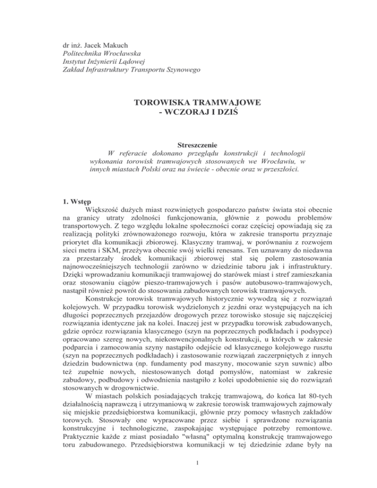 TOROWISKA TRAMWAJOWE Streszczenie ! ! # $% ! " #$ " #& $ % # ! !& !& $ !" $ ! priorytet dla komunikacji zbiorowej. Klasyczny tramwaj, w porównaniu z rozwojem '( " $! ) # ! ! # ! ! $ ! * ! ! ! $ &$ + ! $ + ! " & #$ $ ! Konstrukcje torowisk tramwajowych histor & & ! ! !& # ! $ ! ! ! & ! , !! " $ & # . opracowano szereg nowych, niekonwencjonalnych konstrukcji, u których w zakresie & # ! ! # . & dziedzin budownictwa (np. fundamenty pod maszyny, mocowanie szyn suwnic) albo # " & #$ " " & # & stosowanych w drogownictwie. !& ! ! &" /0+ # & & & ! ! # ! !" #$ # # $ ' # & ! " !!& !& 1 # 2 # &2 & ! ! 1 ! ! # 1 # #" ! & $ U # /0+ # ! $ 1! # & & ! + ! $ " ! &# " ! ! ! # ! & !& # ! & & ! # & # ! ! " ! &4 ! !# ! !& ! !& $ # " ! ' & $ % ( # 25 # - ! $ # ! #& #$ 30+ " !& ! !" & ! . 4 & !& ! & & # 2 6330 ! ! # . & 25 $ 2 6337 # # ! & ! ! ! & $ 1! # " ! 8 − # - ! ." − & #& & infrastruktury podziemnej), − ! # " & ." − $ & " & ." − estet & $ ! $ zabudowanych, bezpodsypkowych torowisk), − . * ! & # ! # $ ! ! ! # $ " # & ! 9 & # $ ! " !& & $ & " ! + ! ! & 30+ " & # & ! $ ! :6; 1 ! $ # :<;" $ $ $ 60 # & 1 & ! ! ! $ & # " Polski oraz poza granicami naszego kraju, przy czym w dwu ostatnich przypadkach ! !" $ ! & # # 2 W zakresie torowisk wydzielonych, w ! # # <0 !& ! # 9 # # '=< '=3 ! 2(2 ! 6/0 ' # " # $ ! 63>7 # (belkowe i blokowe) jednak do czasu umieszczania w nich dybli drewnianych nie # 5 ! # $ # ,9?(= 1?'6.! # ! * '?+@ # # $ strunobetonowych do budowy tramwajowych torowisk wydzielonych. Po raz pierwszy # # '?+@ 633@ # ?# !- 6." # '=3 # 1'/@ A & !& !& 8 # # $ B ! # ! ! # & B ! '?@ do przytwierdzenia typu "K". A 61 $! ! ?# ! Przytwierdzenie SB3 do kotwienia szyny rowkowej wykorzystano po raz pierwszy przy 1 $ C -633>. # D " # 1')3= # @0 ! ! <0 " ! #$ & =E " # $ # 6" <0 9 ! # ! !'=3 # . # # D -633@ 633F. G -633>. " ! # >0+ # 1( $# , , G& !1 # ! # ! :@; <" $ # & # $ ! F0 /0+ - 8 3 ' 1989). ' +63/3" H + & # # # <0 + @0 " $ ! # 6/0 ' #& # 1 ! # szyn podpartych tymczasowo drewnianymi klinami wykonywano pod ich stopkami # > $ ' % $ # # 6@<×107×6< !& + !" " $ & @ +7 1 $! ! !" $ # & & & & A <1 $! ! ! ! # F0 /0+ ! ! ! - . # @+7 & 1 6337 " -67 ! . -@ ! $ ! .% # $ & !& 1 #$ & /0+ # +63/3" 5 # & - ( !" - H ? # " # + #$ "# # ! # # " # ! & +6330" ' ! ! 1# #& # +6336." ! +6336. + & #" & " !& # ! A ! #! % # # !& ! -67 ." ?<7-<7 . 1 ?67 -3 ." -7 I = . 4 # 0" F7 ! 63/F 9 ! ! & # # 1 ! # #& - 6" 7 . ! & 1 ( # # # " A @1 $! # # # 11) :="7; @ @00×223,5×@0 # 67 +<0 # # - @ ." !& # !1)6/0 ! # & ' # ! ! !8 & & & # J< & # & # &" # & &+ & # $ ! # 1 ! ! # PPT && # & $ ! 8 K +' # ! H % + 1988, Nowowiejska i Piastowska - 1989, Reymonta - 1990, Trzebnicka - 1991. Niestety ! # ! 8 $ " !" # ! # # # 5 & 9 ! ! 1 !" # 6333 ! , , G& ! 1 # !:>; $ !& ponad 10 letniej eksploatacji analizowanego torowiska wskazano jednak na pewne ! & 8 − -6" 7 ." − # $ # # + ." − # # ! # 11) & &" #& ! # !$ ! # $ # # !. ! # 5 # # − − − ! # & 11) ." # # ! # - SB albo skl), zastosowania), ! # 11) #! " $ − # 11) $ + # # ! # #" " ! 633@ 5 # # K " # $ #. # 11) # 1 & + < !& !& # 11) # K +' # !" 633> " wzorowane na konstrukcji torowiska z Sheffield w Anglii. Szyny " & @ # # # 11) ( # & " # 9 # &# ! #& 1 ! ! # " & # 11) 633< '& ! ! & = $ " & & & % A 9 − =1 $! ! '& # & z komorami & $ . & # ! # ! ! & #8 # !" ! & $ ∅ 10, z umieszczonymi podczas betonowania dyblami z tworzywa sztucznego w rozstawie co 2,25 cm, 6 − # ! " ! &# − ( K 1# ! !" # ! !& " " $ J C ! <0 ! 6 '# !+633@ + 633= ! G $ ! + 633=" !# ! ## + 6337" # ! ! !" ! siatki umieszczano w warstwie podbudowy betonowej. W obu ostatnich przypadkach !" # ! & & 1 ! '& !! " ! !& $ !" !& ! # " & ! H ! ! & 1# " ! ! ! # $ ! #& Obecnie konstrukcja torowiska tego typu nie jest stosowana. 633= H ! ' D " $L ! & ( &" zastosowano typ konstrukcji torowiska przedstawiony na rys.5. A 71 $! ! H 9 ! # − − !& ! # ! " ! − − A #$ ." < " $ " ! & 8 " ! @0 H ! $ " & & ! % ! #& $L ! # ! 7 6 # #& M ( ! 70 ! ) ! ! + 6337" & $ # +6337" $ H ! % D 5 , !+6337 # $ M 1 & # G& !1 # $ & " +633F H * !:F;" 6337 ! − − # !+633F !" # # +6337 ! # !& &" − # rozporowego, ( 6333 !& − # ( 5 &G $ ! + ! # , 633= & 8 . !." $ # -< ." # SB albo skl), − niekorzystny - niejednorodny model podparcia szyny (pasy gumy z przerwami), − brak poprzeczek torowych (niezgodny z wytycznymi projektowania torów tramwajowych), − # $ " − w wyniku zastosowania tylko jednej warstwy betonu asfaltowego zamiast dwóch ! & & !. Obecnie konstrukcja torowiska tego typu nie jest stosowana. 633= J 1 " # >" >0+ ? :/;" $L ! K :3;" & # 1 :60"66; Rys.6 Przekrój konstrukcyjny toru zastosowanego na ul. Poniatowskiego 8 1 - # & ! &# ! !. ! ! # " ! ! ! &# !& ! " !# N # # ! $ ! ! ! ." !& ! ! # ' # # $ $ 1 # !& 6/ " <" <0 " ! $ # 87" 3/7 B<" 3 B6" =6 0" >>7 9 # # " ! $ $ ! & 8 − # ! " − # # # !" ! ! $" − #& " − ! # " − $# # & # # &# podparciu i zamocowaniu szyn, − wyeliminowanie dodatkowych warstw nawierzchni, − ! # & $ #& & ." − # " ." − nia podbudowy bez warstw z betonu cementowego (skrócenie ! ! . ) # ! ! ! ! # ! # 30+ $ " # & & & # ! !& 8 ) ( 1# +633>" $ !+633F" 1 5 &G ## +633/" ' !' !+633/" ) ( 1# +6333" H D +6333" C ! M ( ! ! + 6333" ! 1 $ C ! ! !+6333" ( ##& ! +6333" G ! 9 5 Groszu oraz przejazd w ul. Lotniczej przy domie handlowym Astra - 2000, ul. Skargi <006 $ 8 C + 633F 1 ! C ( +<000 & ! # ! ) ! ! ! # & 8' + 633/ ) +6333" $ & ! # # 5 " ! !" &! " $ ! 1 " ! stopniowe odchodzenia od stosowania konstrukcji tego typu: − !" − utrudnione ! ! #$ ! podziemnego, − ! & $ " 9 − − − − ! ! podbudowy z asfaltobetonu, # #" # ! # ! # " 9 " ! ! # 11) & ! ! !& # ! & " 9 & − &# − # − wyelimin − # " $ ! 11)" & ! # " ! 8 " # ! !& # ! !" #& ? " -# & # & ! & 1# # !! & !. # # 11) 633> D 1 $ C # ! & rys.7. A 9 − − − − − − F1 $! ! 1 & #8 typ szyny rowkowej Ri60N zamiast 180S, $ 0" >F " 1)6/0 $" ! " & #& # & & ." # > # & & F # & &" # 6< " spawanie termitowe szyn, # ! & 10 $ C # ! + ! & & & & 633F C ! 1 przedst