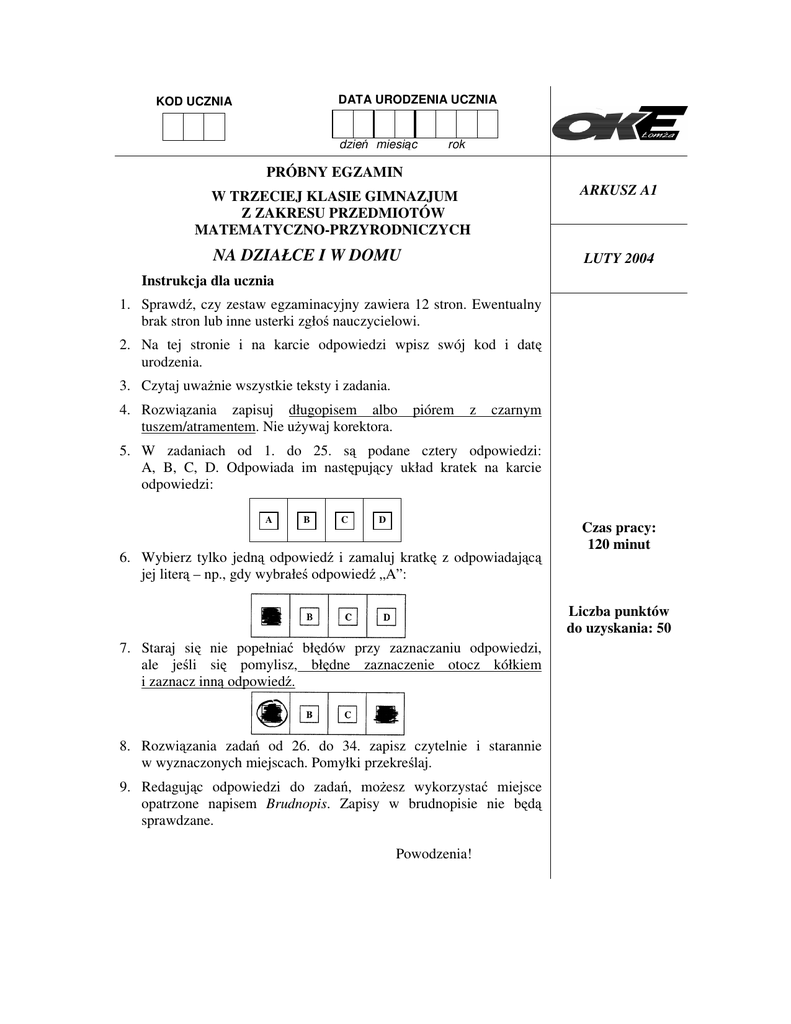 DATA URODZENIA UCZNIA KOD UCZNIA dzie miesi c rok PRÓBNY EGZAMIN ARKUSZ A1 W TRZECIEJ KLASIE GIMNAZJUM Z ZAKRESU PRZEDMIOTÓW MATEMATYCZNO-PRZYRODNICZYCH NA DZIAŁCE I W DOMU LUTY 2004 Instrukcja dla ucznia 1. Sprawd , czy zestaw egzaminacyjny zawiera 12 stron. Ewentualny brak stron lub inne usterki zgło nauczycielowi. 2. Na tej stronie i na karcie odpowiedzi wpisz swój kod i dat urodzenia. 3. Czytaj uwa nie wszystkie teksty i zadania. 4. Rozwi zania zapisuj długopisem albo tuszem/atramentem. Nie u ywaj korektora. piórem z czarnym 5. W zadaniach od 1. do 25. s podane cztery odpowiedzi: A, B, C, D. Odpowiada im nast puj cy układ kratek na karcie odpowiedzi: A B C D 6. Wybierz tylko jedn odpowied i zamaluj kratk z odpowiadaj c jej liter – np., gdy wybrałe odpowied „A”: Czas pracy: 120 minut Liczba punktów do uzyskania: 50 7. Staraj si nie popełnia bł dów przy zaznaczaniu odpowiedzi, ale je li si pomylisz, bł dne zaznaczenie otocz kółkiem i zaznacz inn odpowied . 8. Rozwi zania zada od 26. do 34. zapisz czytelnie i starannie w wyznaczonych miejscach. Pomyłki przekre laj. 9. Redaguj c odpowiedzi do zada , mo esz wykorzysta miejsce opatrzone napisem Brudnopis. Zapisy w brudnopisie nie b d sprawdzane. Powodzenia! Zadanie 1. (0–1) Rysunek przedstawia schemat działki. N 1 2 4 3 W południowo-wschodniej cz ci działki urz dzony jest ogródek skalny. Która cyfra go oznacza? A. 1 B. 2 C. 3 D. 4 Zadanie 2. (0-1) Dwie prostok tne grz dki warzywne maj równe pola. Jedna z nich ma wymiary 5 m i 4,2 m. Jak długo ma druga grz dka, je eli jej szeroko wynosi 3 m? A. 62 cm B. 70 cm C. 620 cm D. 700 cm Zadanie 3. (0-1) Wykres przedstawia wpływ temperatury, CO2 i nat enia o wietlenia na intensywno fotosyntezy. fotosyntezy 0,13% CO2 30°C intensywno 0,13% CO2 20°C 0,03% CO2 20°C i 30°C nat enie o wietlenia Na podstawie: Biologia, Praca zbiorowa, Warszawa 1989. Intensywno fotosyntezy ro lin uprawianych w szklarniach jest najwi ksza przy wysokim nat eniu o wietlenia oraz A. B. C. D. temperaturze 30°C i atmosferze wzbogaconej w CO2. temperaturze 20°C i atmosferze wzbogaconej w CO2. temperaturze 20°C i atmosferycznym st eniu CO2. temperaturze 30°C i atmosferycznym st eniu CO2. Strona 2 z 12 Zadanie 4. (0-1) Dojrzewanie zielonych pomidorów przechowywanych w pomieszczeniach mo na przyspieszy stosuj c eten (C2H4). Jest to zwi zek chemiczny zaliczany do A. kwasów karboksylowych. C. w glowodorów nienasyconych. B. w glowodorów nasyconych. D. alkoholi jednowodorotlenowych. Zadanie 5. (0-1) W uprawach ekologicznych nie stosuje si A. B. C. D. obornika do nawo enia gleby. pestycydów do walki ze szkodnikami. ro lin motylkowych do nawo enia gleby. biologicznych metod walki ze szkodnikami. Zadanie 6. (0-1) W celu obni enia kwasowo ci gleby mo na nawozi j zwi zkami A. krzemu. B. siarki. C. wapnia. D. azotu. Zadanie 7. (0-1) Ła cuchy pokarmowe obrazuj przepływ energii pomi dzy poszczególnymi gatunkami w ekosystemie. Najmniejsze straty energii wyst pi w ła cuchu A. B. C. D. kapusta → człowiek. pszenica → mysz → kot. kapusta → limak → jaszczurka. ziemniak → stonka → kuropatwa → jastrz b. Zadanie 8. (0-1) Na rysunku przedstawiono ukształtowanie terenu, na którym znajduje si działka. ALTANKA 26 22 24 20 22 20 Wysoko wzgl dna mi dzy miejscem, w którym stoi altanka a strumieniem jest równa co najmniej A. 6 m B. 20 m C. 26 m Strona 3 z 12 D. 46 m Zadanie 9. (0-1) Marmur jest przeobra on skał wapienn . Wapie powstał A. B. C. D. z zastygłej lawy wewn trz Ziemi. z zastygłej lawy na powierzchni Ziemi. ze szcz tków zwierz cych na dnie mórz. ze scementowanych ziaren piasku na dnie mórz. Zadanie 10. (0-1) Drabina opiera si o budynek na wysoko ci 3 m. Jej dolny koniec jest odsuni ty od ciany o 2 m. Jaka jest długo drabiny? A. 2m B. 5m C. 10 m D. 13 m Zadanie 11. (0-1) Rysunek przedstawia schemat dzwonka elektrycznego. Przerywacz oznaczony jest cyfr 1. Elementy ponumerowane od 2 do 4 to A. B. C. D. 2 – zwora, 3 – czasza dzwonka, 4 – elektromagnes. 2 – czasza dzwonka, 3 – zwora, 4 – elektromagnes. 2 – elektromagnes, 3 – czasza dzwonka, 4 – zwora. 2 – zwora, 3 – elektromagnes, 4 – czasza dzwonka. Zadanie 12. (0-1) 3 swoich oszcz dno ci. Na koncie pozostało 7 1000 zł. Jak kwot pieni dzy pobrał z banku? Tata pobrał z banku na remont łazienki A. 428 zł B. 750 zł C. 1250 zł Strona 4 z 12 D. 1750 zł Zadanie 13. (0-1) Tata kupił pralk , której cen obni ono o 15%. Ile kosztowała pralka po obni ce, je eli pocz tkowa cena wynosiła 1150 zł? A. 920 zł B. 977,50 zł C. 1135 zł D. 1322,50 zł Zadanie 14. (0-1) B ben pralki automatycznej podczas wirowania wykonuje 600 obrotów na minut . Je eli rednica b bna wynosi 0,45 m, to punkt na obr czy b bna porusza si z pr dko ci liniow około A. 1413 m/s B. 141,3 m/s C. 14,13 m/s D. 1,413 m/s Zadanie 15. (0-1) Krochmal usztywnia po ciel dzi ki zawartej w nim A. glukozie. C. fruktozie. B. skrobi. D. sacharozie. Informacja do zada 16. i 17. Tata wyło ył kwadratow powierzchni podłogi deskami o grubo ci 5 cm i szeroko ci 15 cm. Zu ył 0,45 m3 desek o długo ciach 90 cm i 50 cm. Podczas układania nie rozci ł adnej z nich. Zadanie 16. (0-1) Jakie s wymiary podłogi? A. 9 m × 9 m B. 5 m × 5 m C. 4 m × 4 m D. 3 m × 3 m Zadanie 17. (0-1) Tata wykorzystał trzy razy wi cej krótszych desek ni dłu szych. Które równanie pozwala znale liczb dłu szych desek uło onych na podłodze? x – liczba dłu szych desek A. B. C. D. 0,15 ⋅ (0,5 ⋅ 3x + 0,9 ⋅ x) = 0,45 : 0,05 0,15 ⋅ (0,5 ⋅ x + 0,9 ⋅ 3x) = 0,45 : 0,05 15 ⋅ (50x + 90 ⋅ 3x) = 0,45 : 5 15 ⋅ (50 ⋅ 3x + 90x) = 0,45 : 5 Zadanie 18. (0-1) Do przygotowania zalewy potrzebny jest ocet o st eniu 6%. Ile gramów wody trzeba dola do 150 gramów octu o st eniu 10%, aby otrzyma potrzebny roztwór? A. 50 B. 100 C. 150 Strona 5 z 12 D. 200 Zadanie 19. (0-1) Wykres przedstawia zale no skrócenia spr yny wagi kuchennej ( l) od obci enia. ∆l(cm) 2 1,5 