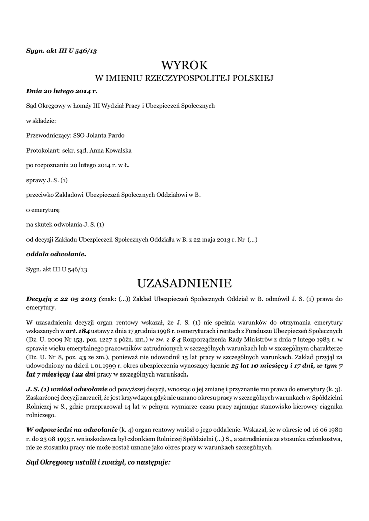 Sygn. akt III U 546/13 WYROK W IMIENIU RZECZYPOSPOLITEJ POLSKIEJ Dnia 20 lutego 2014 r. Sąd Okręgowy w Łomży III Wydział Pracy i Ubezpieczeń Społecznych w składzie: Przewodniczący: SSO Jolanta Pardo Protokolant: sekr. sąd. Anna Kowalska po rozpoznaniu 20 lutego 2014 r. w Ł. sprawy J. S. (1) przeciwko Zakładowi Ubezpieczeń Społecznych Oddziałowi w B. o emeryturę na skutek odwołania J. S. (1) od decyzji Zakładu Ubezpieczeń Społecznych Oddziału w B. z 22 maja 2013 r. Nr (...) oddala odwołanie. Sygn. akt III U 546/13 UZASADNIENIE Decyzją z 22 05 2013 (znak: (...)) Zakład Ubezpieczeń Społecznych Oddział w B. odmówił J. S. (1) prawa do emerytury. W uzasadnieniu decyzji organ rentowy wskazał, że J. S. (1) nie spełnia warunków do otrzymania emerytury wskazanych w art. 184 ustawy z dnia 17 grudnia 1998 r. o emeryturach i rentach z Funduszu Ubezpieczeń Społecznych (Dz. U. 2009 Nr 153, poz. 1227 z późn. zm.) w zw. z § 4 Rozporządzenia Rady Ministrów z dnia 7 lutego 1983 r. w sprawie wieku emerytalnego pracowników zatrudnionych w szczególnych warunkach lub w szczególnym charakterze (Dz. U. Nr 8, poz. 43 ze zm.), ponieważ nie udowodnił 15 lat pracy w szczególnych warunkach. Zakład przyjął za udowodniony na dzień 1.01.1999 r. okres ubezpieczenia wynoszący łącznie 25 lat 10 miesięcy i 17 dni, w tym 7 lat 7 miesięcy i 22 dni pracy w szczególnych warunkach. J. S. (1) wniósł odwołanie od powyższej decyzji, wnosząc o jej zmianę i przyznanie mu prawa do emerytury (k. 3). Zaskarżonej decyzji zarzucił, że jest krzywdząca gdyż nie uznano okresu pracy w szczególnych warunkach w Spółdzielni Rolniczej w S., gdzie przepracował 14 lat w pełnym wymiarze czasu pracy zajmując stanowisko kierowcy ciągnika rolniczego. W odpowiedzi na odwołanie (k. 4) organ rentowy wniósł o jego oddalenie. Wskazał, że w okresie od 16 06 1980 r. do 23 08 1993 r. wnioskodawca był członkiem Rolniczej Spółdzielni (...) S., a zatrudnienie ze stosunku członkostwa, nie ze stosunku pracy nie może zostać uznane jako okres pracy w warunkach szczególnych. Sąd Okręgowy ustalił i zważył, co następuje: Odwołanie nie zasługiwało na uwzględnienie. Bezspornym było, iż J. S. (1) (ur. (...)) 26 03 2013 r. 01.2013 r. złożył wniosek o emeryturę. W wyniku jego rozpoznania organ rentowy uznał za udowodniony łączny okres ubezpieczenia wnioskodawcy wynoszący 25 lat 10 miesięcy i 17 dni, w tym 7 lat 7 miesięcy i 22 dni pracy w warunkach szczególnych. Do pracy w warunkach szczególnych zaliczono okres od 03 11 1975 do 07 11 1977r. [ Przedsiębiorstwo (...) Oddział w Ł. P. w G. ] , od 09 11 1977 r. do 14 06 1980 r.[ Zakłady (...) w G.], od 24 08 1994 r. do 03 07 1995 r.[ (...) s.c C. i J. S. (2) w K.] i od 06 10 1996 r. do 01 01 1999 r. [ (...) s.c C. i J. S. (2) w K.]. Zaskarżoną obecnie decyzją z 22.05.2013 r. organ rentowy odmówił mu prawa do emerytury uznając, iż nie udowodnił on 15 lat pracy w warunkach szczególnych. Powyższe okoliczności ustalono na podstawie akt ZUS. Prawo do emerytury w niższym wieku emerytalnym z tytułu pracy w warunkach szczególnych lub w szczególnym charakterze przewidziane jest w art. 32 ustawy z dnia l7 grudnia l998 r., o emeryturach i rentach z Funduszu Ubezpieczeń Społecznych (tekst jedn. Dz. U. z 2009 r. Nr 153, poz. 1227 ze zm.) zawartym w rozdziale 2 działu II ustawy dotyczącym urodzonych przed 1 stycznia 1949 r. Ustawa ta zawiera w rozdziale 2 działu X szczególną regulację przejściową dotyczącą niektórych ubezpieczonych zatrudnionych w szczególnych warunkach lub w szczególnym charakterze przed dniem 1 stycznia 1999 r. Mianowicie w art. 184 ustawy zostało przewidziane prawo do wcześniejszej emerytury dla zamkniętej grupy ubezpieczonych urodzonych po dniu 31 grudnia 1948 r., którzy do końca 1998 r. spełnili ustawowo określone wymogi, tj. 1. osiągnęli wiek emerytalny przewidziany w art. 32, 33, 39 i 40 ustawy; 2. w dniu wejścia w życie ustawy osiągnęli okres zatrudnienia w szczególnych warunkach lub w szczególnym charakterze wymaganym w przepisach dotychczasowych do nabycia prawa do emerytury w wieku niższym niż 60 lat - dla kobiet i 65 lat - dla mężczyzn oraz okres składkowy i nieskładkowy, o którym mowa w art. 27 (wynoszący co najmniej 20 lat dla kobiet i 25 lat dla mężczyzn). Ponadto emerytura ta przysługuje pod warunkiem nieprzystąpienia do otwartego funduszu emerytalnego albo złożenia wniosku o przekazanie środków zgromadzonych na rachunku w otwartym funduszu emerytalnym, za pośrednictwem Zakładu, na dochody budżetu państwa (ust. 2). Rodzaje prac lub stanowisk oraz warunki, na podstawie których osobom spełniającym powyższe warunki przysługuje prawo do emerytury, ustala się zgodnie z art. 32 ust. 4 ustawy na podstawie przepisów dotychczasowych. W rozpoznawanej sprawie wspomniane przepisy dotychczasowe to rozporządzenie Rady Ministrów z dnia 7 lutego 1983 r. w sprawie wieku emerytalnego pracowników zatrudnionych w szczególnych warunkach lub w szczególnym charakterze (Dz. U. Nr 8, poz. 43 ze zm.). Zgodnie z § 4 tego Rozporządzenia pracownik, który wykonywał prace w szczególnych warunkach, wymienione w wykazie A, nabywa prawo do emerytury, jeżeli spełnia łącznie następujące warunki: osiągnął wiek emerytalny wynoszący: 55 lat dla kobiet i 60 lat dla mężczyzn oraz ma wymagany okres zatrudnienia, w tym co najmniej 15 lat pracy w szczególnych warunkach. Powodzenie odwołania J. S. (1) zależało od wykazania przez niego, iż spełnia ostatni z przedstawionych wyżej warunków tj. posiada co najmniej 15-letni okresu pracy w szczególnych warunkach. Biorąc pod uwagę uznane przez organ rentowy 7 lat 7 miesięcy i 22 dni dni okresów pracy w warunkach szczególnych musiał wykazać, iż legitymuje się jeszcze 7 latami i 4 miesiącem i 8 dniami pracy w takich warunkach. Spór dotyczył okresu pracy odwołującego się w Rolniczej Sp