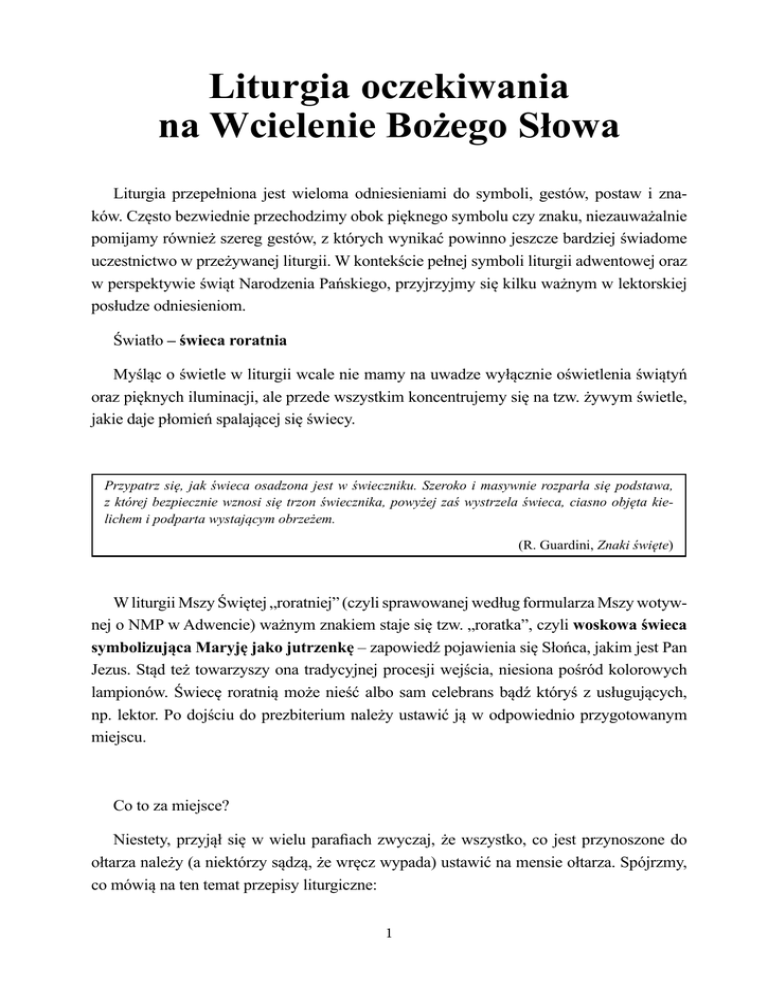 Liturgia oczekiwania na Wcielenie Bożego Słowa Liturgia przepełniona jest wieloma odniesieniami do symboli, gestów, postaw i znaków. Często bezwiednie przechodzimy obok pięknego symbolu czy znaku, niezauważalnie pomijamy również szereg gestów, z których wynikać powinno jeszcze bardziej świadome uczestnictwo w przeżywanej liturgii. W kontekście pełnej symboli liturgii adwentowej oraz w perspektywie świąt Narodzenia Pańskiego, przyjrzyjmy się kilku ważnym w lektorskiej posłudze odniesieniom. Światło – świeca roratnia Myśląc o świetle w liturgii wcale nie mamy na uwadze wyłącznie oświetlenia świątyń oraz pięknych iluminacji, ale przede wszystkim koncentrujemy się na tzw. żywym świetle, jakie daje płomień spalającej się świecy. Przypatrz się, jak świeca osadzona jest w świeczniku. Szeroko i masywnie rozparła się podstawa, z której bezpiecznie wznosi się trzon świecznika, powyżej zaś wystrzela świeca, ciasno objęta kielichem i podparta wystającym obrzeżem. (R. Guardini, Znaki święte) W liturgii Mszy Świętej „roratniej” (czyli sprawowanej według formularza Mszy wotywnej o NMP w Adwencie) ważnym znakiem staje się tzw. „roratka”, czyli woskowa świeca symbolizująca Maryję jako jutrzenkę – zapowiedź pojawienia się Słońca, jakim jest Pan Jezus. Stąd też towarzyszy ona tradycyjnej procesji wejścia, niesiona pośród kolorowych lampionów. Świecę roratnią może nieść albo sam celebrans bądź któryś z usługujących, np. lektor. Po dojściu do prezbiterium należy ustawić ją w odpowiednio przygotowanym miejscu. Co to za miejsce? Niestety, przyjął się w wielu parafiach zwyczaj, że wszystko, co jest przynoszone do ołtarza należy (a niektórzy sądzą, że wręcz wypada) ustawić na mensie ołtarza. Spójrzmy, co mówią na ten temat przepisy liturgiczne: 1 OWMR 306. Na mensie ołtarza można umieszczać tylko te przedmioty, które są konieczne przy sprawowaniu Mszy świętej. (…) W sposób dyskretny można w razie potrzeby umieścić na ołtarzu przyrządy wzmacniające głos kapłana. OWMR 307. Świeczniki, które są wymagane przy poszczególnych czynnościach liturgicznych dla podkreślenia szacunku i uroczystego charakteru celebracji, należy umieścić na ołtarzu lub obok niego, uwzględniając strukturę ołtarza i prezbiterium. OWMR 308. Podobnie na ołtarzu lub obok niego należy umieścić krzyż z wizerunkiem Chrystusa ukrzyżowanego, dobrze widoczny dla zgromadzonych wiernych. (…) Przez pojęcie „świeczniki” rozumieć należy tzw. świece ołtarzowe (dwie, cztery, sześć bądź siedem, kiedy liturgię sprawuje biskup), czyli świece, które palą się podczas każdej celebracji liturgicznej. Wszelkie inne świece, lampiony, znicze (w tym także świeca roratnia) nie powinny pełnić tej roli, o której mowa w powyższych zdaniach. Stąd też zadbajmy o to, aby przygotować dla nich inne odpowiednie miejsce, np. przy tzw. wieńcu adwentowym bądź adwentowej dekoracji. Przy tej okazji pojawia się równie często pytanie: Czy świecę roratnią należy zapalać jedynie podczas Mszy Świętych roratnich, czy np. również podczas niedzielnej liturgii? Skoro świeca ta jest zwyczajnym znakiem Maryi oczekującej na narodziny „Światłości świata”, to logicznym wydaje się być argument przemawiający za tym, że owe oczekiwanie towarzyszy całemu okresowi liturgicznemu, a nie jedynie Mszy Świętej roratniej. Zobaczmy, że podczas każdej Eucharystii wypowiadamy słowa w tej lub podobnej formie (zależy to od wybranej przez kapłana aklamacji po przeistoczeniu): „…i oczekujemy Twego przyjścia w chwale”. Adwent, który jest tradycyjnie nazywany „czasem oczekiwania”, przeżywamy zatem w pewien sposób, podczas każdej liturgii. Skoro więc świeca roratnia jest szczególnie eksponowana w czasie Mszy Świętej wotywnej o NMP w Adwencie (roraty), nic nie stoi na przeszkodzie, aby jej żywe światło przypominało nam o tych szczególnych obietnicach, zapowiadanych przez proroków, podczas każdej adwentowej celebracji. Ewangeliarz – A Słowo ciałem się stało i mieszkało między nami… Kolejną piękną symbolikę liturgicznych znaków odczytać możemy dzięki używanej podczas szczególnie uroczystych celebracji, księdze Ewangelii (tzw. ewangeliarz). Księga ta jest często bogato zdobionym zbiorem czterech ksiąg Ewangelii, podzielonych na odpowiednie perykopy. Ewangeliarz jest zatem liturgiczną księgą, szczególnie eksponowaną 2 podczas procesji wejścia. Diakon (bądź lektor) niesie uniesioną na wysokości swoich oczu księgę (bezpośrednio przed głównym celebransem bądź przed kapłanami koncelebrującymi) i składa ją na mensie ołtarza. Dlaczego akurat tam, a nie na ambonie, z której Ewangelia jest odczytywana? Aby zrozumieć motyw składania Ewangeliarza na ołtarzu tak, aby wprost przylegał do mensy (czyli nie na podstawce, podpórce), zwróćmy uwagę na jakże istotną tajemnicę wiary, celebrowaną w szczególny sposób podczas okresu Narodzenia Pańskiego – tajemnicę Wcielenia. Nie bez powodu w liturgii rzymskiej istnieją dwa momenty w ciągu całego roku liturgicznego, kiedy podczas wymawianego Credo, oddajemy w szczególny sposób cześć tajemnicy Wcielenia Syna Bożego, przyklękając na słowa: „…i za sprawą Ducha Świętego przyjął ciało z Maryi Dziewicy i stał się człowiekiem”. Czynimy tak w uroczystość Zwiastowania Pańskiego (25 marca) i w uroczystość Narodzenia Pańskiego (25 grudnia). Warto tu przypomnieć, że w inne dni, kiedy w liturgii stosujemy Wyznanie Wiary, podczas ww. słów, wykonujemy głęboki skłon. Wszystko po to, aby wyróżnić tę jakże istotną tajemnicę, w której odwieczne Słowo Boga (Logos), przyjmuje ludzką naturę. Gdy głęboka cisza zalegała wszystko, a noc w swoim biegu dosięgała połowy, wszechmocne Twe słowo z nieba, z królewskiej stolicy (…), runęło pośrodku zat