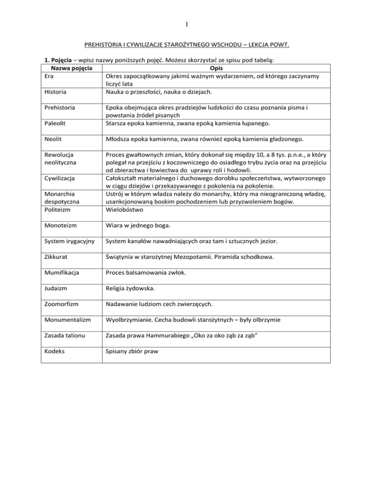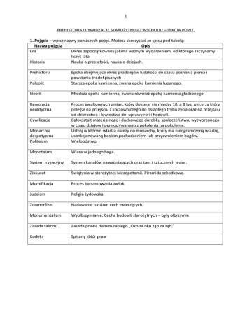 1 PREHISTORIA I CYWILIZACJE STAROŻYTNEGO WSCHODU – LEKCJA POWT. 1. Pojęcia – wpisz nazwy poniższych pojęd. Możesz skorzystad ze spisu pod tabelą: Nazwa pojęcia Opis Era Okres zapoczątkowany jakimś ważnym wydarzeniem, od którego zaczynamy liczyd lata Historia Nauka o przeszłości, nauka o dziejach. Prehistoria Paleolit Epoka obejmująca okres pradziejów ludzkości do czasu poznania pisma i powstania źródeł pisanych Starsza epoka kamienna, zwana epoką kamienia łupanego. Neolit Młodsza epoka kamienna, zwana również epoką kamienia gładzonego. Rewolucja neolityczna Monarchia despotyczna Politeizm Proces gwałtownych zmian, który dokonał się między 10, a 8 tys. p.n.e., a który polegał na przejściu z koczowniczego do osiadłego trybu życia oraz na przejściu od zbieractwa i łowiectwa do uprawy roli i hodowli. Całokształt materialnego i duchowego dorobku społeczeostwa, wytworzonego w ciągu dziejów i przekazywanego z pokolenia na pokolenie. Ustrój w którym władza należy do monarchy, który ma nieograniczoną władzę, usankcjonowaną boskim pochodzeniem lub przyzwoleniem bogów. Wielobóstwo Monoteizm Wiara w jednego boga. System irygacyjny System kanałów nawadniających oraz tam i sztucznych jezior. Zikkurat Świątynia w starożytnej Mezopotamii. Piramida schodkowa. Mumifikacja Proces balsamowania zwłok. Judaizm Religia żydowska. Zoomorfizm Nadawanie ludziom cech zwierzęcych. Monumentalizm Wyolbrzymianie. Cecha budowli starożytnych – były olbrzymie Zasada talionu Zasada prawa Hammurabiego „Oko za oko ząb za ząb” Kodeks Spisany zbiór praw Cywilizacja 2 2. Osiągnięcia cywilizacji starożytnych – w poniższej tabeli wypisz największe osiągnięcia cywilizacji starożytnego Egiptu i Mezopotamii Egipt Mezopotamia Pismo Hieroglificzne. Materiałem na którym Klinowe. Materiałem na którym pisano pisano był papirus. była glina, często później wypalana. Kalendarz Słoneczny Księżycowy Astronomia Matematyka Podzielili rok na 365 dni Potrafili obliczyd zadmienie Słooca i Księżyca. Znali najbliższe planety. Potrafili obliczyd pole powierzchni i objętośd brył geometrycznych. Znali pierwiastki kwadratowe i sześcienne. Stworzyli system dziesiętny. Medycyna Znali się na chirurgii – potrafili składad złamane kości. Potrafili przeprowadzid trepanację czaszki. Budowle Budowali monumentalne budowle z kamienia – świątynie. Potrafili zbudowad wielkie piramidy, które pełniły funkcję grobowców Podstawowym budulcem był kamieo, często pokrywany płaskorzeźbami lub hieroglifami. Hydrotechnika Stworzyli system irygacyjny – dostarczali wodę na dalej położone pola. Rzeźba Malarstwo Rzemiosło Technika Monumentalna, wykonana często w kamieniu. Przedstawiała faraonów, bogów itp. Oprócz tego odlewano figurki w metalu. Do grobowców składano małe drewniane figurki lub gliniane. Pasmowe, stanowiło element zdobniczy komór grobowych. Łączono je z hieroglifami. Stosowano w nim określony kanon: wielkośd postaci zależała od jej miejsca w hierarchii społecznej, twarz i stopy były ukazywane z profilu podczas gdy reszta ciała z przodu. Na bardzo wysokim poziomie kamieniarstwo, jubilerstwo, wytop metali – złota, miedzi, brązu. Potrafili wytwarzad szkło. Wydobywanie olbrzymich bloków Podzielili dobę na 24 godziny, a godzinę na 60 minut, minutę na 60 sekund Potrafili obliczyd zadmienie Słooca i Księżyca. Znali najbliższe planety. Potrafili obliczyd pole powierzchni i objętośd brył geometrycznych. Znali pierwiastki kwadratowe i sześcienne. Stworzyli system sześd dziesiętny. Znali liczbę 0. Stwierdzili, że kąt ma 360 ° Stosowali ziołolecznictwo. Potrafili składad złamane kości. Budowali monumentalne budowle z cegły – świątynie i pałace. Jednym z największych osiągnięd były ogrody Semiramidy – ogrody na tarasach. Podstawowym budulcem była wypalana cegła pokryta kolorową polichromią. Stworzyli system irygacyjny – sied kanałów oraz tam powstrzymujących powódź. Bardzo często stosowano kamienne płaskorzeźby, które przedstawiały sceny z życia społeczności, upamiętniały wielkie podboje czy władców. Kamienne reliefy ozdabiały ściany pałaców w Asyrii. Na bardzo wysokim poziomie ceramika, jubilerstwo, ozdabianie elementów drewnianych, wytop metali – złota, miedzi, brązu. Wynaleźli koło garncarskie i 3 kamiennych w kamieniołomach wyłącznie z użyciem brązowych i kamiennych narzędzi. Transport wielkich bloków kamiennych na duże odległości. Podnoszenie ciężkich bloków na duże wysokości przy użyciu bloczków i lin. Potrafili dostarczad wodę na wyżej położone pola. transportowe. Potrafili budowad wspaniałe fortyfikacje, bramy, wieże, zikkuraty. 3. Podpisz poniższe zdjęcia : Cywilizacja egipska Na zdjęciu przedstawiono pylony przed wejściem do świątyni Cywilizacja egipska Na zdjęciu przedstawiono piramidy w Gizie Cywilizacja mezopotamska Na zdjęciu przedstawiono stellę z kodeksem Hammurabiego Cywilizacja mezopotamska Na zdjęciu przedstawiono bramę Isztar z Babilonu Cywilizacja mezopotamska Na zdjęciu przedstawiono zikkurat Cywilizacja egipska Na zdjęciu przedstawiono maskę z grobowca Tutenchamona 4 Cywilizacja indyjska Na zdjęciu przedstawiono posąg Buddy Cywilizacja chioska Na zdjęciu przedstawiono mur chioski Cywilizacja indyjska Na zdjęciu przedstawiono cytadelę z basenem w jednym z miast cywilizacji Indusu. Cywilizacja chioska Na zdjęciu przedstawiono terakotową armię c grobowca cesarza Szy Huang Ti 4. Uczeo powinien umied wykonad polecenia na mapie MAPA: wskaż obszar Żyznego Półksiężyca wskaż na mapie rzeki, nad którymi powstały najstarsze cywilizacje i wpisz ich nazwy wskaż Mezopotamię (Sumer, Babilonię, Asyrię), Egipt, Palestynę, Fenicję, Syrię, Persję, Chiny, cywilizację Indusu 5. Porównaj politeizm i judaizm uwzględniając następujące informacje: (1) W ilu bogów wierzono? Jak się nazywa