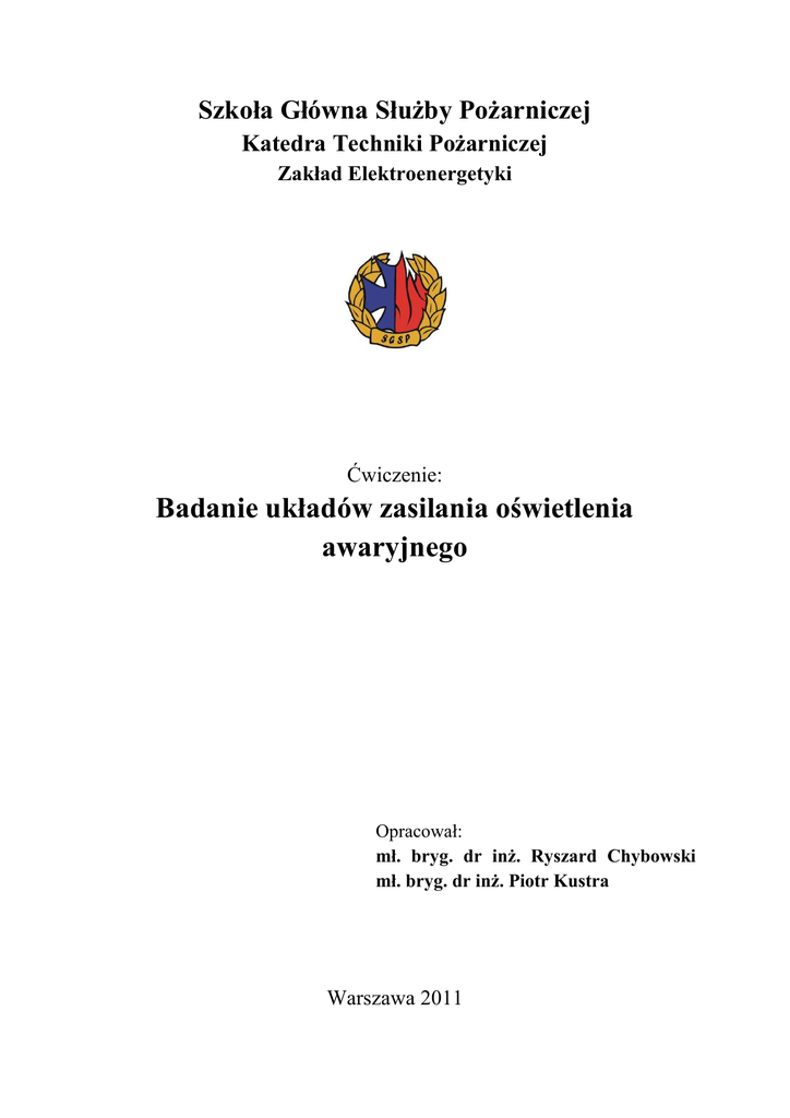 Szkoła Główna Służby Pożarniczej Katedra Techniki Pożarniczej Zakład Elektroenergetyki Ćwiczenie: Badanie układów zasilania oświetlenia awaryjnego Opracował: mł. bryg. dr inż. Ryszard Chybowski mł. bryg. dr inż. Piotr Kustra Warszawa 2011 2 Badanie układów zasilania oświetlenia awaryjnego Celem ćwiczenia jest zapoznanie studentów z rodzajami oświetlenia awaryjnego, rodzajami opraw oświetlenia awaryjnego, rodzajami zasilania w energię elektryczną tych opraw oraz wymaganiami stawianymi oprawom i zasilaniu ich w energię elektryczną. Rozwój elektroenergetyki umożliwił całkowite przejście oświetlenia sztucznego z innych rodzajów np. łuczywo, lampa naftowa, lampa gazowa itp. na oświetlenie elektryczne. Oświetlenie towarzyszące człowiekowi można podzielić na podstawowe związane z jego działalnością wytwórczą i odpoczynkiem oraz awaryjne przewidziane do stosowania podczas zaniku zasilania oświetlenia podstawowego. W związku z powyższym oprawy oświetlenia awaryjnego są zasilane ze źródła niezależnego od źródła zasilania oświetlenia podstawowego. Oświetlenie awaryjne jest ogólnym określeniem kilku specyficznych odmian oświetlenia pokazanych na rys.1. Rys. 1. Odmiany oświetlenia awaryjnego według [1]. Zgodnie normą [1] oświetlenie awaryjne dzieli się na oświetlenia: • ewakuacyjne, umożliwiające identyfikację i wykorzystanie drogi ewakuacyjnej, • bezpieczeństwa, zapewniające bezpieczeństwo osobom zatrudnionym niebezpiecznych stanowiskach pracy, na Oświetlenie awaryjne jest to rodzaj oświetlenia, które uruchamia się we właściwym czasie w przypadku zaniku oświetlenia podstawowego Dzieli się je na dwie grupy jak wspomniano powyżej na oświetlenia ewakuacyjne i zapasowe. Oświetlenie drogi ewakuacyjnej jest oświetleniem niezbędnym do oświetlenia dróg ewakuacyjnych w określonym czasie przy minimalnym natężeniu światła, tak, aby umożliwić bezpieczne opuszczenie zagrożonych pomieszczeń lub obiektu, oraz łatwe zlokalizowanie i użycie sprzętu pożarowego i sprzętu bezpieczeństwa. Oświetlenie znaków ewakuacyjnych najczęściej stosuje się do oświetlenia i oznaczenia wyjść ewakuacyjnych i wskazania na nie. Według przepisów w każdym miejscu drogi ewakuacyjnej musi być widoczny, co najmniej jeden oświetlony znak ewakuacyjny, a jeśli to wystarczy muszą być, co najmniej oznaczone wejścia i wyjścia ewakuacyjne. Tego rodzaju oświetlenie ma za zadanie podświetlenie znaków ewakuacyjnych w celu lepszej ich widoczności i ewentualnie może służyć do minimalnego oświetlenia dróg ewakuacyjnych. 3 Oświetlenie strefy otwartej jest to awaryjne oświetlenie ewakuacyjne stosowane w celu umożliwiające właściwe zakończenie działań w sposób bezpieczny osobom działającym oraz uniknięcia paniki oraz umożliwienia dotarcia do miejsca, z którego droga ewakuacyjna może być rozpoznana. Celem oświetlenia strefy otwartej (zapobiegającego panice) jest zmniejszenie prawdopodobieństwa paniki i umożliwienie bezpiecznego ruchu ludzi w kierunku dróg ewakuacyjnych przez zapewnienie warunków widoczności umożliwiających dotarcie do miejsc, z których drogi ewakuacyjne mogą być rozpoznane. Zaleca się, aby drogi ewakuacyjne lub strefy otwarte były oświetlone w wyniku padania światła bezpośredniego na płaszczyznę roboczą jak również zaleca się oświetlenie przeszkód występujących na wysokości do 2m powyżej tej płaszczyzny. Oświetlenie strefy wysokiego ryzyka jest to awaryjne oświetlenie ewakuacyjne stosowane dla bezpieczeństwa osób biorących udział w potencjalnie niebezpiecznym procesie lub znajdujących się w potencjalnie niebezpiecznej sytuacji, osobom przebywającym w tej strefie. Oświetlenie drogi ewakuacyjnej –wymagania W przypadku dróg ewakuacyjnych o szerokości do 2m średnie natężenie oświetlenia na podłodze wzdłuż środkowej linii drogi ewakuacyjnej powinno być nie mniejsze niż 1lx a na centralnym pasie drogi obejmującym nie mniej niż połowę szerokości drogi natężenie oświetlenia powinno stanowić, co najmniej 50%podanej wartości. Z powodu obniżenia sprawności źródeł światła w okresie eksploatacji , zabrudzenia opraw i innych czynników zewnętrznych najlepiej jest projektować natężenie oświetlenia na poziomie minimum 1,25 lx przyjmując że na drodze ewakuacyjnej nie ma światła odbitego od podłóg, ścian i sufitów. Nie należy, zatem stosować do potrzeb oświetlenia ewakuacyjnego światła odbitego a jedynie bezpośrednie oświetlenie powierzchni drogi ewakuacyjnej. Przy doborze opraw oświetleniowych należy brać również pod uwagę wysokość ich montażu nad poziomem drogi ewakuacyjnej oraz sprawność (wartość skuteczności świetlnej lampy) w pracy bateryjnej. Rys. 2. Przykład rozwiązania oświetlenia drogi ewakuacyjnej. Szersze drogi ewakuacyjne mogą być traktowane, jako kilka dróg o szerokości 2m lub mogą mieć oświetlenie jak w strefach otwartych (zapobiegających panice). 4 Stosunek maksymalnego natężenia oświetlenia do minimalnego natężenia oświetlenia wzdłuż centralnej linii drogi ewakuacyjnej nie powinien być większy niż 40:1. Stosunek min do max natężenia oświetlenia definiuje równomierność oświetlenia drogi ewakuacyjnej. Tabela 1 Zależność dopuszczalnej maksymalnej światłości oświetlenia ewakuacyjnego od wysokości umieszczenia lamp oraz rodzaju oświetlenia awaryjnego. Wysokość h umieszczenia opraw nad poziomem podłogi [m] h<2,5 2,5 ≤ h<3,0 3,0 ≤h<3,5 3,5 ≤ h<4,0 4,0≤h<4,5 h≥4,5 Maksymalna światłość Imax przy oświetleniu dróg ewakuacyjnych i stref otwartych(zapobiegających panice) [Cd] 500 900 1600 2500 3500 5000 Maksymalna światłość Imax przy oświetleniu stref wysokiego ryzyka [Cd] 1000 1800 3200 5000 7000 10000 Minimalny czas pracy oświetlenia ewakuacyjnego (pozwalający bezpiecznie opuścić zagrożoną strefę) podczas ewakuacji powinien wyn